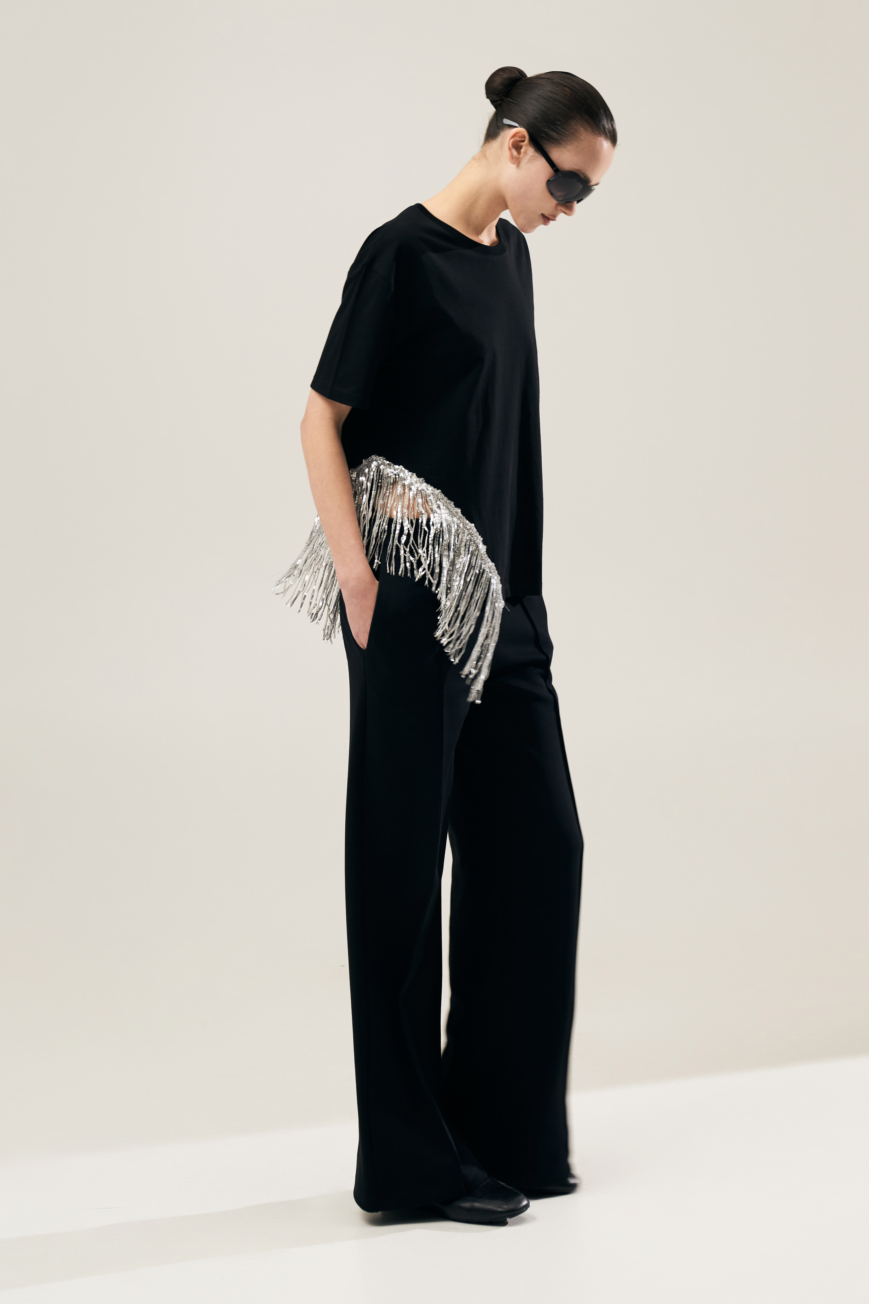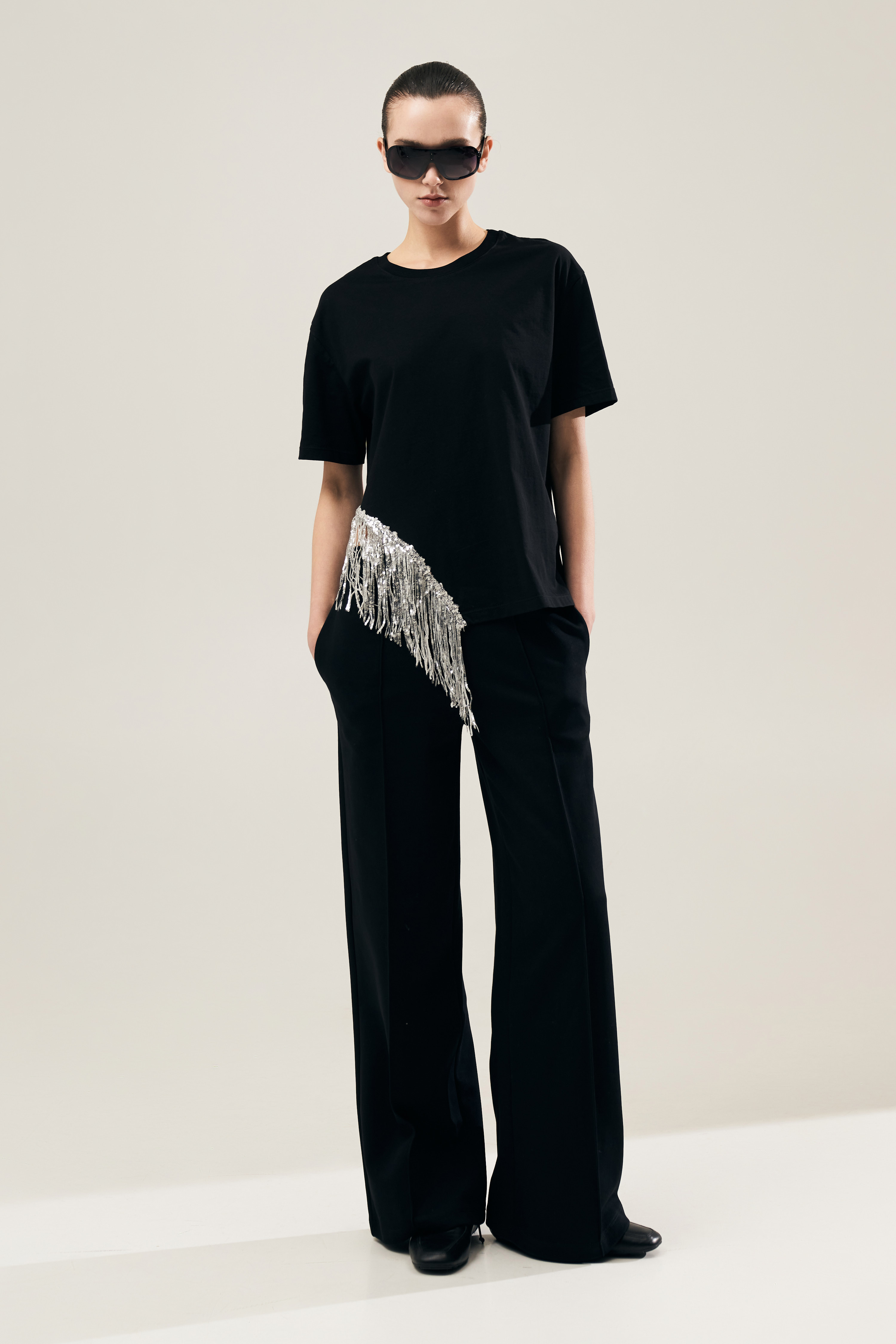 Fondo asimmetrico con applicazione di frange paillettes.