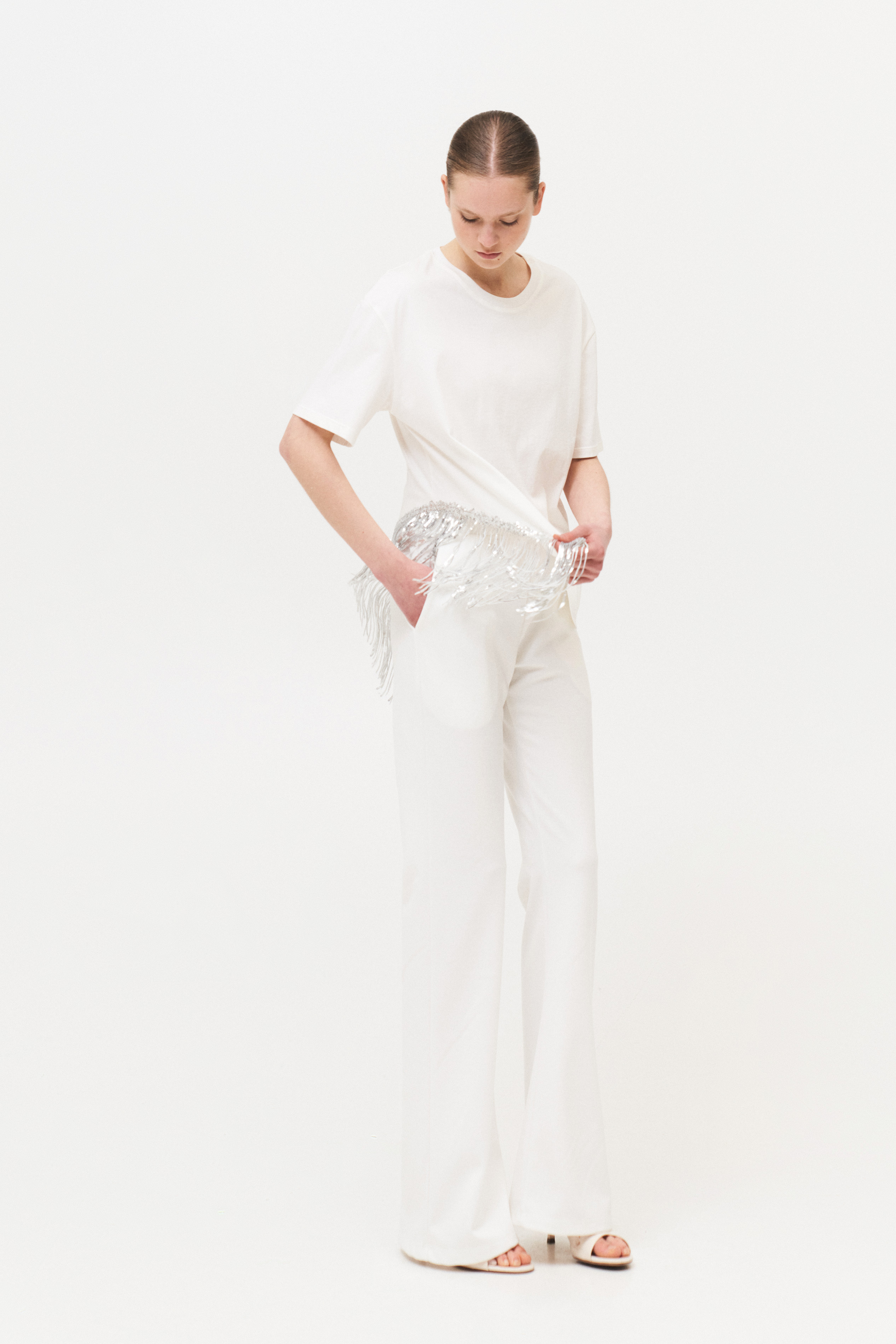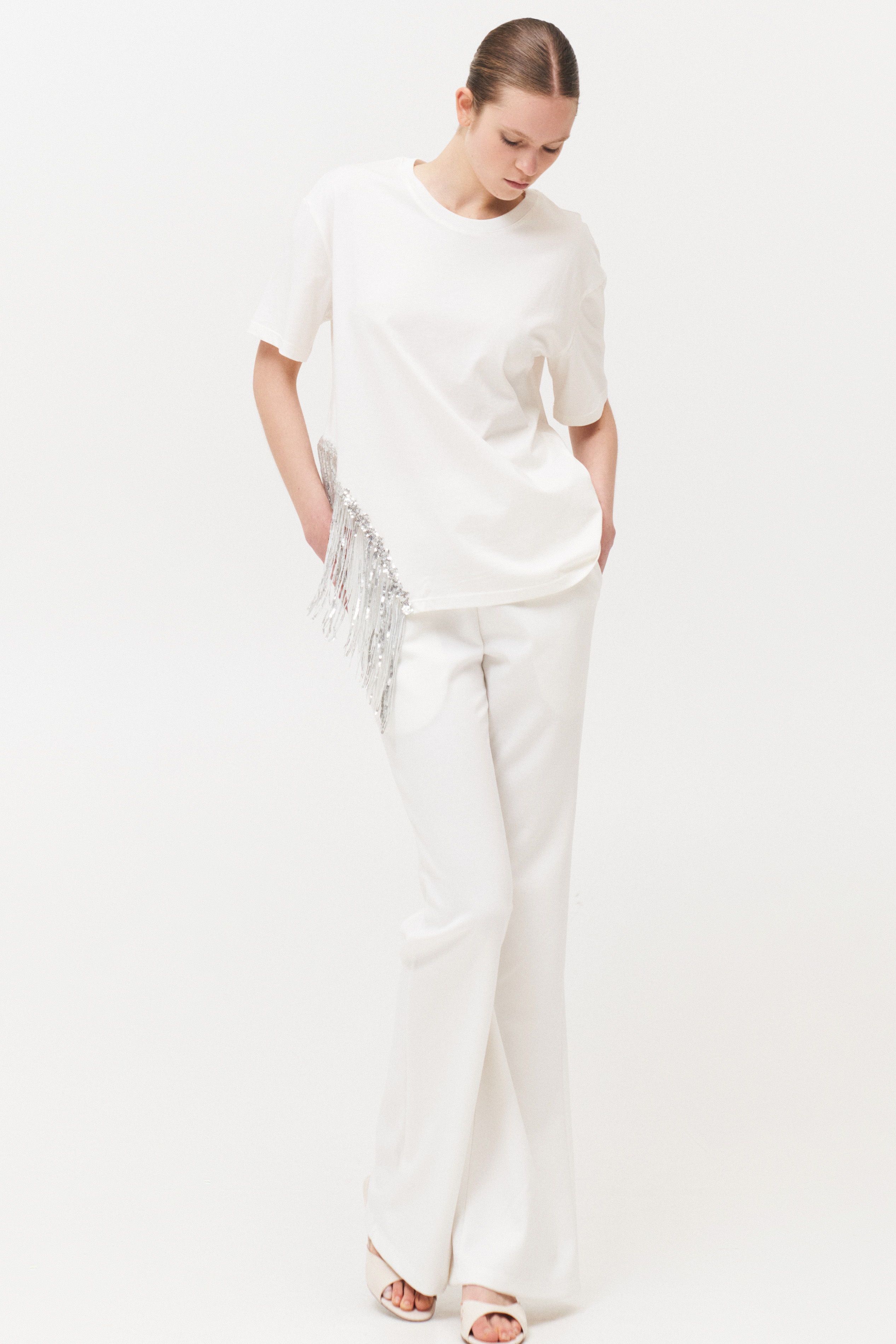 Ricamo frontale con scritta e applicazione fili decorativi.