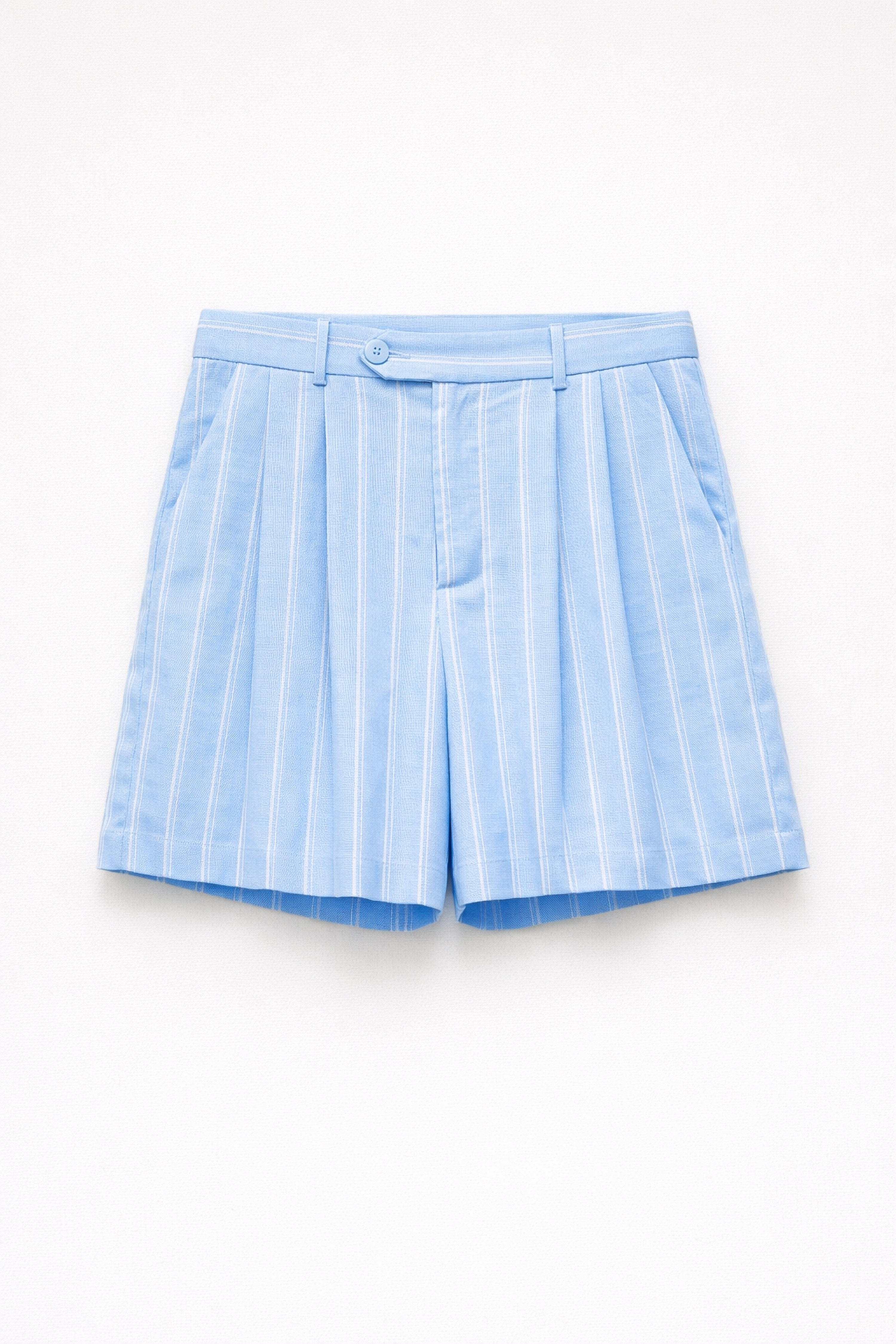 Bermuda realizzato in misto lino. Vita alta con passanti e inserto elasticizzato interno a righe. Pieghe frontali cucite. Tasche laterali e tasca applicata sul retro. Chiusura frontale con cerniera e bottone. Vestibilità regolare, disponibile in taglia S, M, L.