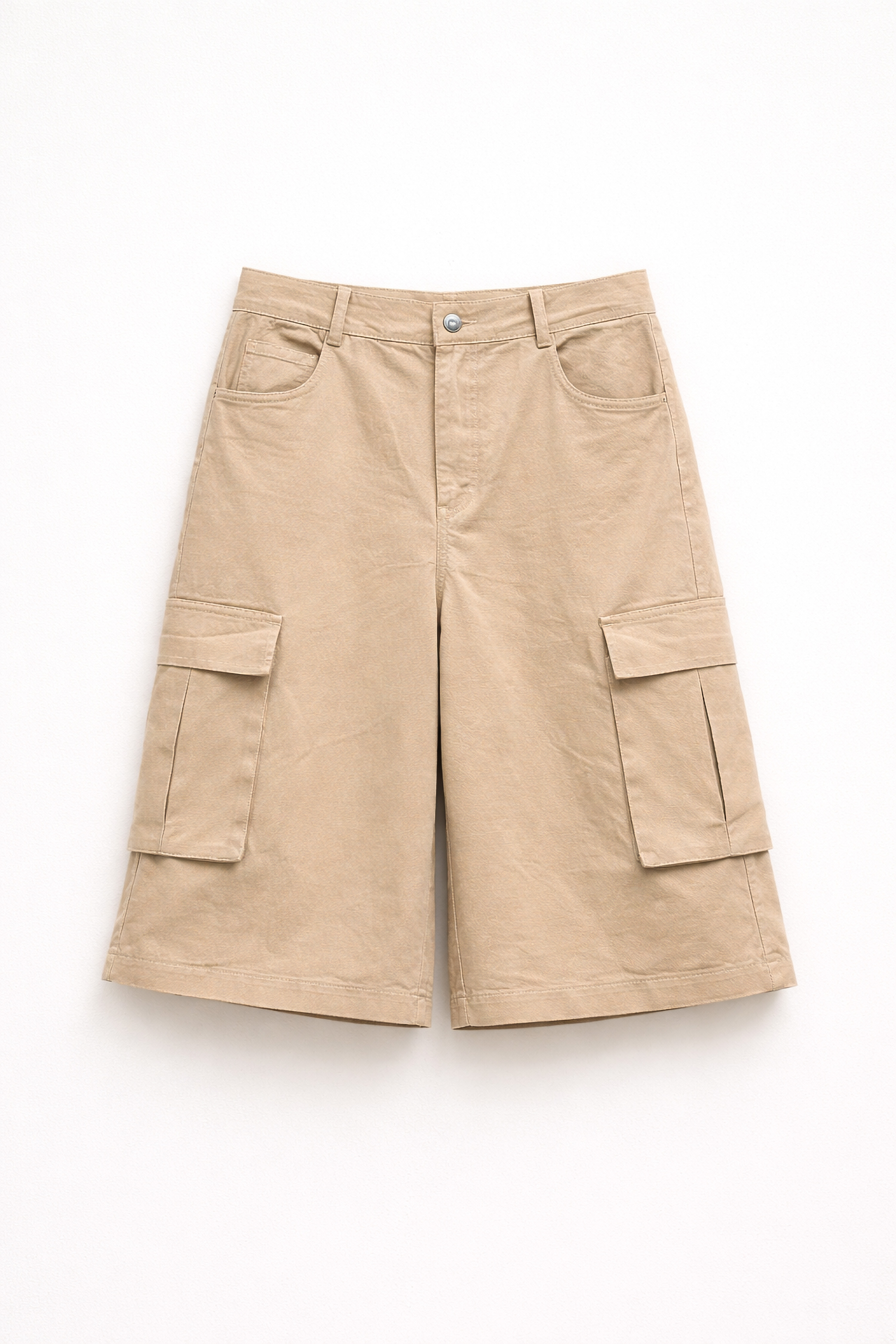 Bermuda cargo vita regolare con passanti. Tasche laterali funzionali. Tasche posteriori applicate. Maxi tasche cargo con patta sui lati. Chiusura frontale con cerniera e bottone. Vestibilità regolare, disponibile in taglia S, M, L.