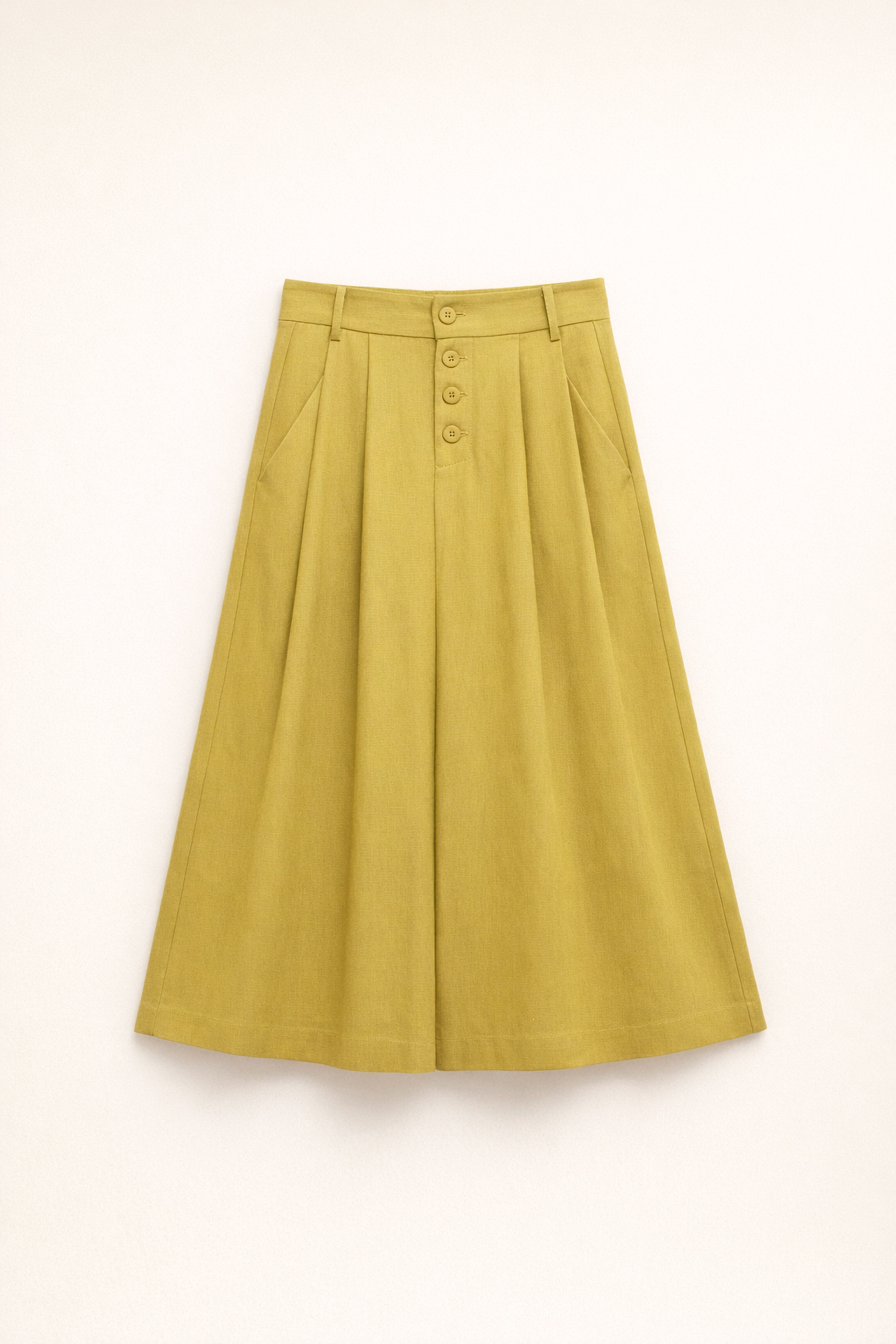 Bermuda gamba ampia in misto lino. Vita media con passanti per cintura. Pinces frontali. Tasche laterali funzionali. Tasca posteriore con patta e bottone. Vestibilità regolare, disponibile in taglia S, M, L.
