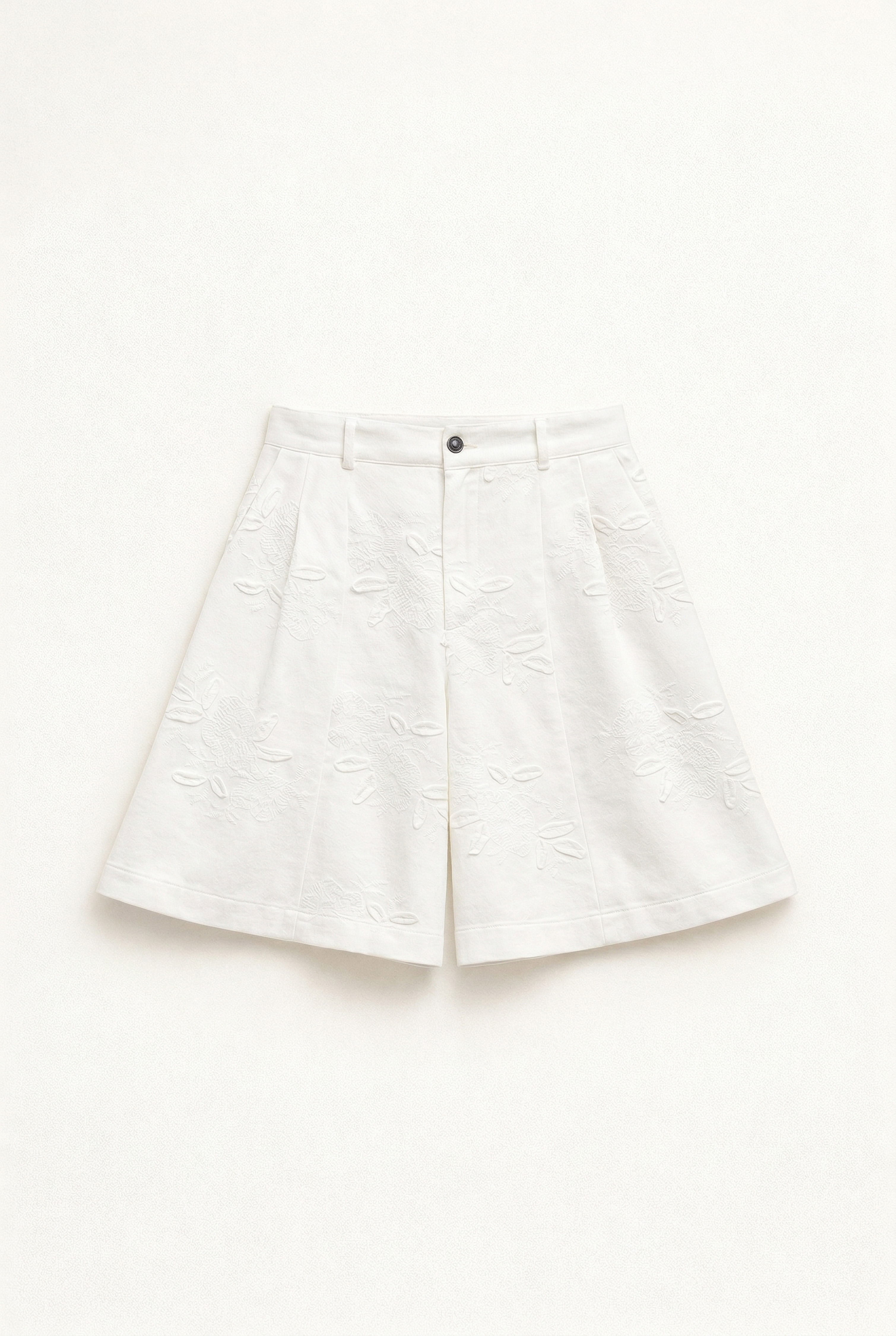 Bermuda in cotone con ricami floreali in rilievo. Vita regolare con passanti per cintura. Chiusura frontale con cerniera e bottone. Vestibilità regolare, disponibile in taglia S, M, L.
