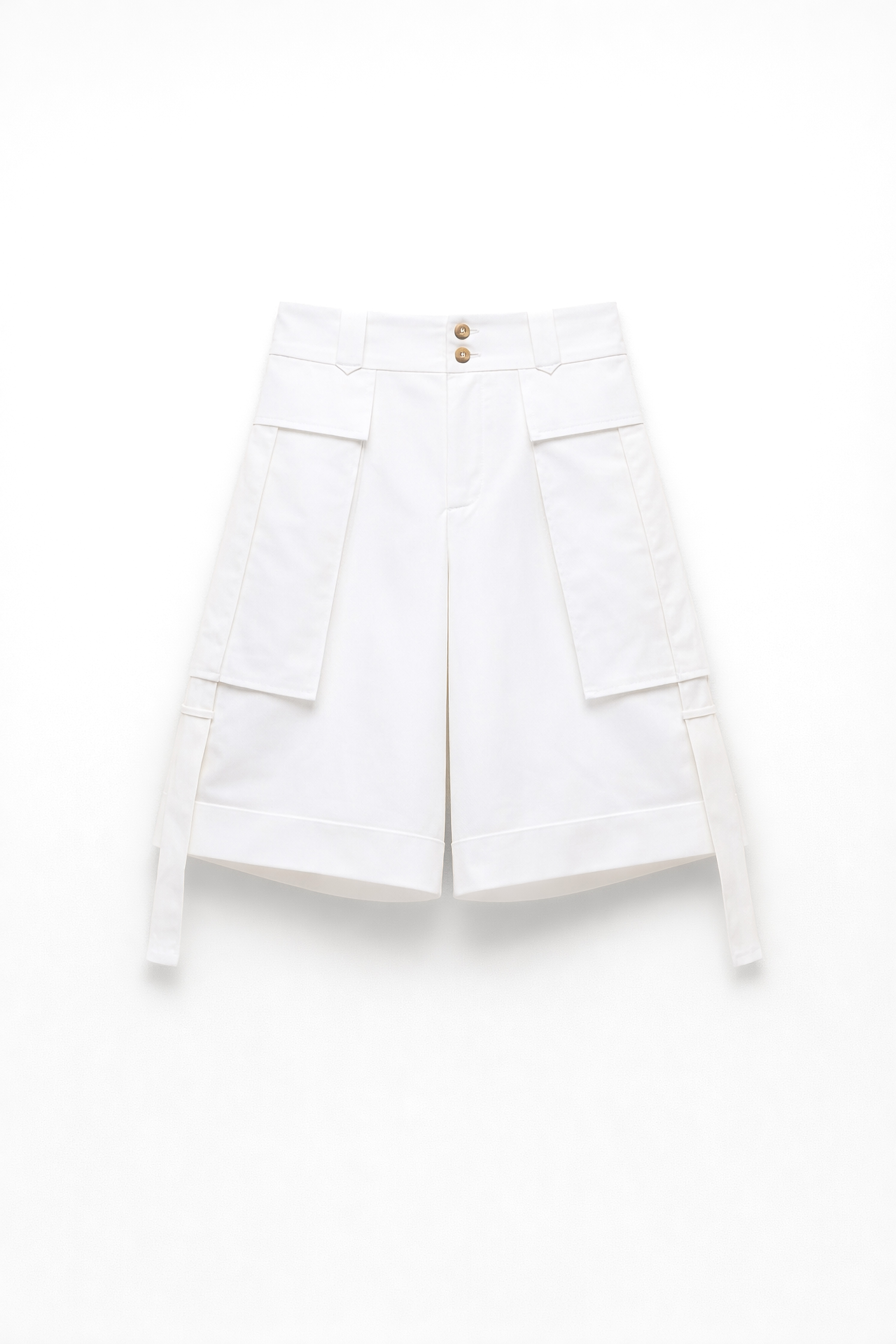 Bermuda cargo strutturato in misto cotone. Vita alta con passanti e cintura coordinata. Elastico sul retro per maggiore comfort. Tasche cargo laterali applicate con patta. Dettaglio cinturino laterali sulle tasche. Chiusura frontale con cerniera e bottoni. Vestibilità regolare, disponibile in taglia S/M, M/L.