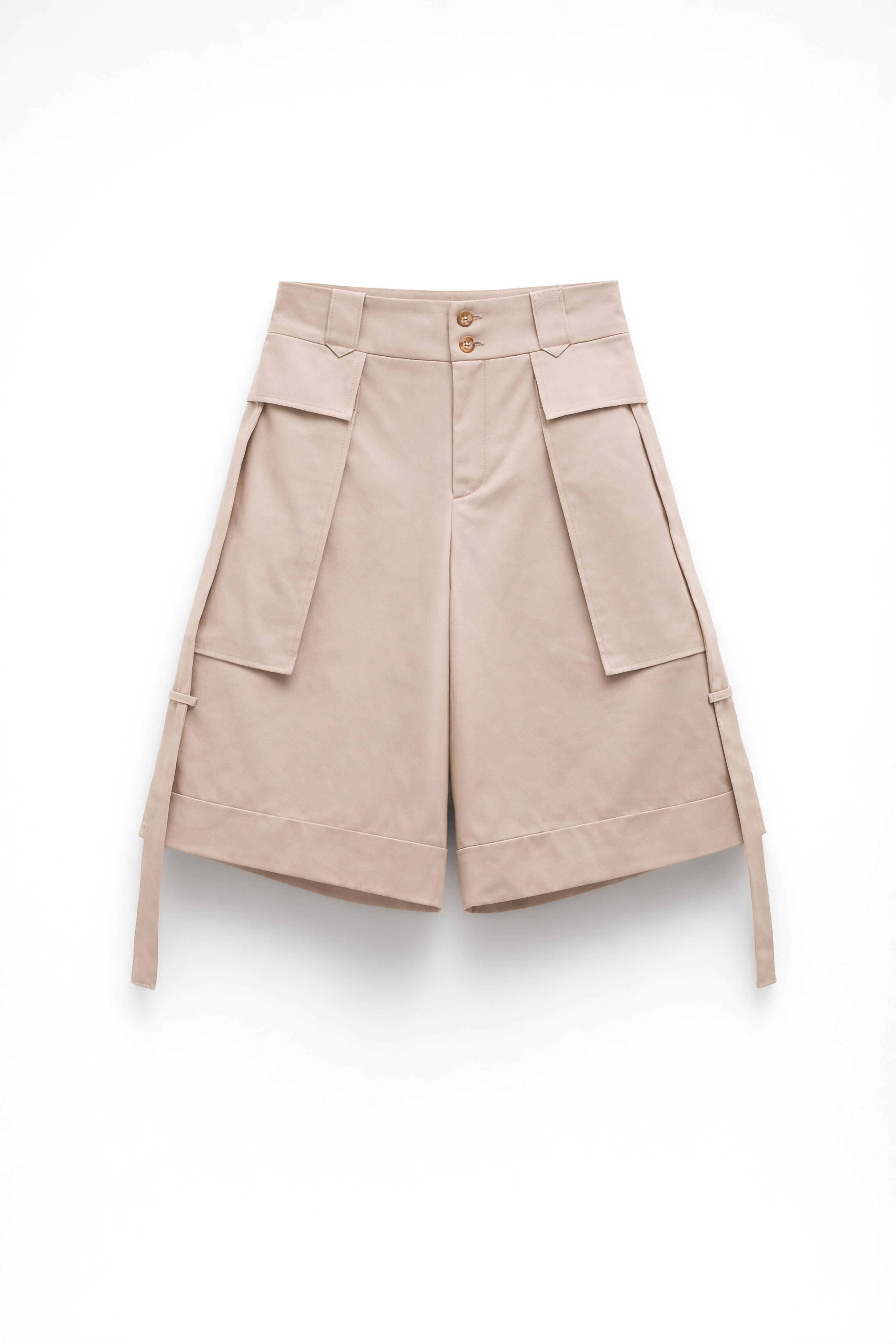 Bermuda cargo strutturato in misto cotone. Vita alta con passanti e cintura coordinata. Elastico sul retro per maggiore comfort. Tasche cargo laterali applicate con patta. Dettaglio cinturino laterali sulle tasche. Chiusura frontale con cerniera e bottoni. Vestibilità regolare, disponibile in taglia S/M, M/L.