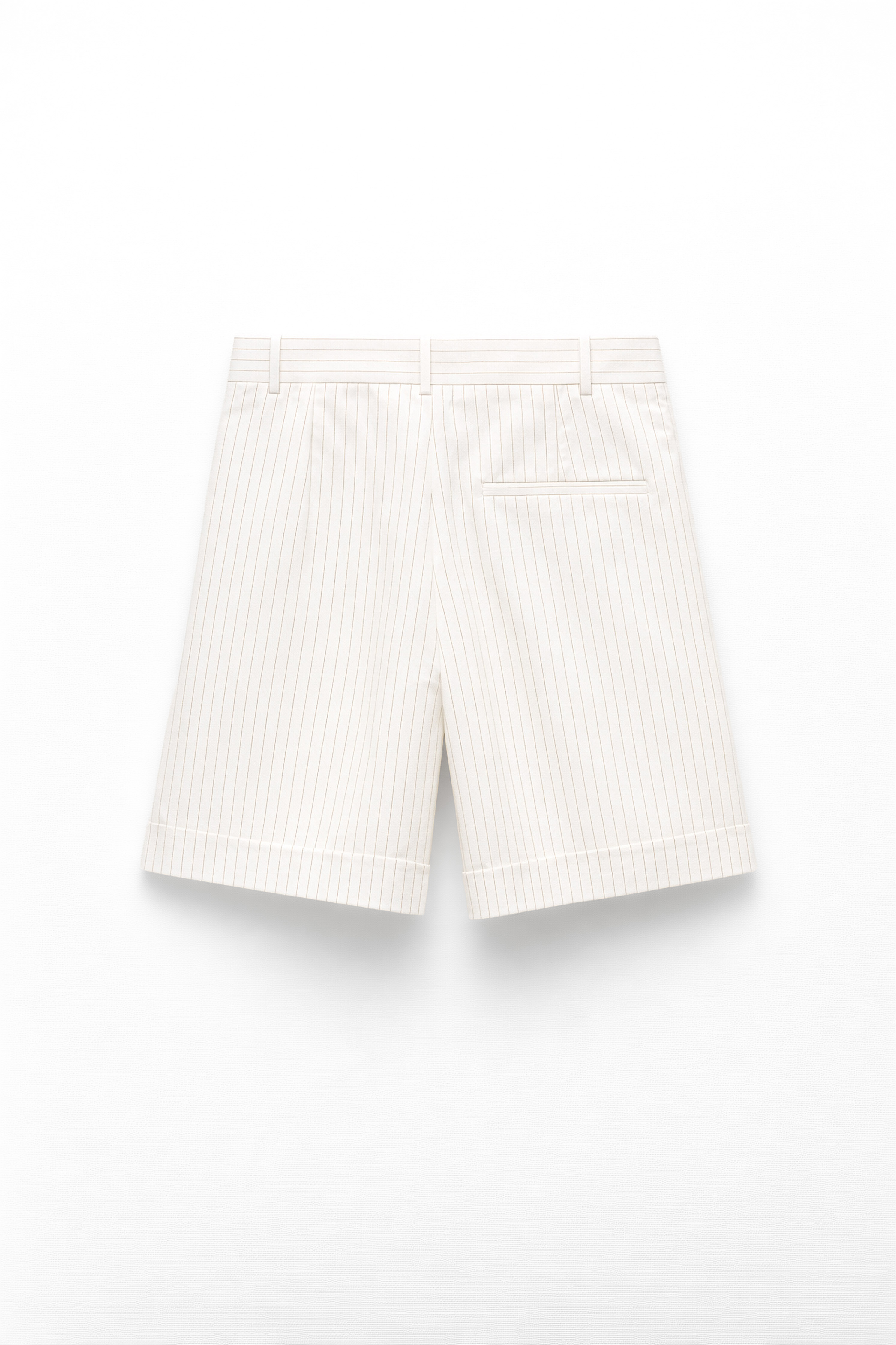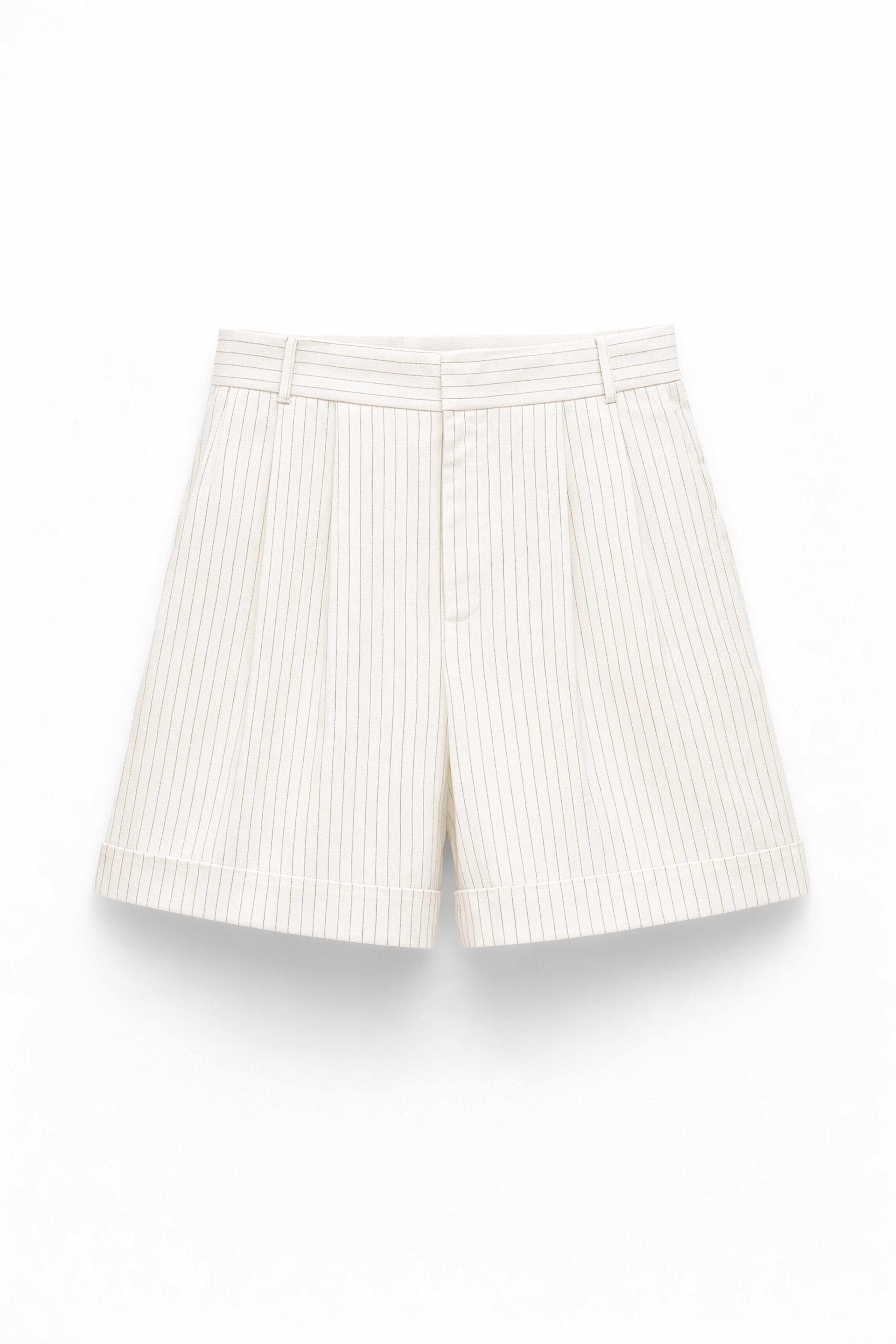 Bermuda gessato con motivo a righe sottili. Vita alta con passanti per cintura. Pinces frontali. Fondo con risvolto cucito. Tasche laterali inserite. Tasca posteriore a filetto. Chiusura frontale con cerniera, gancio e bottone. Vestibilità regolare, disponibile in taglia S, M, L.