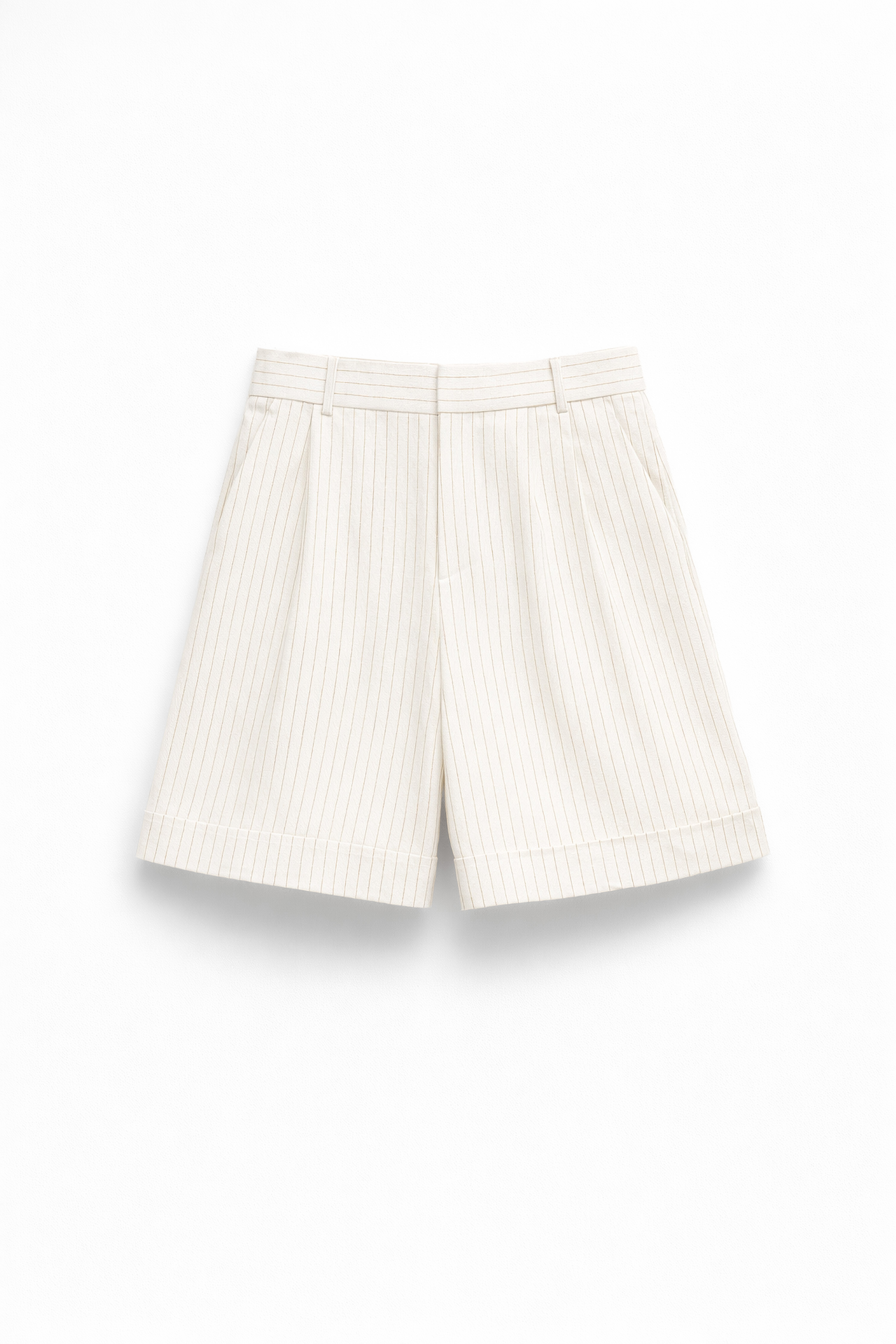 Bermuda gessato con motivo a righe sottili. Vita alta con passanti per cintura. Pinces frontali. Fondo con risvolto cucito. Tasche laterali inserite. Tasca posteriore a filetto. Chiusura frontale con cerniera, gancio e bottone. Vestibilità regolare, disponibile in taglia S, M, L.