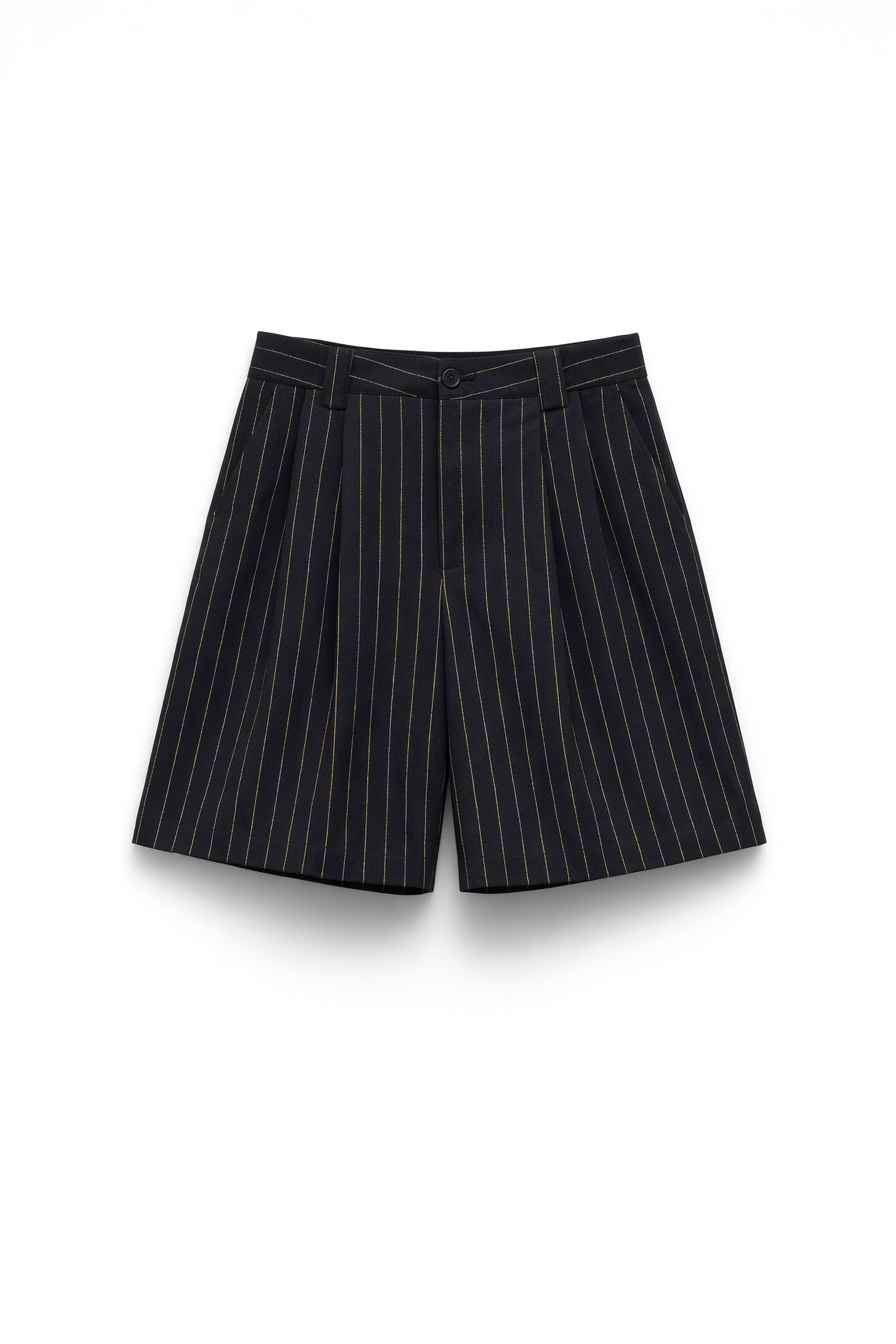 Bermuda gessato con motivo a righe sottili. Vita alta con passanti per cintura. Pinces frontali. Fondo con risvolto cucito. Tasche laterali inserite. Tasca posteriore a filetto. Chiusura frontale con cerniera, gancio e bottone. Vestibilità regolare, disponibile in taglia S, M, L.