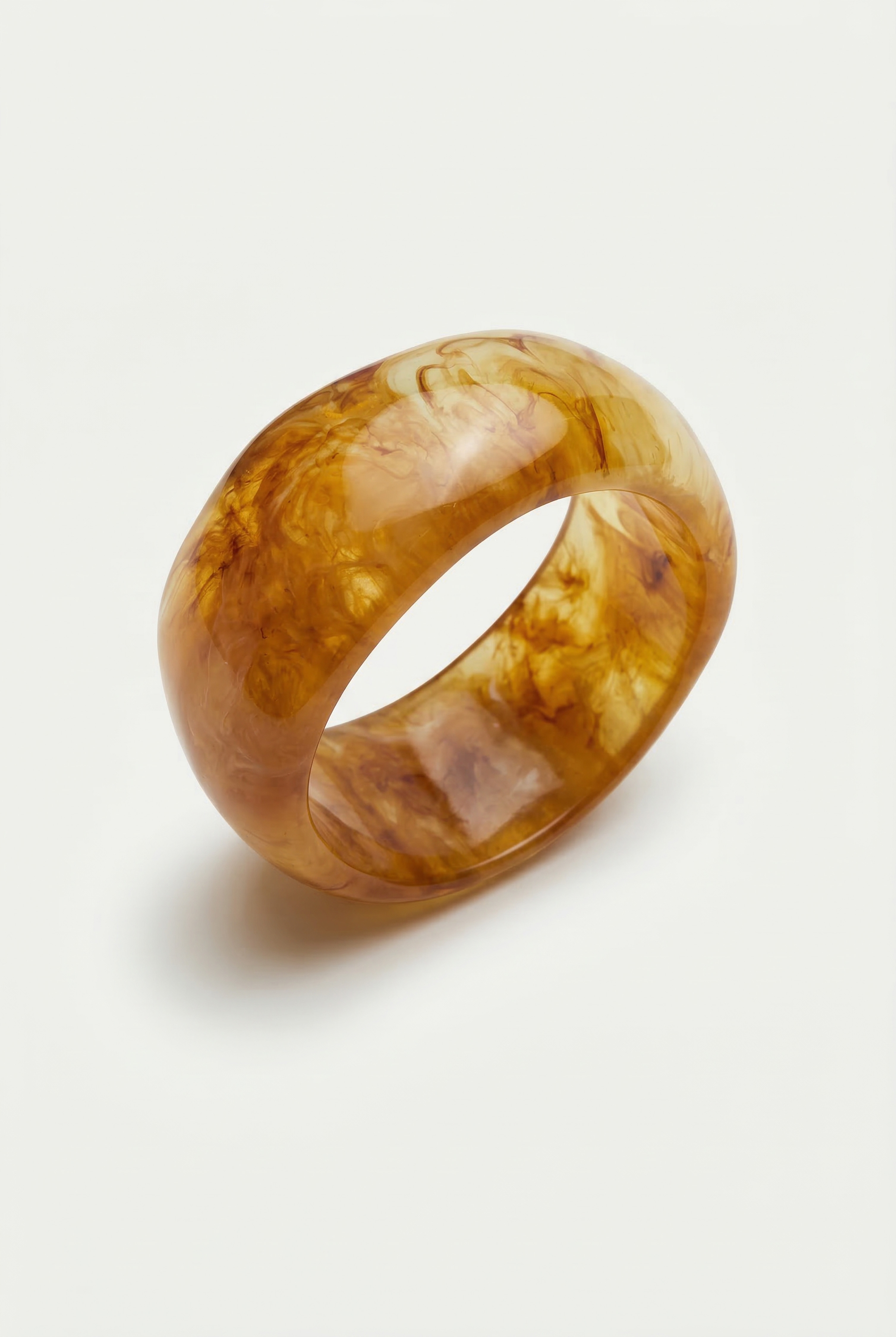 Bracciale rigido in resina con struttura ampia e bordi arrotondati.