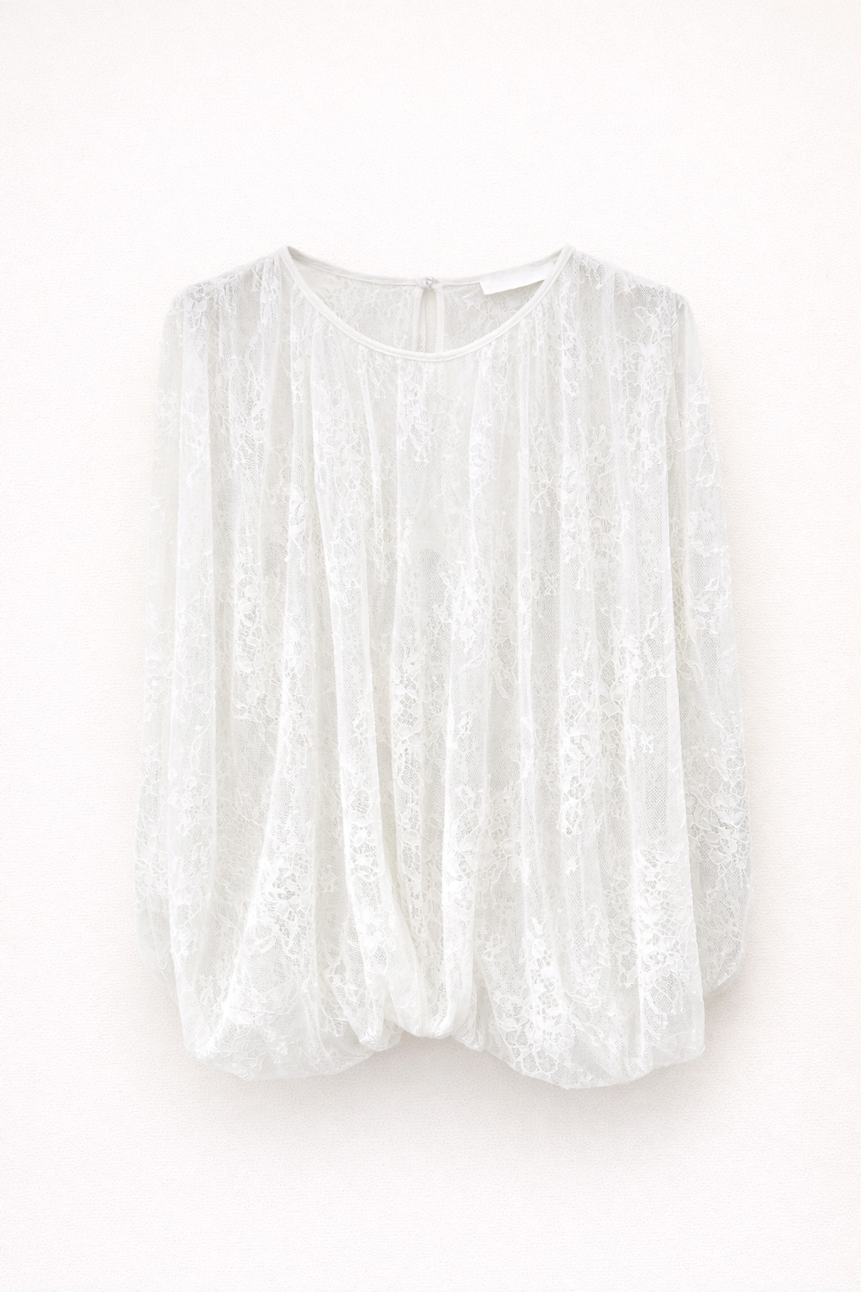 Blusa in tulle con ricamo in pizzo floreale. Scollo rotondo con arricciatura sul davanti. Chiusura posteriore con bottone e apertura a goccia. Vestibilità regolare, disponibile in taglia S/M, M/L.