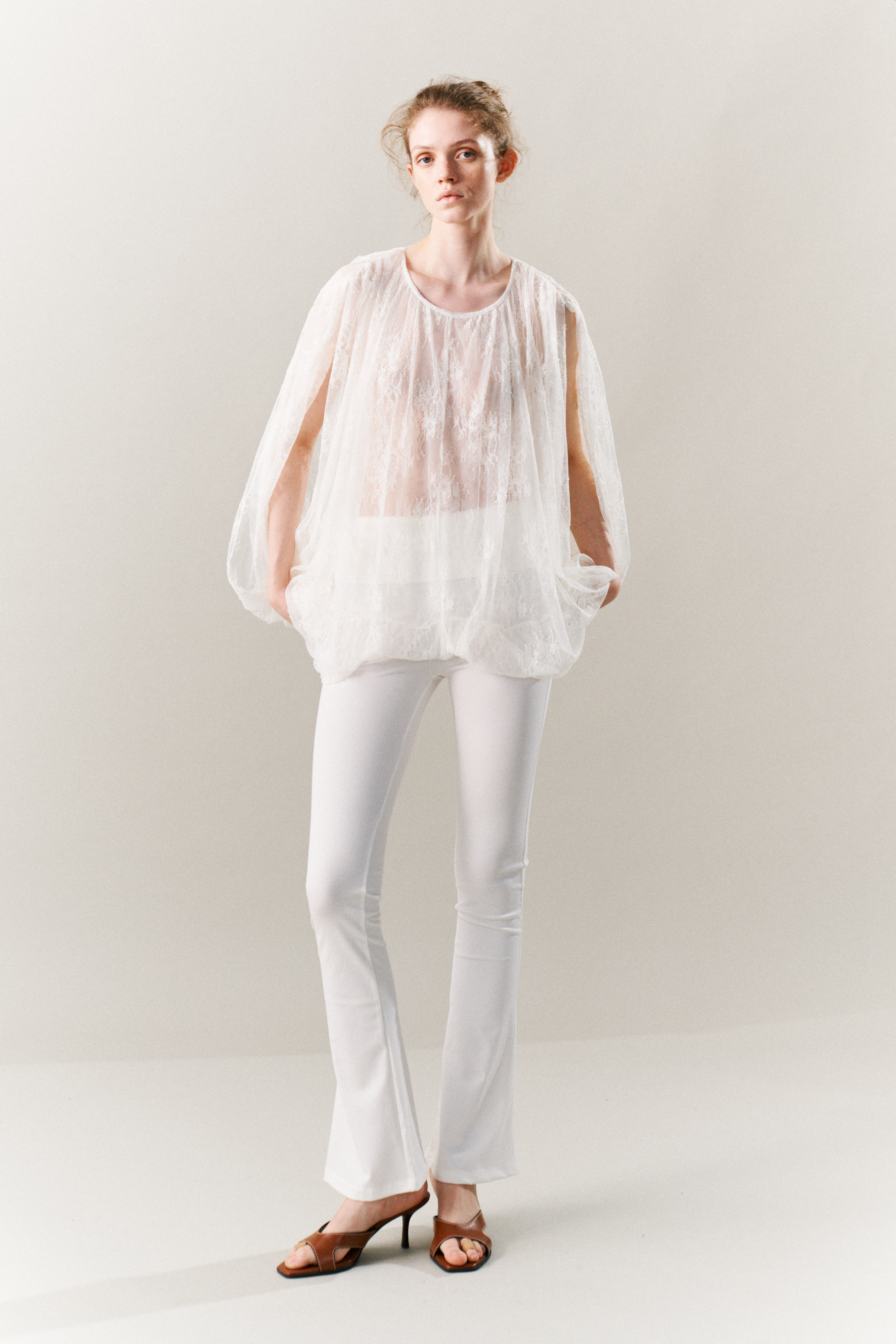 Pantaloni in tulle con ricamo in pizzo floreale. Vita elasticizzata. Gamba ampia e fluida. Balza decorativa in tulle applicata nella parte superiore. Fondo con elastico arricciato effetto balloon. Vestibilità regolare, disponibile in taglia S/M, M/L.