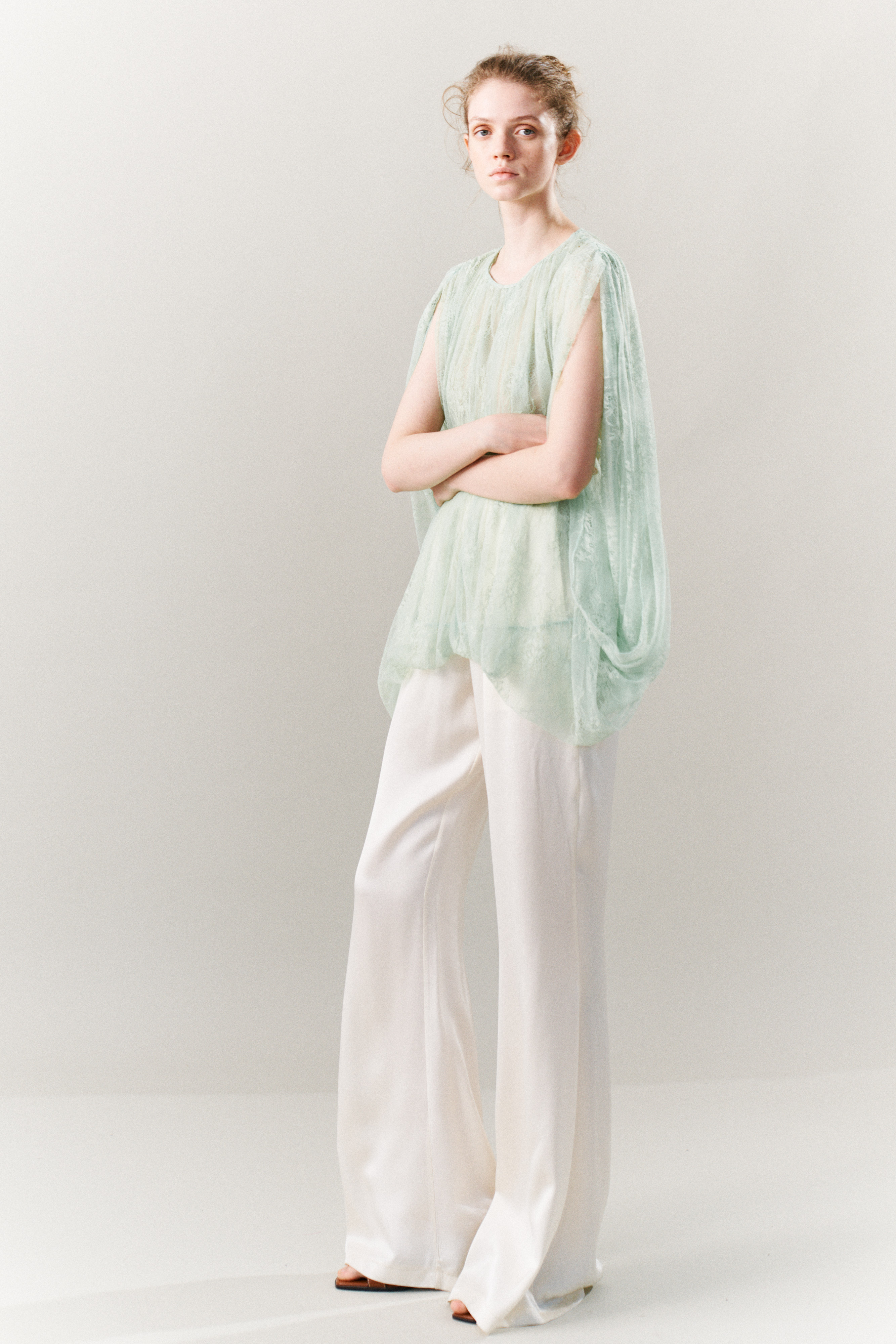 Blusa morbida in tessuto laminato. Maniche lunghe a palloncino con polsini. Presenta arricciature e trasparenza. Dettaglio chiusura a fiocco sul collo. Linea svasata. Disponibile in taglia S/M, M/L.