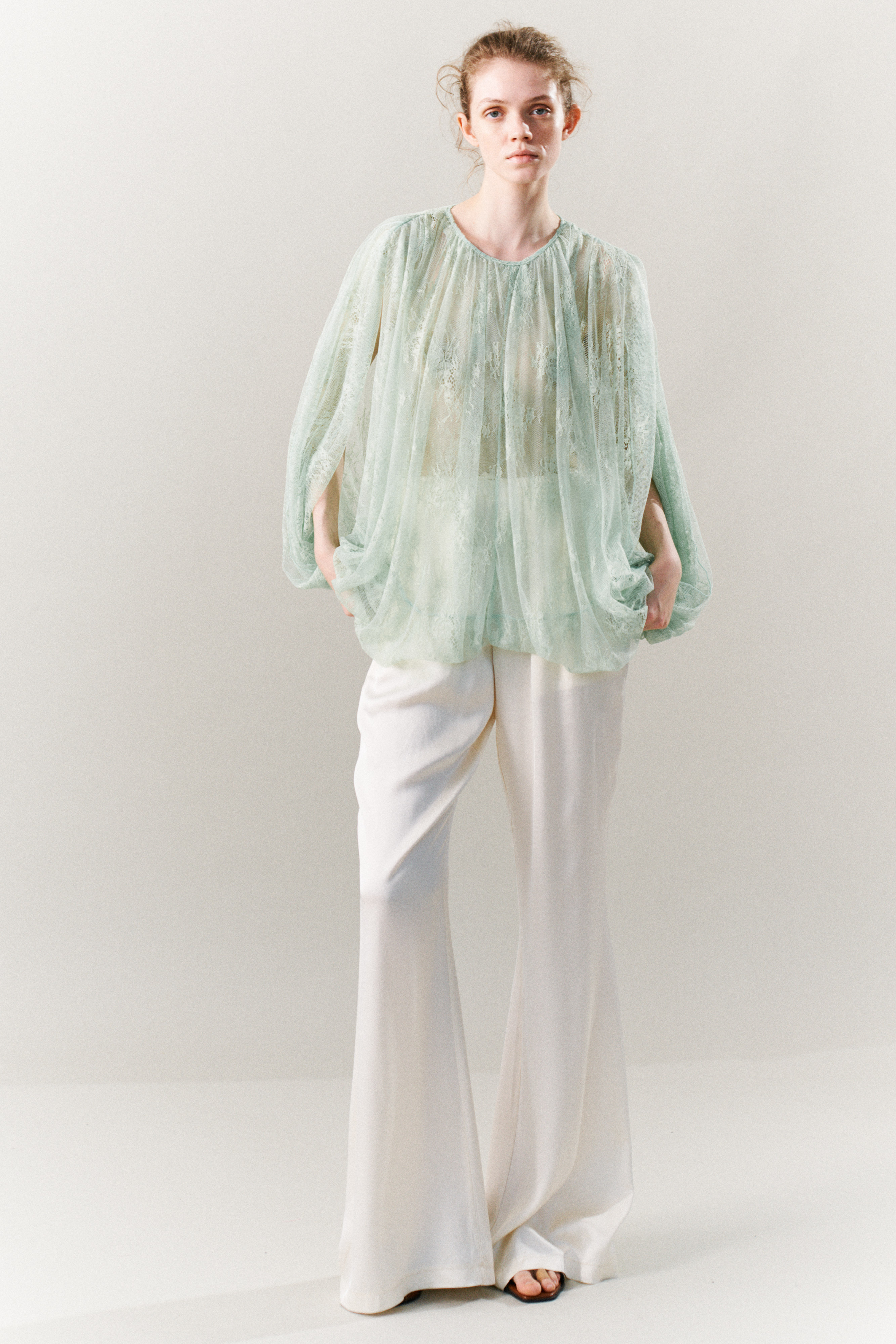 Pantaloni in tulle con ricamo in pizzo floreale. Vita elasticizzata. Gamba ampia e fluida. Balza decorativa in tulle applicata nella parte superiore. Fondo con elastico arricciato effetto balloon. Vestibilità regolare, disponibile in taglia S/M, M/L.