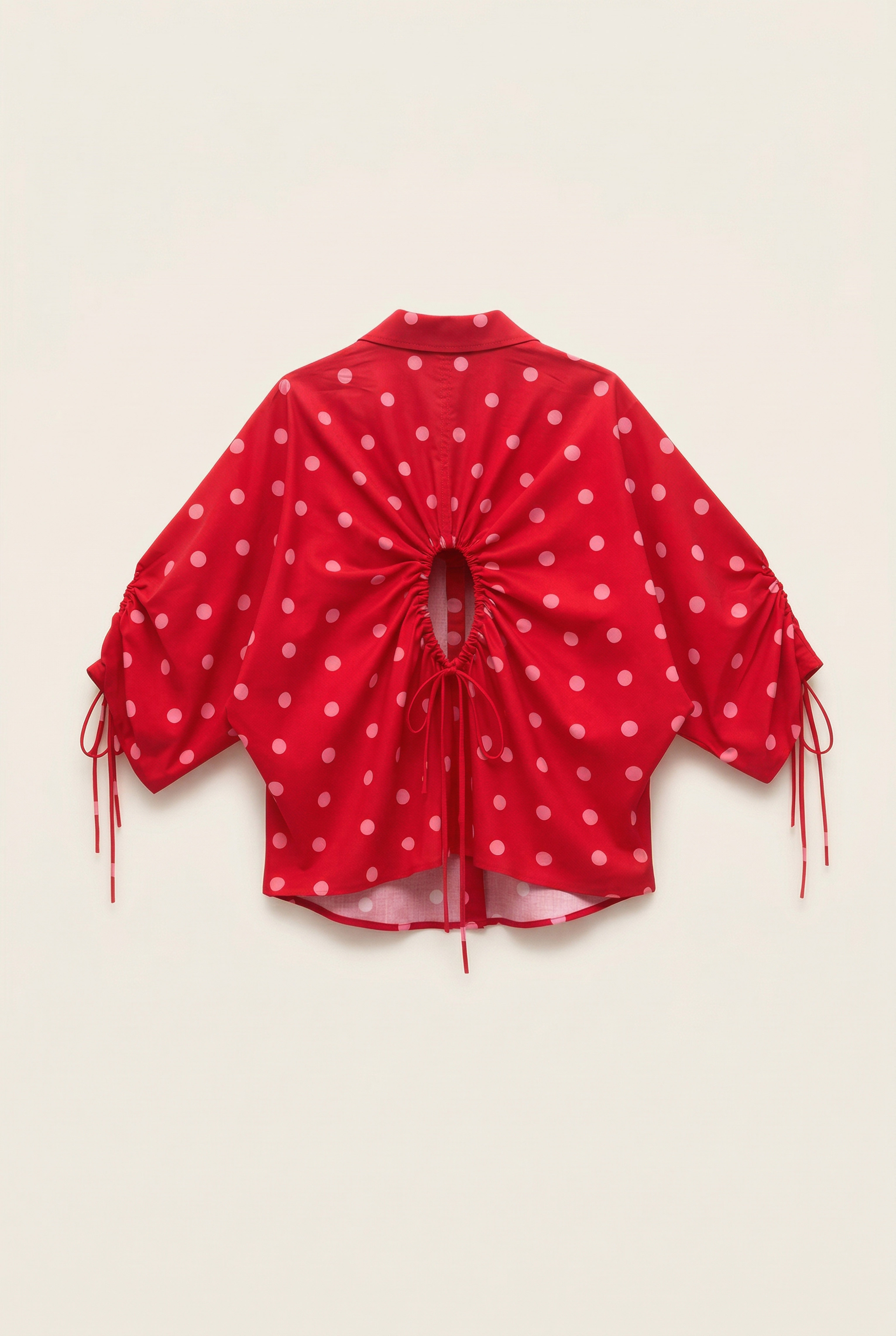Blusa in misto cotone con stampa a pois. Maniche ampie con dettaglio spacco e coulisse regolabile. Schiena con arricciatura e apertura centrale regolabile con coulisse. Chiusura frontale con bottoni nascosti. Vestibilità regolare, disponibile in taglia UNICA.