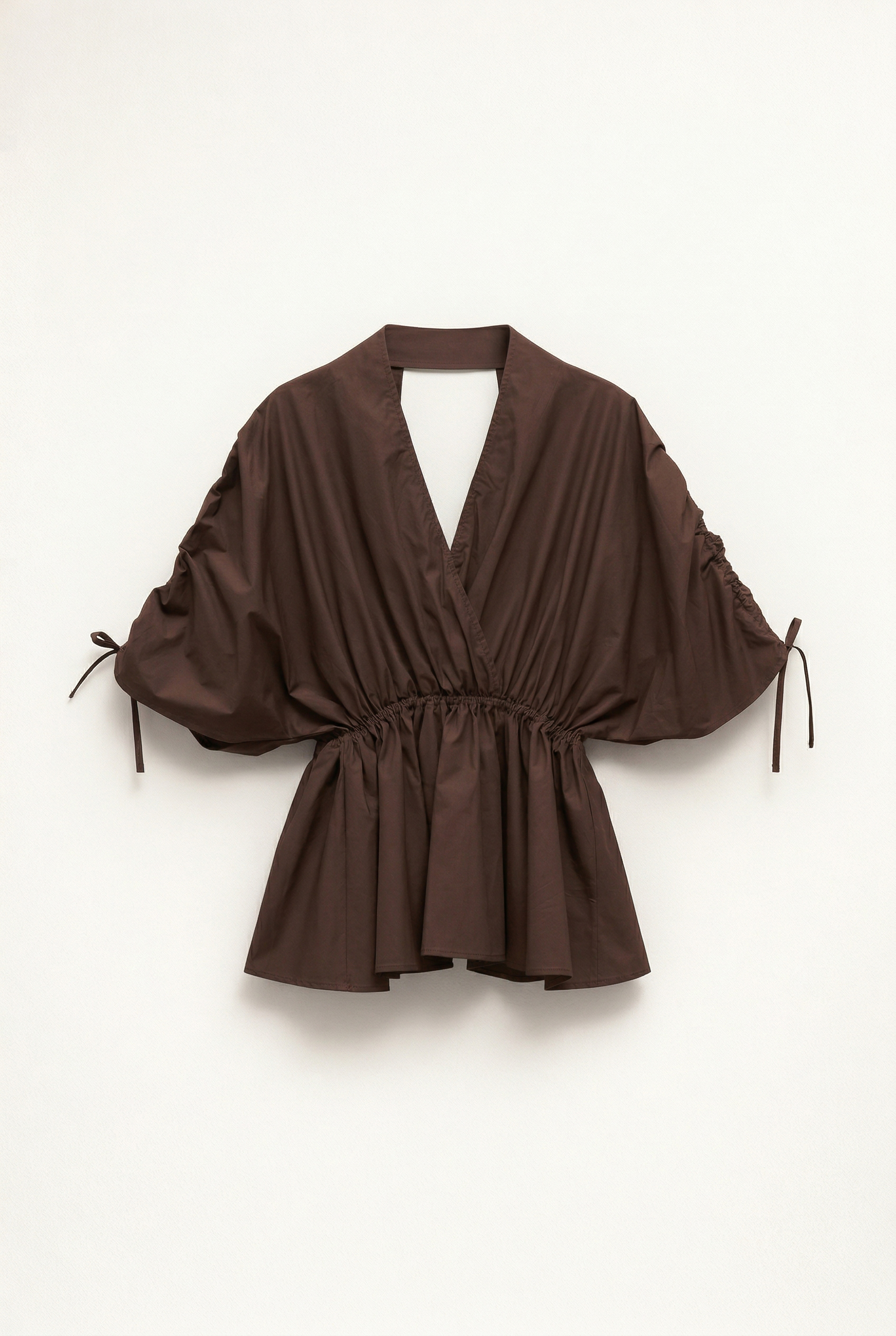 Blusa in cotone con scollo a V profondo incrociato. Maniche ampie con arricciature e coulisse regolabile. Vita elasticizzata con dettaglio arricciatura. Dettaglio retro con apertura a V incrociato. Vestibilità regolare, disponibile in taglia S/M, M/L.