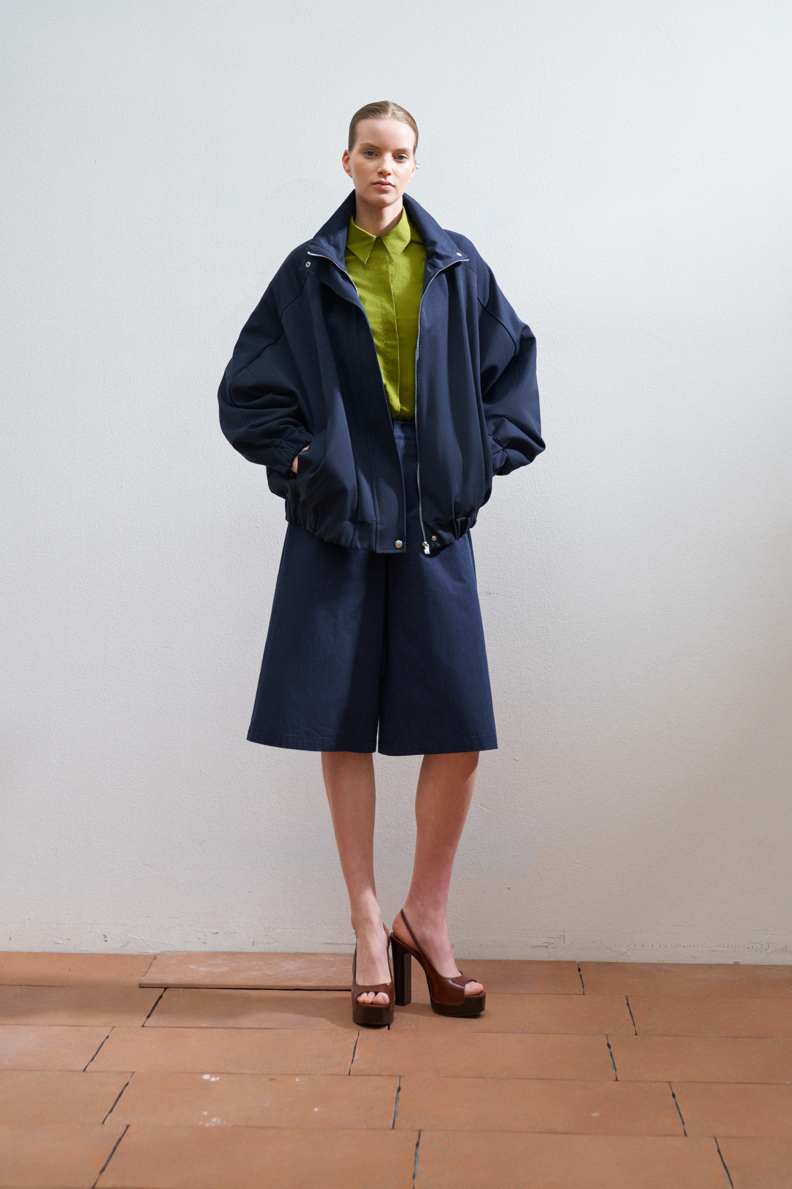 Camicia con colletto a punta in misto cotone. Maniche a tre quarti con spalla scesa. Tasche frontali applicate con patta e bottone. Carré posteriore con piega centrale. Chiusura frontale con bottoni. Vestibilità regolare, disponibile in taglia S/M, M/L.