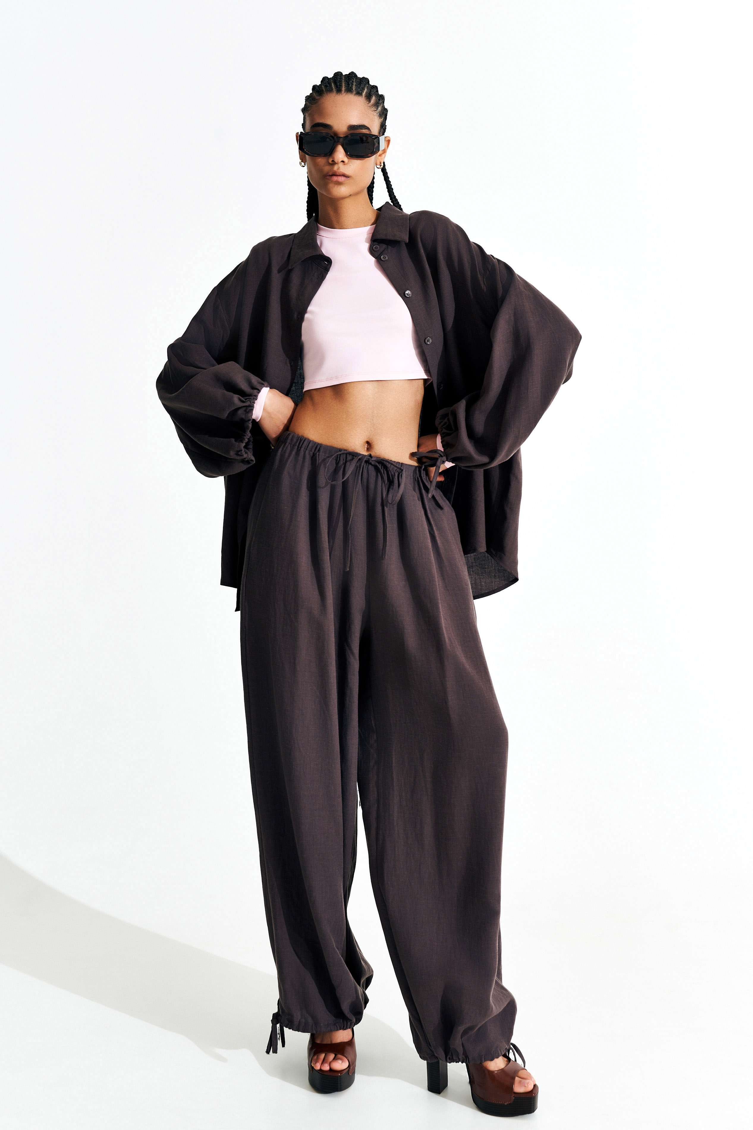 Carré posteriore con piega centrale. Chiusura frontale con bottoni.