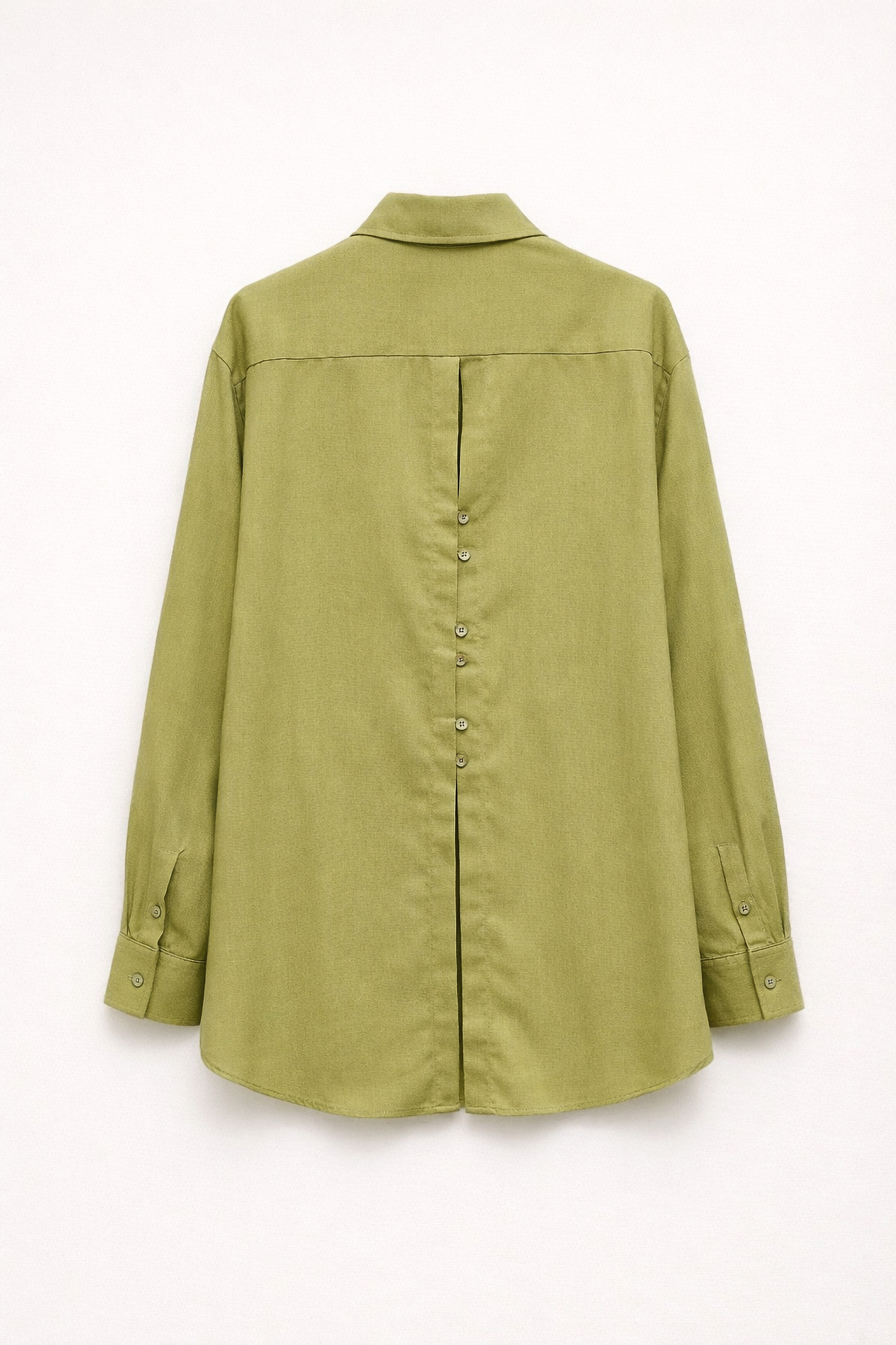 Camicia maniche lunghe in 100% tencel. Collo a punta classico. Tasca applicata sul petto. Dettaglio spacco centrale dietro con chiusura a bottoni. Chiusura frontale con bottoni. Vestibilità regolare, disponibile in taglia S/M, M/L.