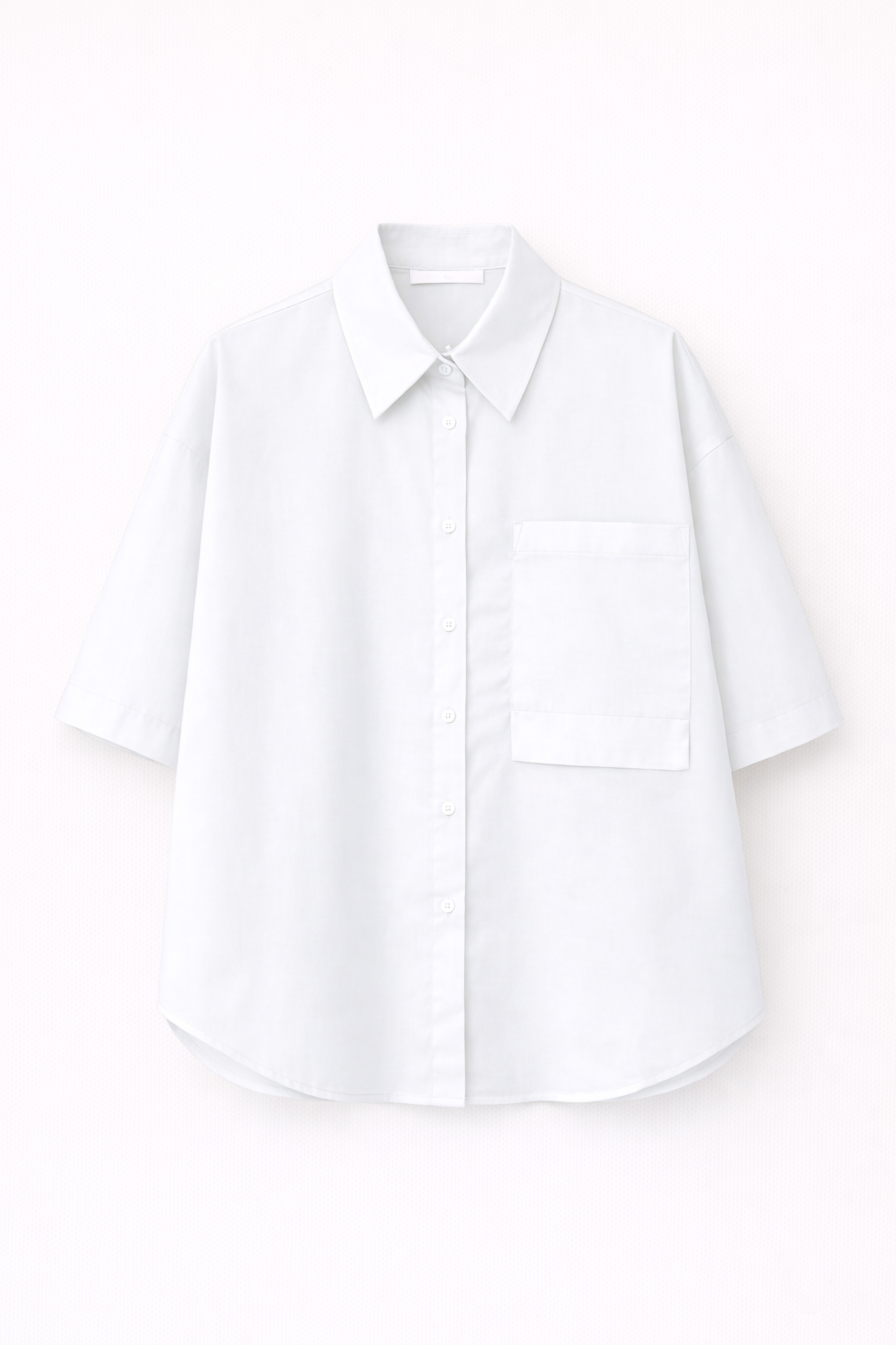 Camicia maniche corte con colletto a punta. Tasca applicata sul petto. Fondo leggermente arrotondato. Carré posteriore con laccetti pendenti decorative. Chiusura frontale con bottoni tono su tono. Vestibilità regolare, disponibile in taglia UNICA.