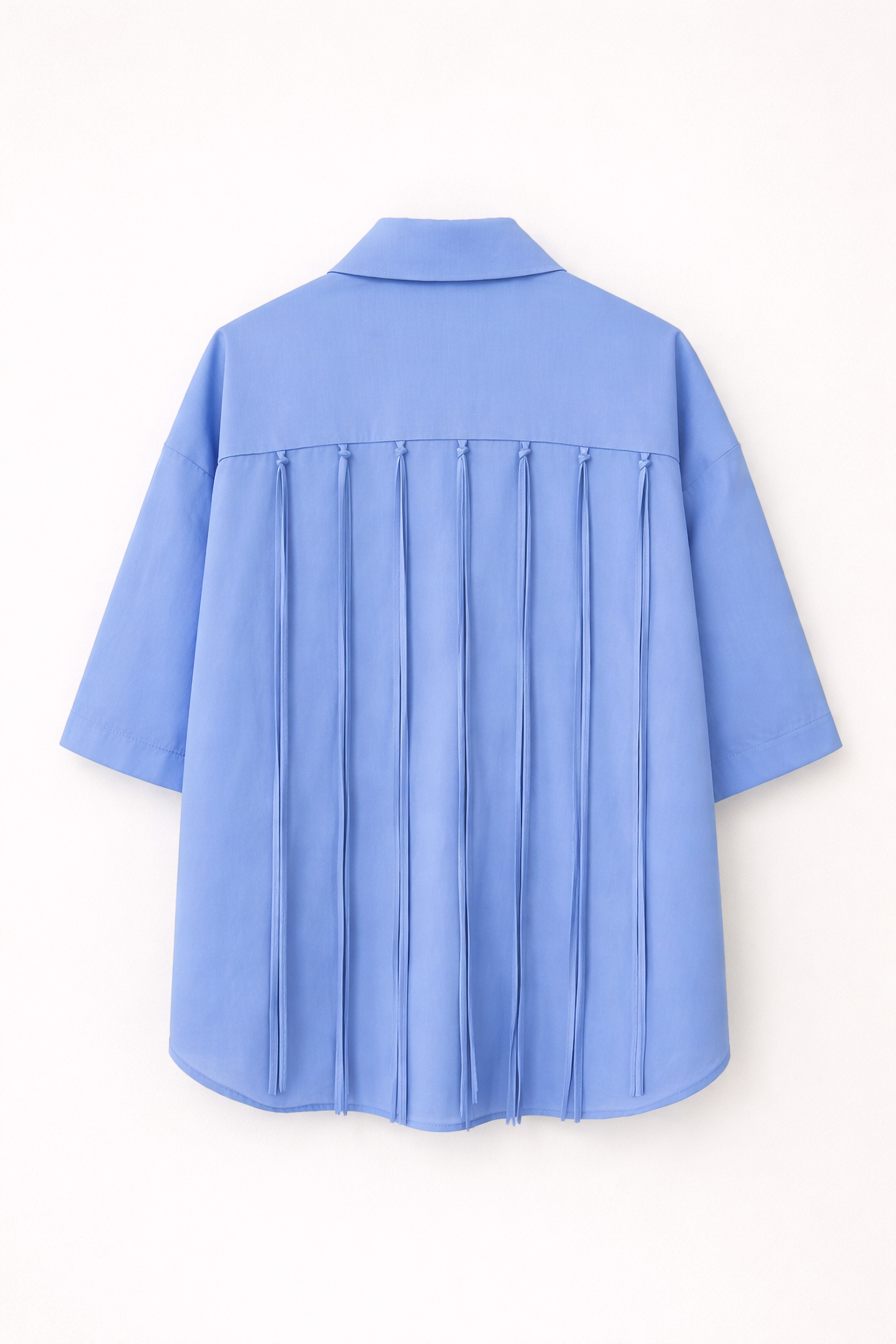 Camicia maniche corte con colletto a punta. Tasca applicata sul petto. Fondo leggermente arrotondato. Carré posteriore con laccetti pendenti decorative. Chiusura frontale con bottoni tono su tono. Vestibilità regolare, disponibile in taglia UNICA.
