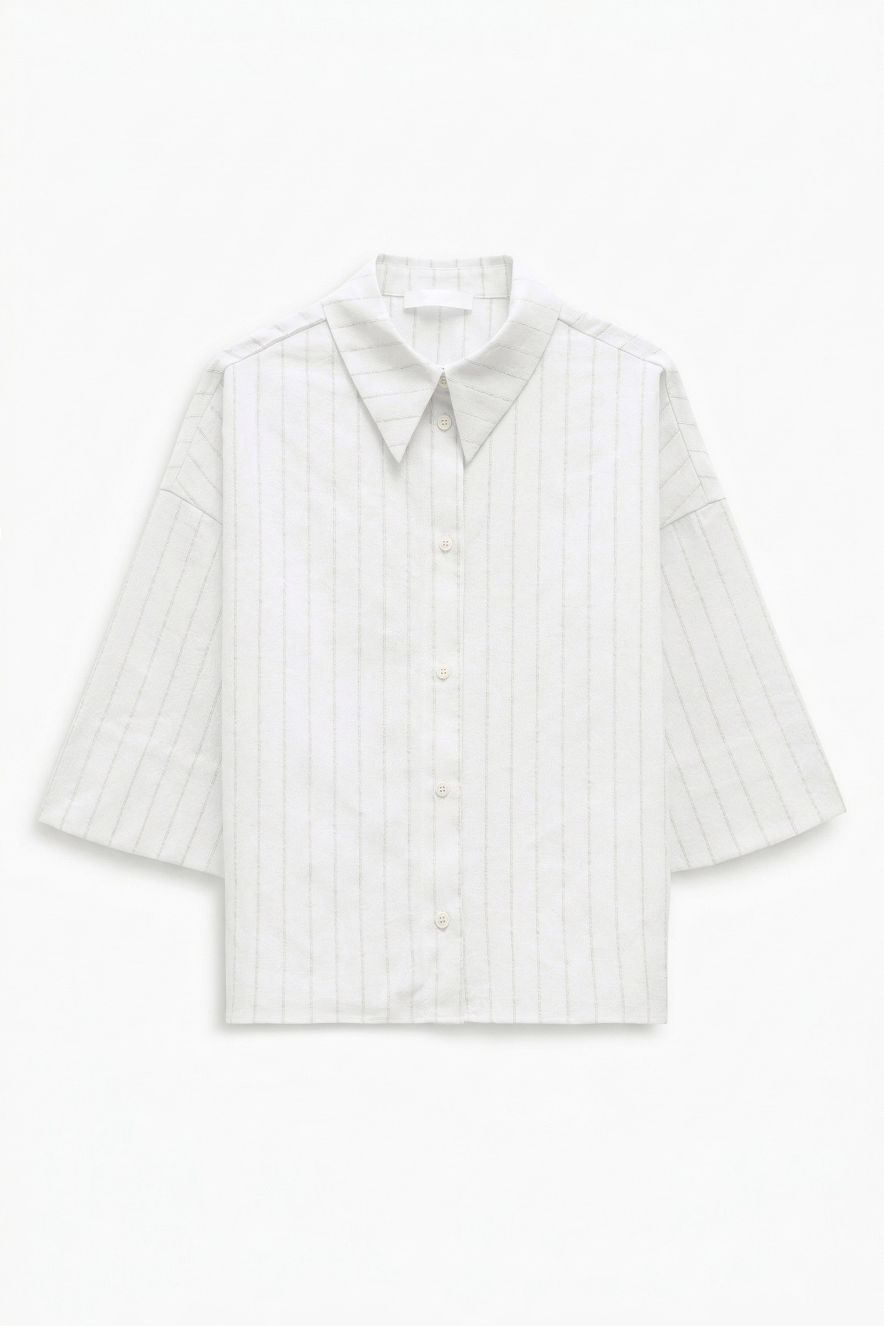 Camicia con colletto a punta in misto cotone. Maniche a tre quarti con spalla scesa. Tasche frontali applicate con patta e bottone. Carré posteriore con piega centrale. Chiusura frontale con bottoni. Vestibilità regolare, disponibile in taglia S/M, M/L.
