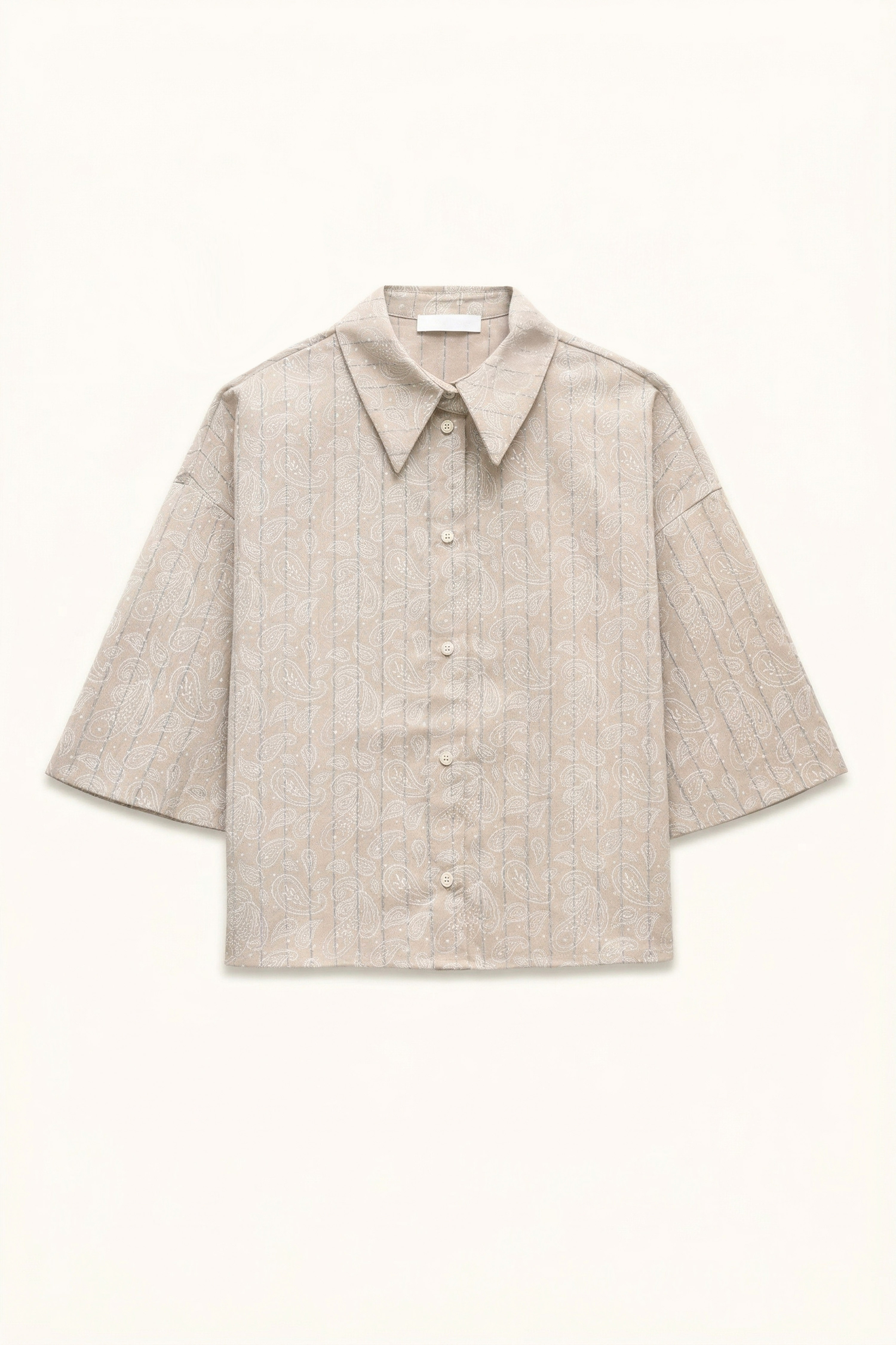 Camicia a righe con stampa paisley. Colletto a punta. Maniche corte ampie. Chiusura frontale con bottoni. Vestibilità regolare, disponibile in taglia S/M, M/L.