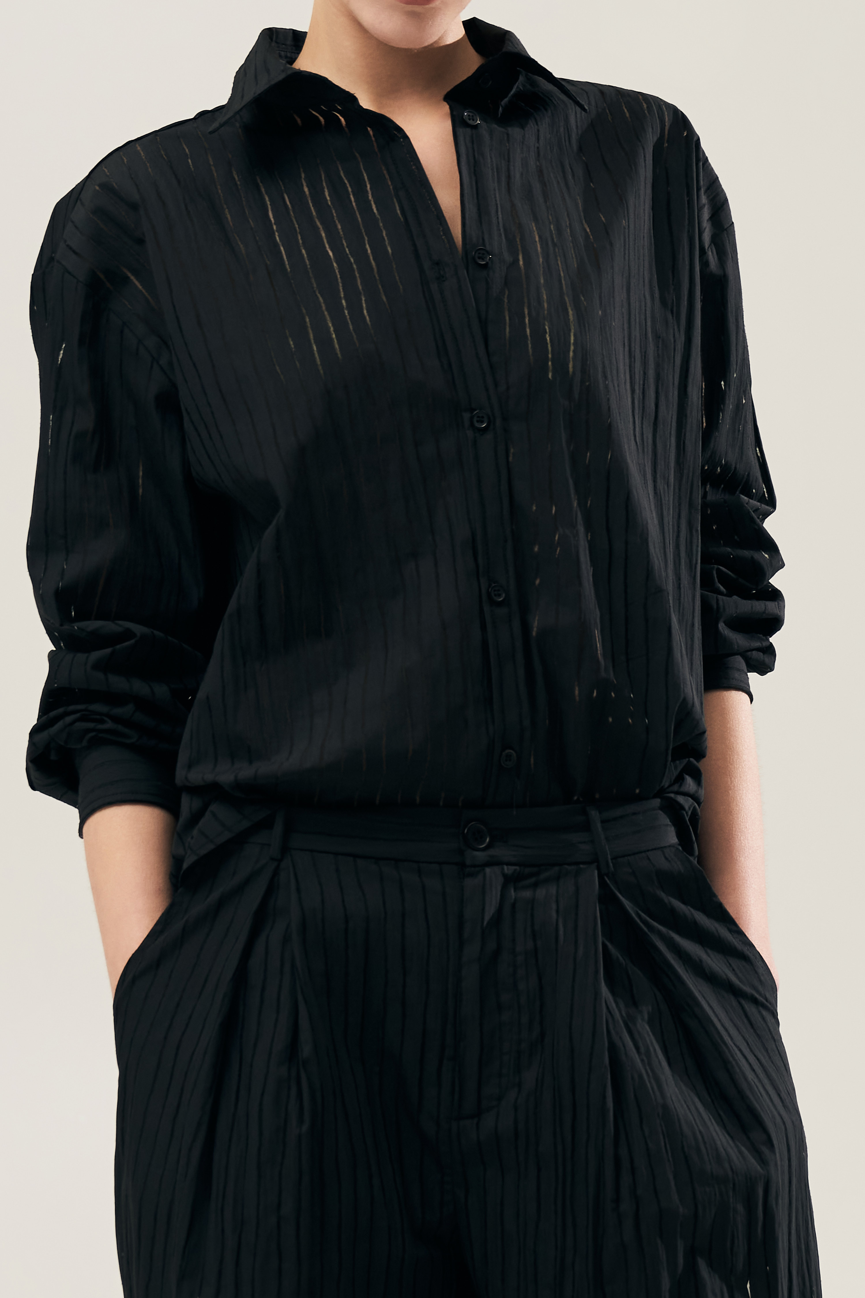 Camicia in tessuto con lavorazioni jacquard a righe in rilievo. Colletto a punta. Maniche corte. Tasca applicata sul petto. Carré posteriore con piega centrale. Chiusura frontale con bottoni. Vestibilità regolare, disponibile in taglia S/M, M/L.