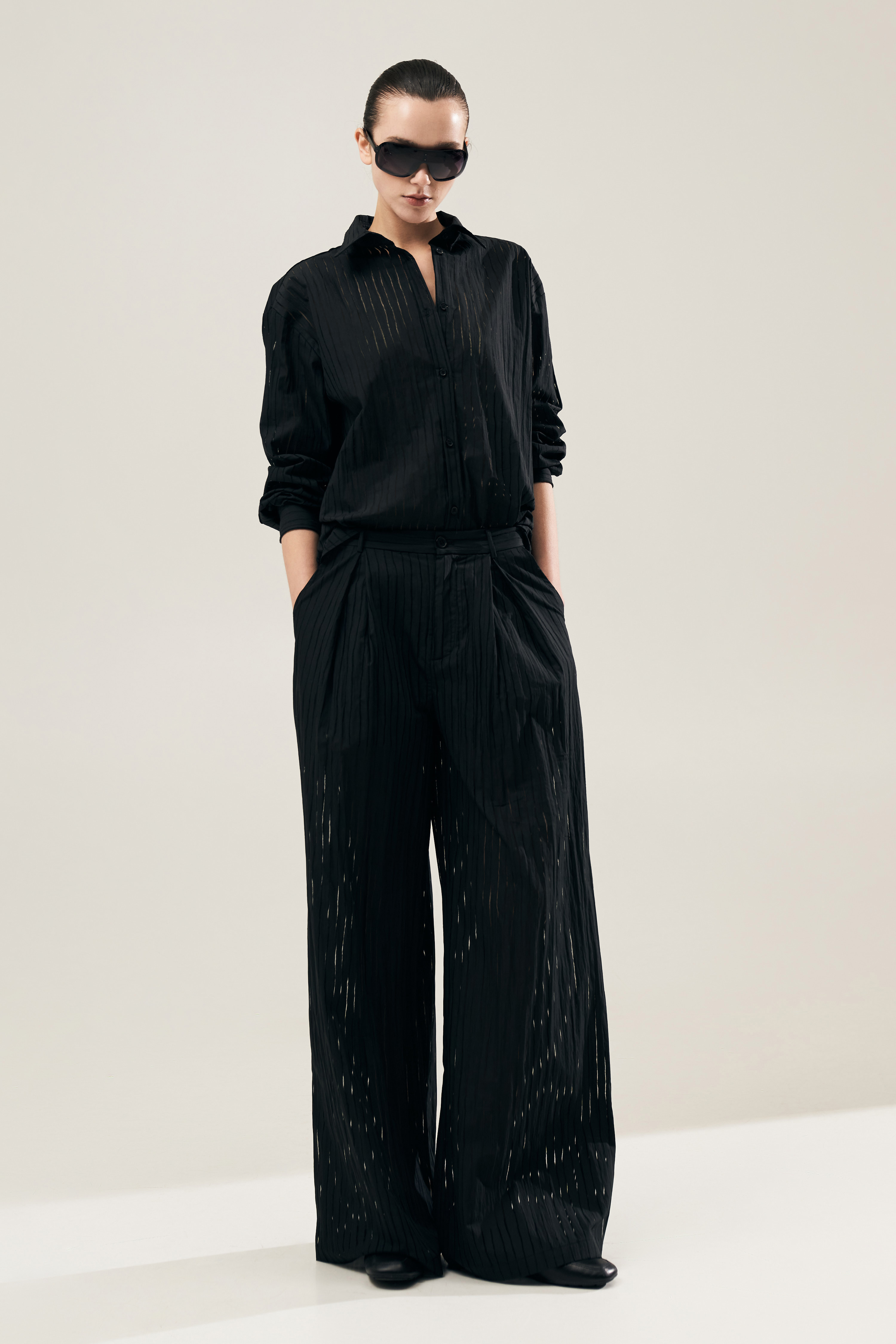 Pantaloni lunghi a righe in misto cotone. Vita con passanti e chiusura con bottone. Elastico sul retro. Pinces frontali. Tasche laterali inserite. Tasca a filetto sul retro. Vestibilità regolare, disponibile in taglia S/M, M/L.