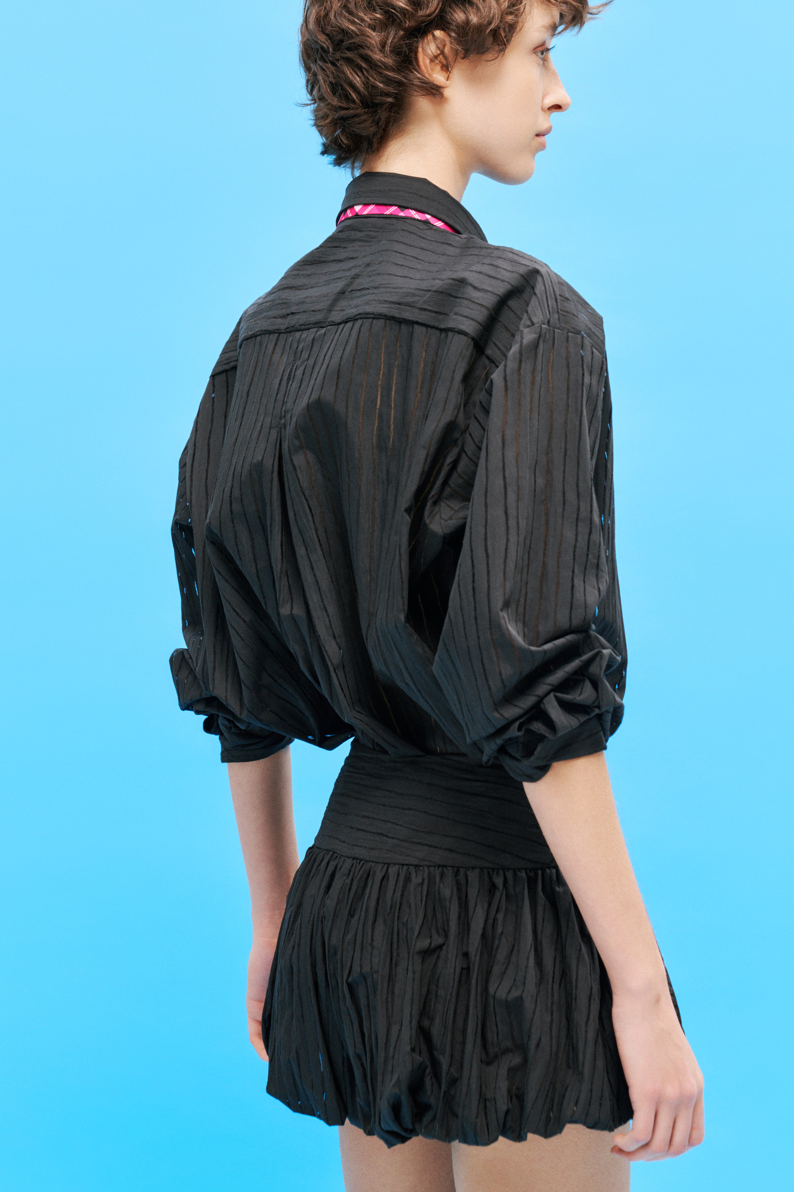 Camicia maniche corte con colletto a punta. Tasca applicata sul petto. Fondo leggermente arrotondato. Carré posteriore con laccetti pendenti decorative. Chiusura frontale con bottoni tono su tono. Vestibilità regolare, disponibile in taglia UNICA.