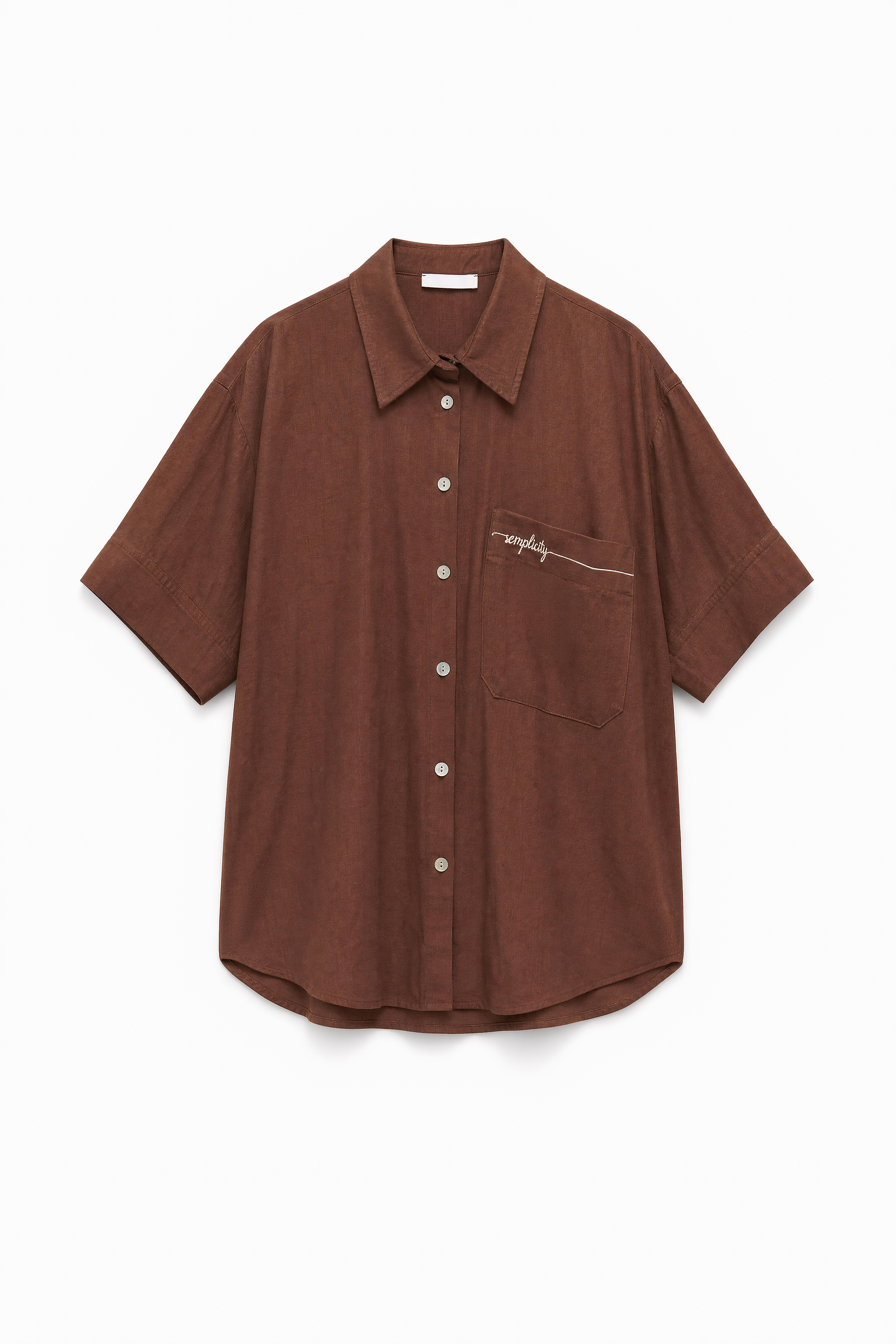 Camicia over in tessuto leggero misto lino. Maniche corte ampie con bottone sul retro. Taschino applicato con dettaglio ricamo. Carré posteriore con piega centrale. Chiusura frontale con bottoni. Vestibilità regolare, disponibile in taglia UNICA.