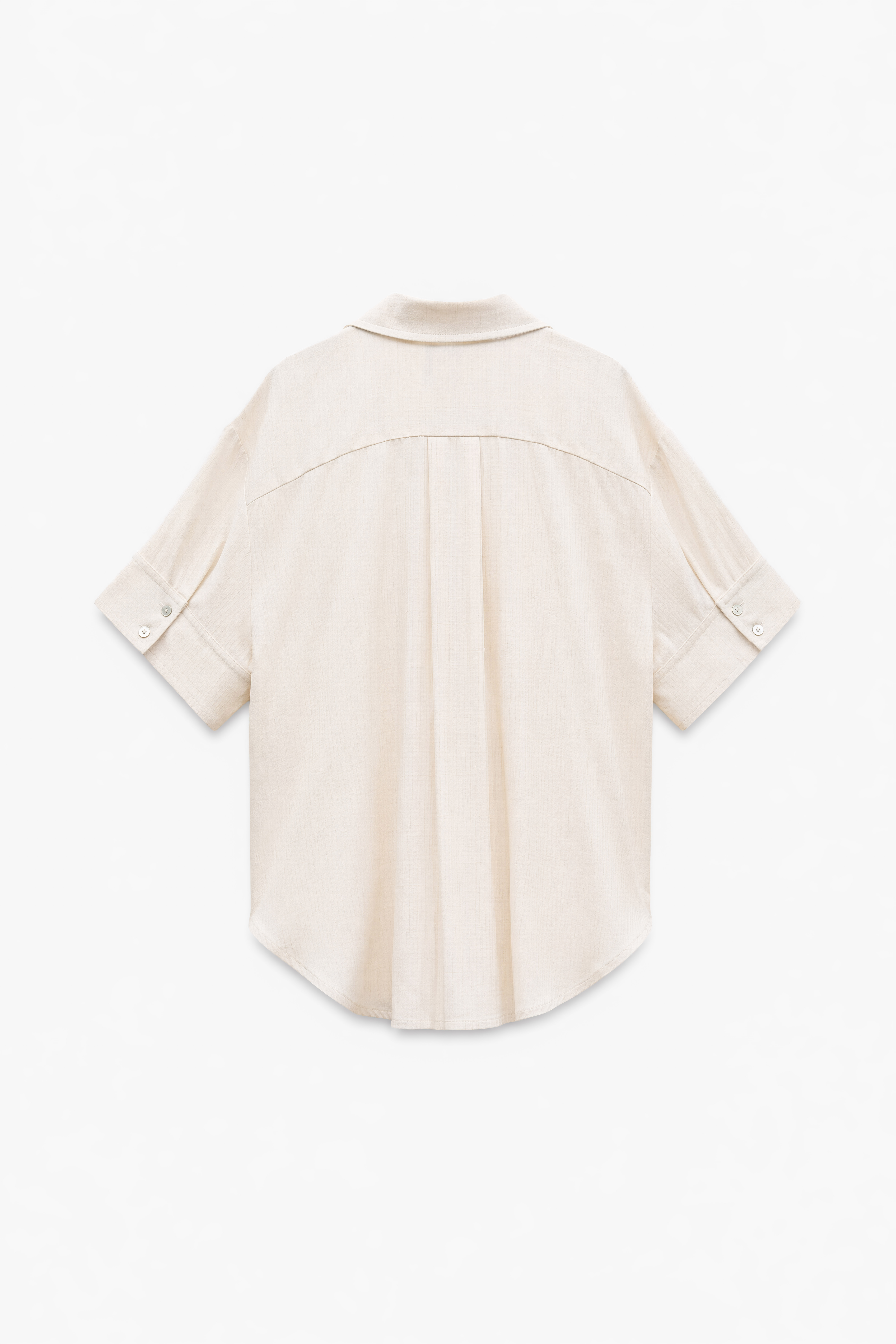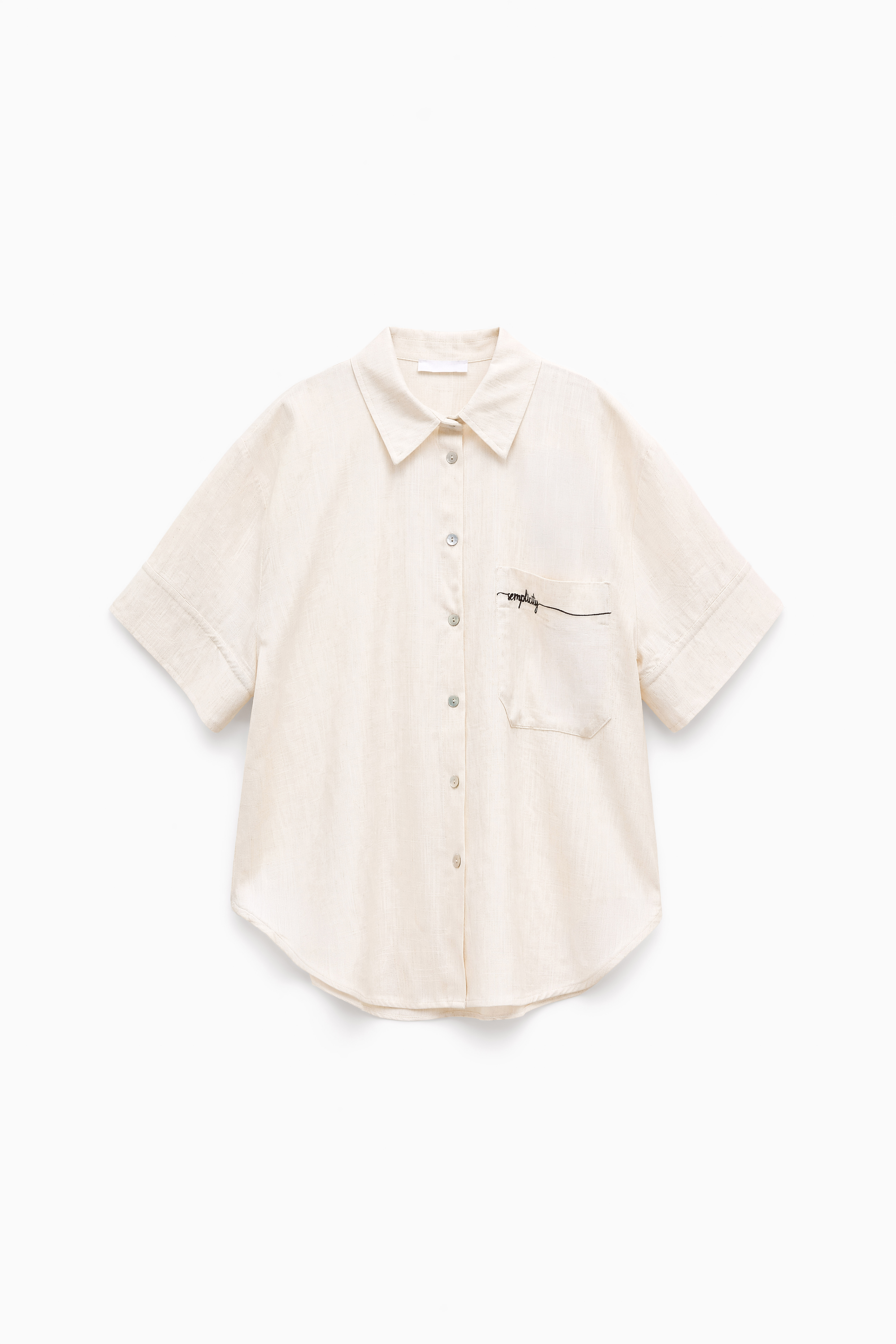 Camicia over in tessuto leggero misto lino. Maniche corte ampie con bottone sul retro. Taschino applicato con dettaglio ricamo. Carré posteriore con piega centrale. Chiusura frontale con bottoni. Vestibilità regolare, disponibile in taglia UNICA.