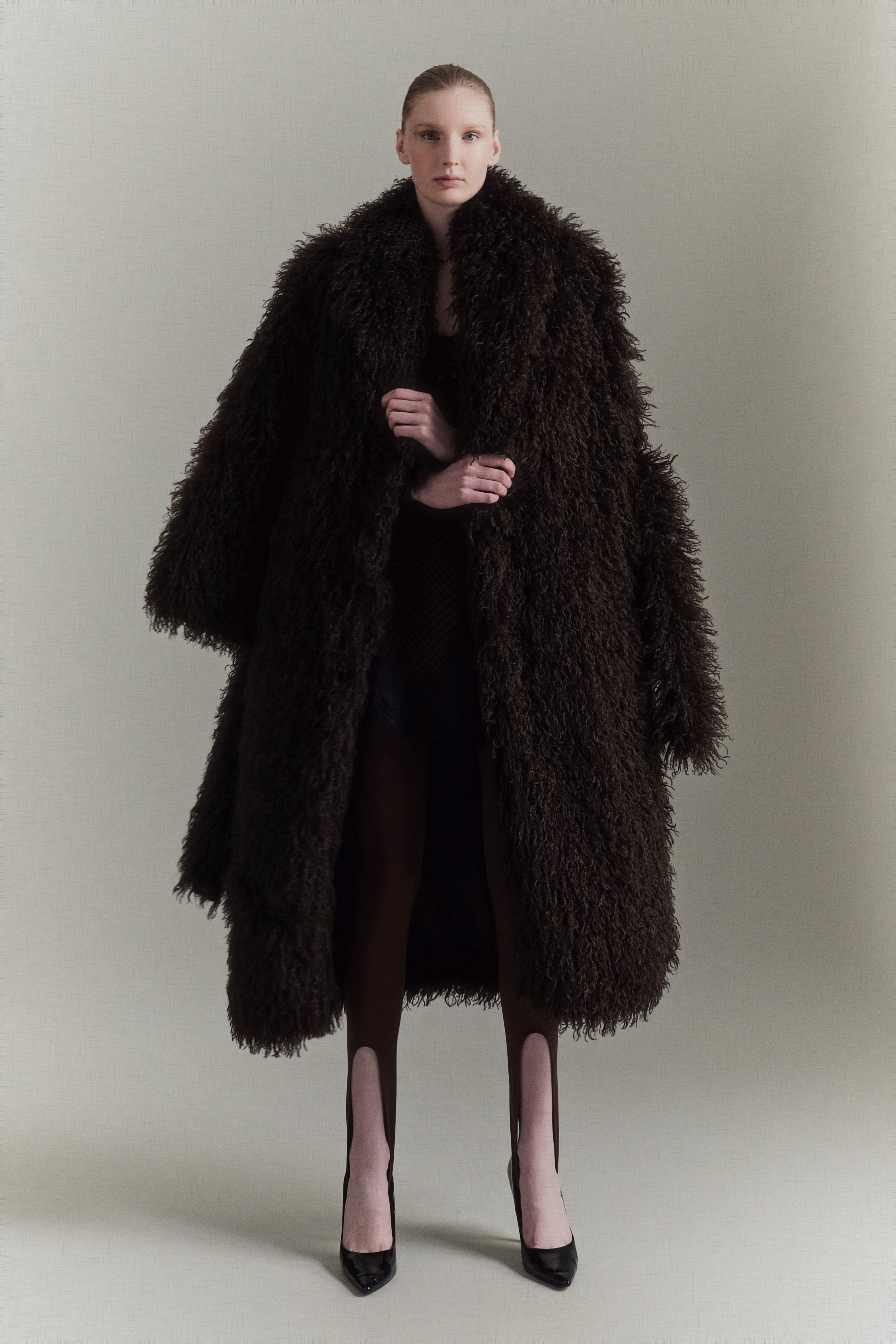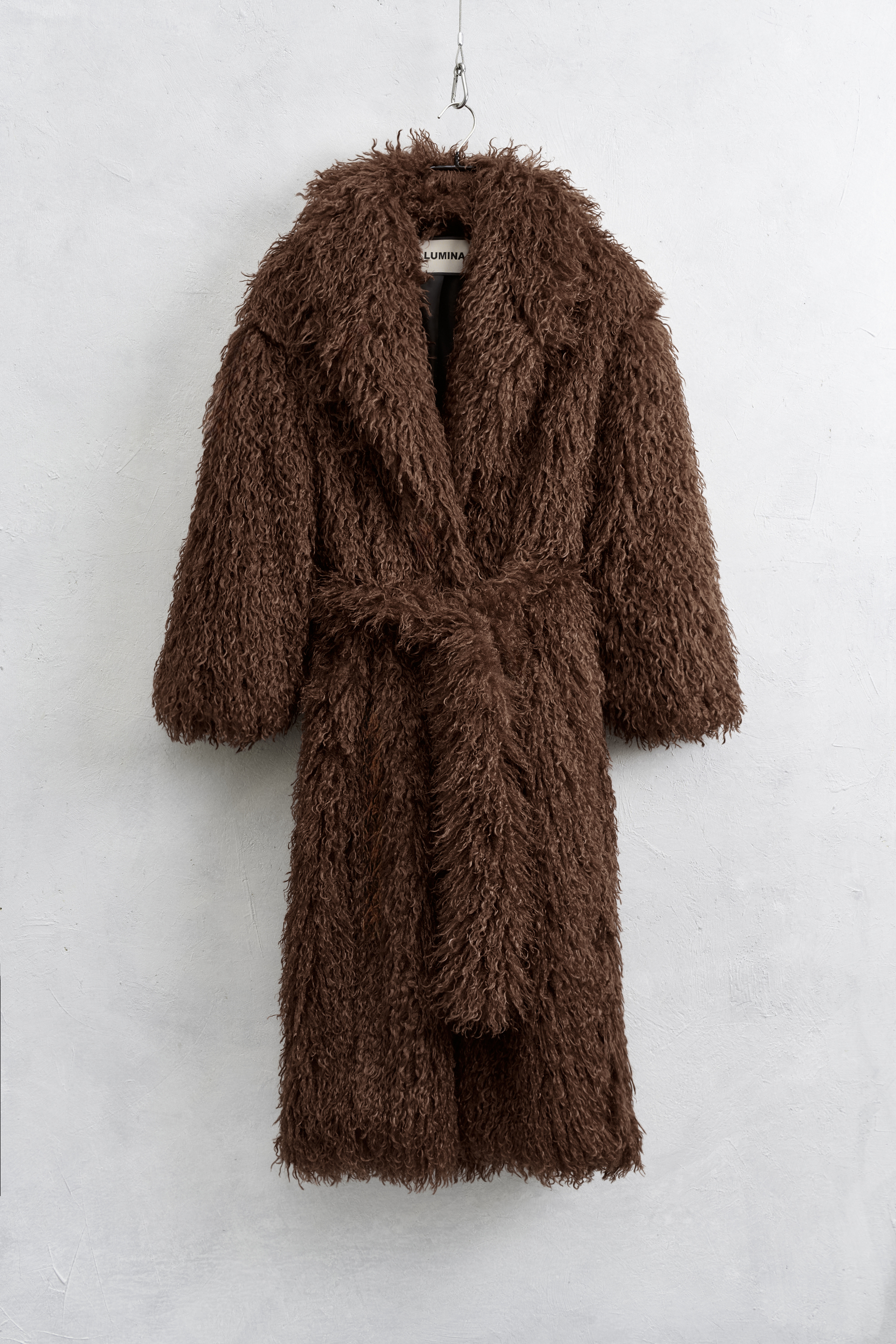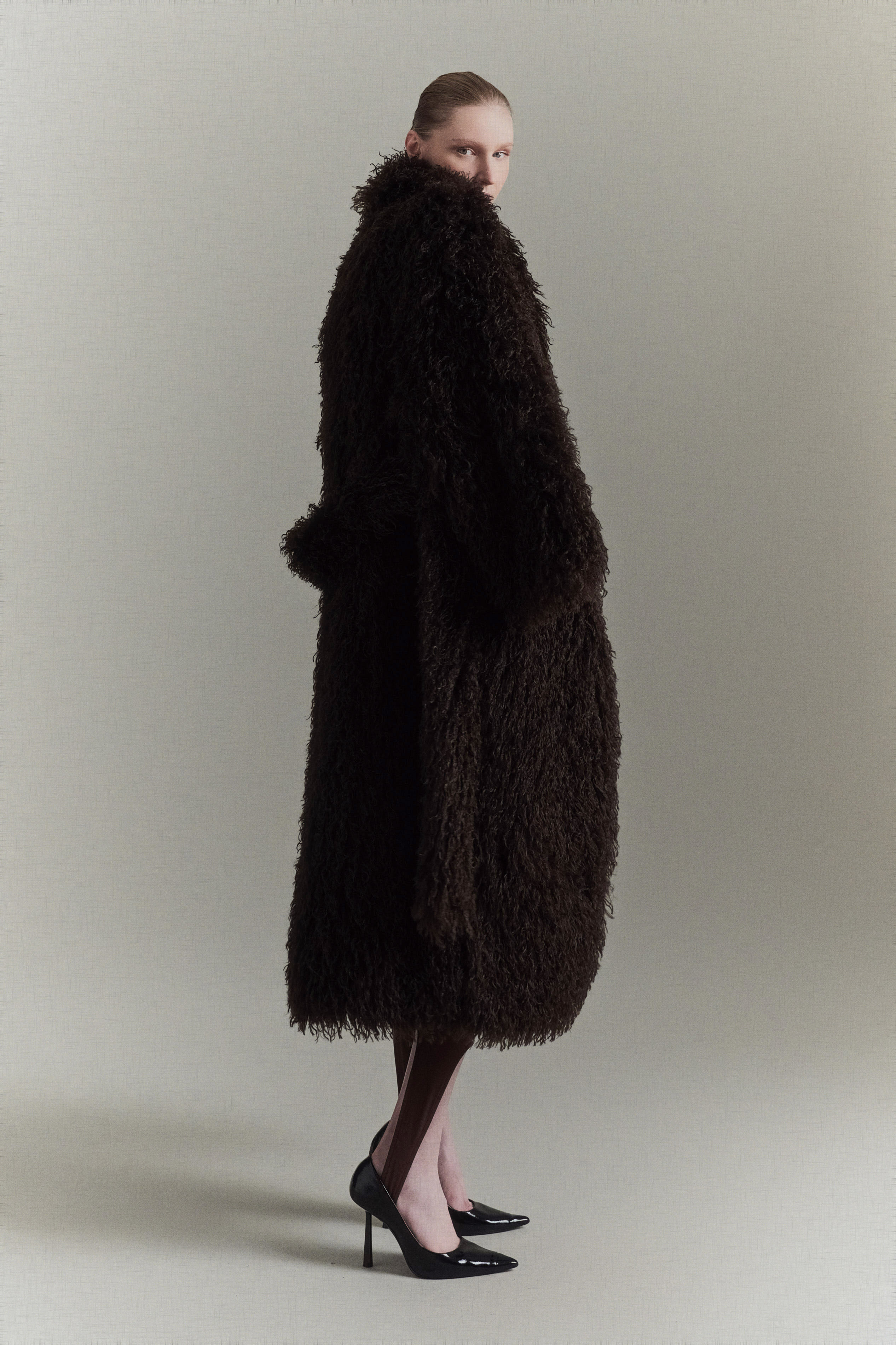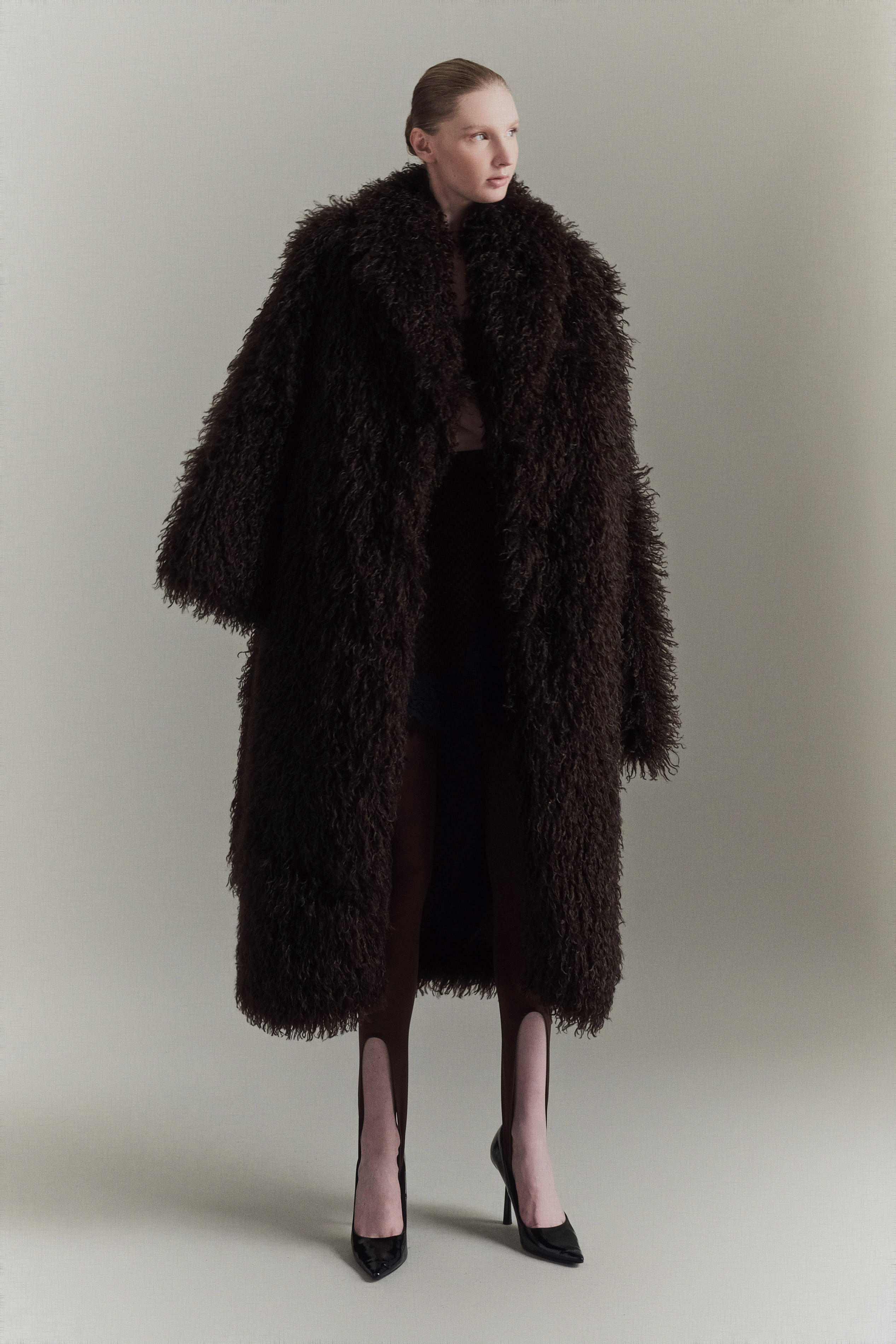 Capotto lungo realizzato in pelliccia sintetica.