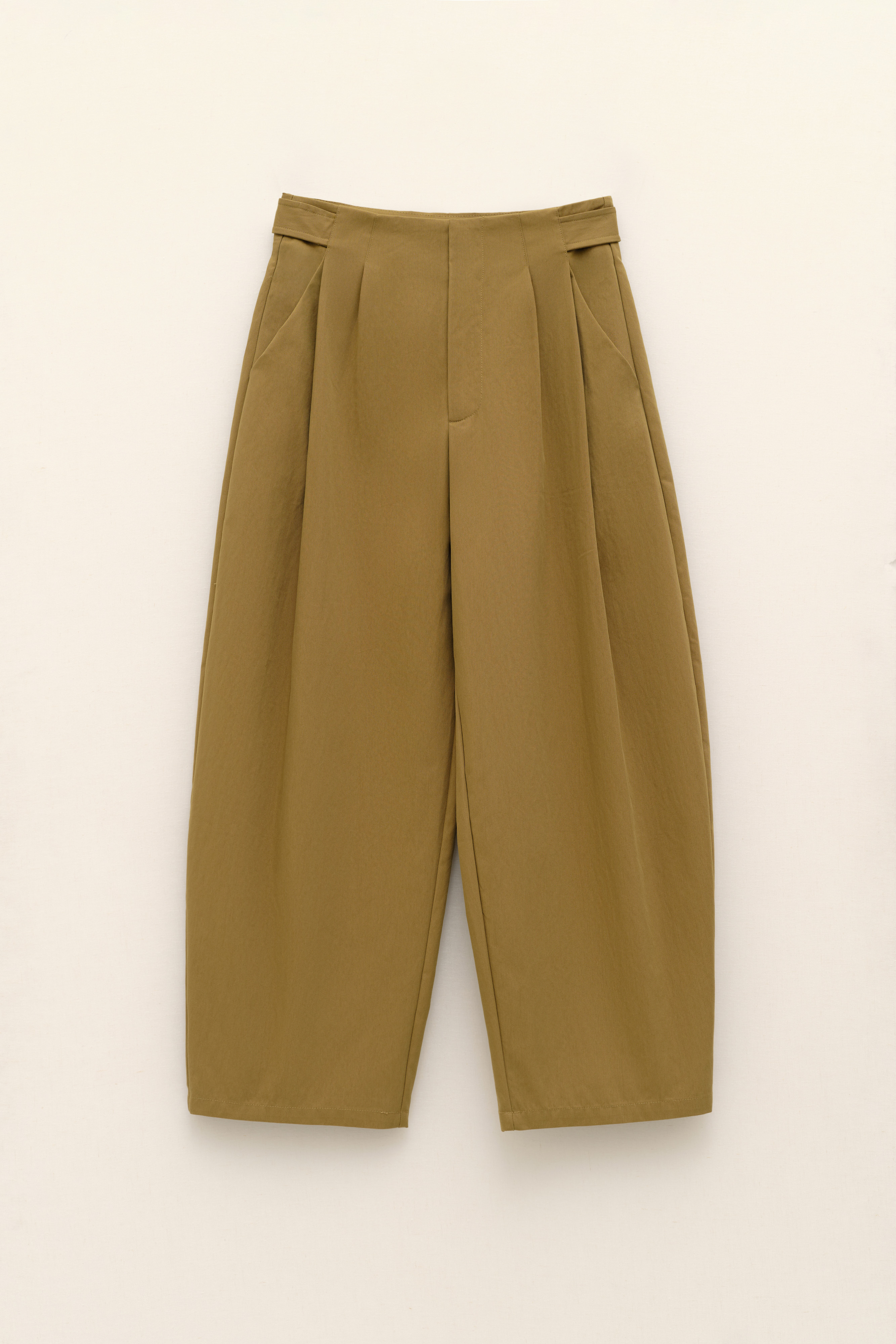 Pantalone barrel in misto cotone. Vita alta. Dettaglio pinces sul davanti. Applicazione tasche sul retro. Chiusura frontale con zip e gancio nascosto. Fit regolare, disponibile in taglia S/M/L.