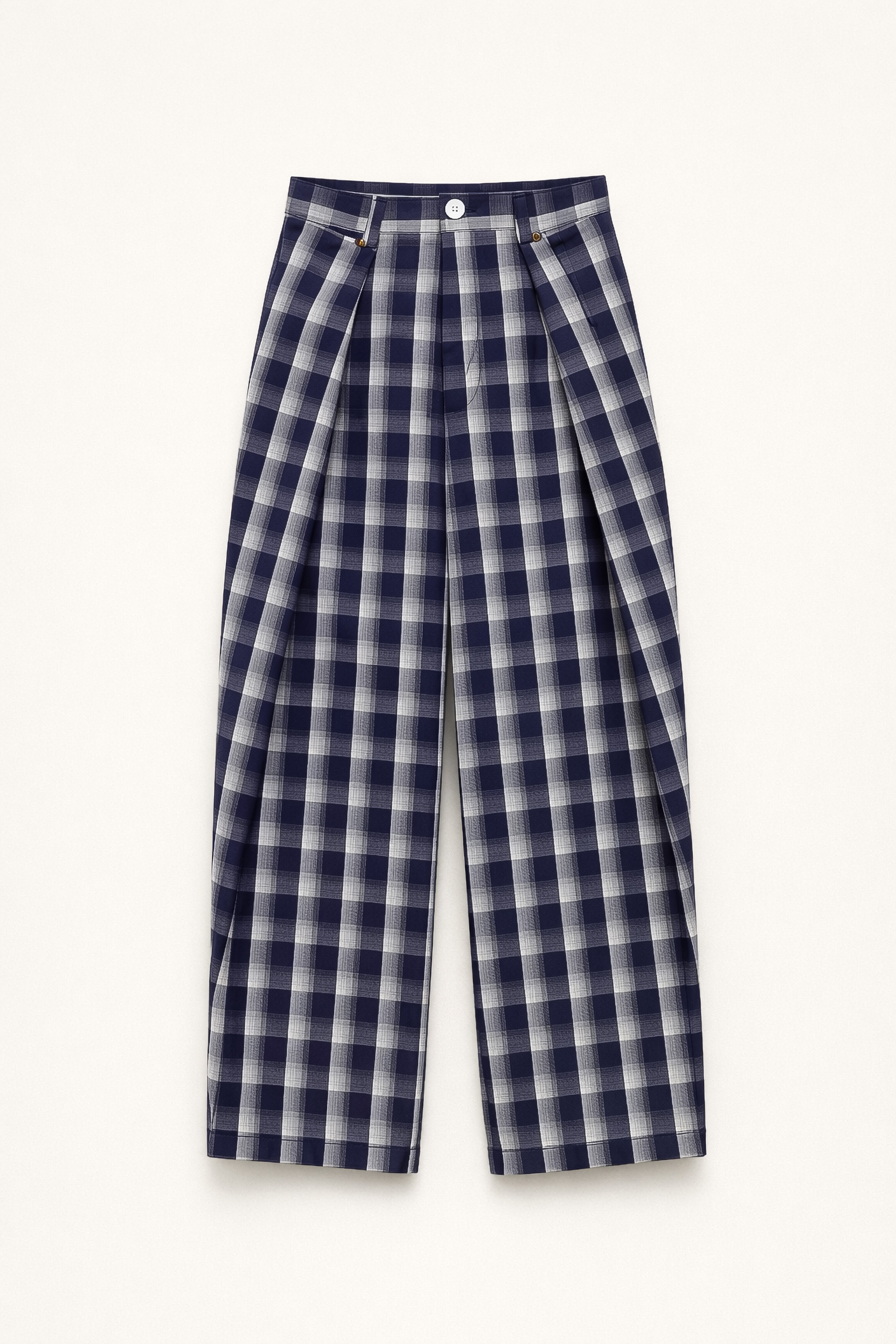 Pantaloni lunghi realizzati in tessuto con fantasia a quadri. Vita elasticizzata. Gamba dritta. Chiusura frontale con cerniera e bottone. Dettaglio laterale con pannello sovvrapposto e taglio strutturato. Vestibilità regolare, disponibile in taglia S/M, M/L.