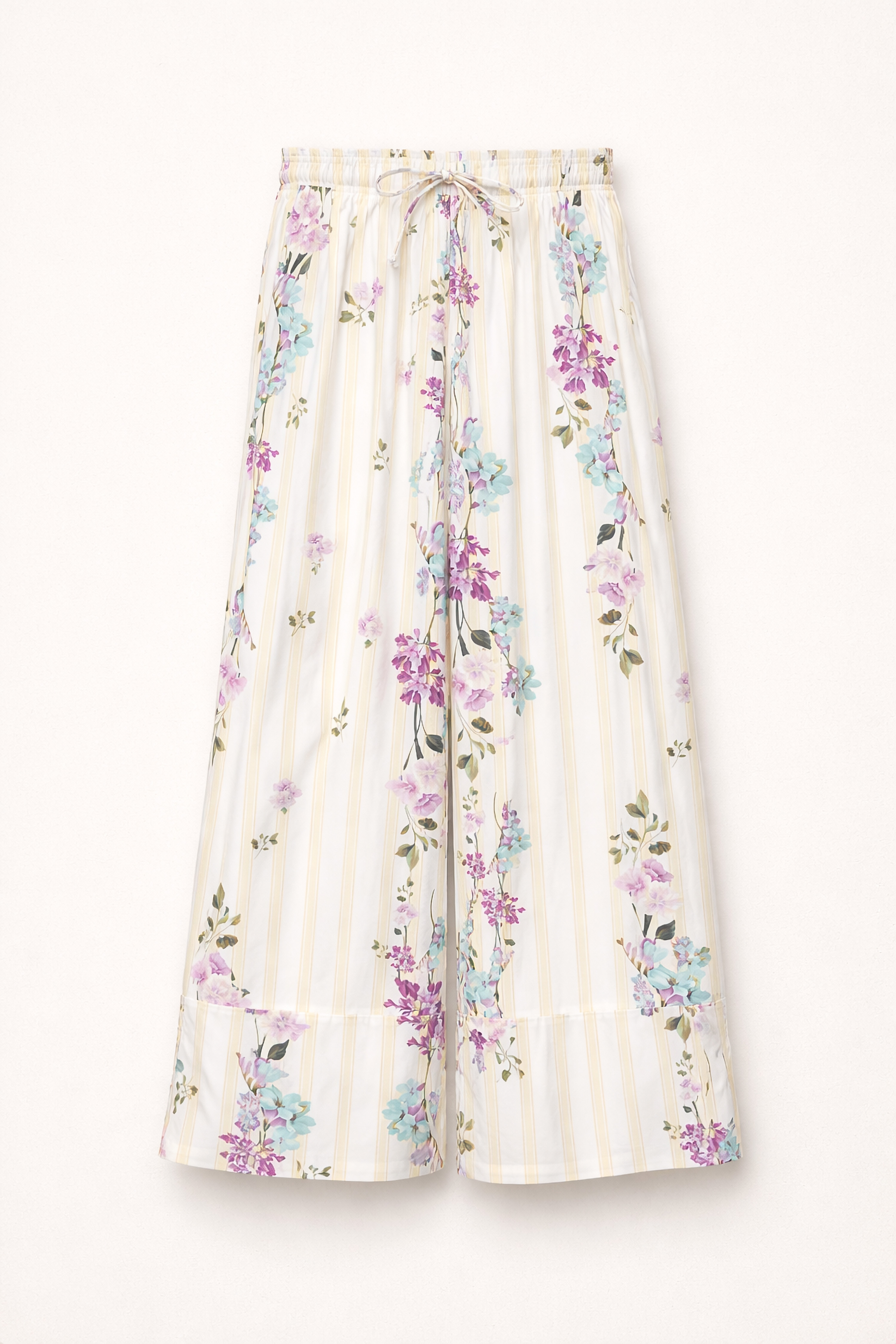 Pantaloni wide-leg a righe e stampa floreale.