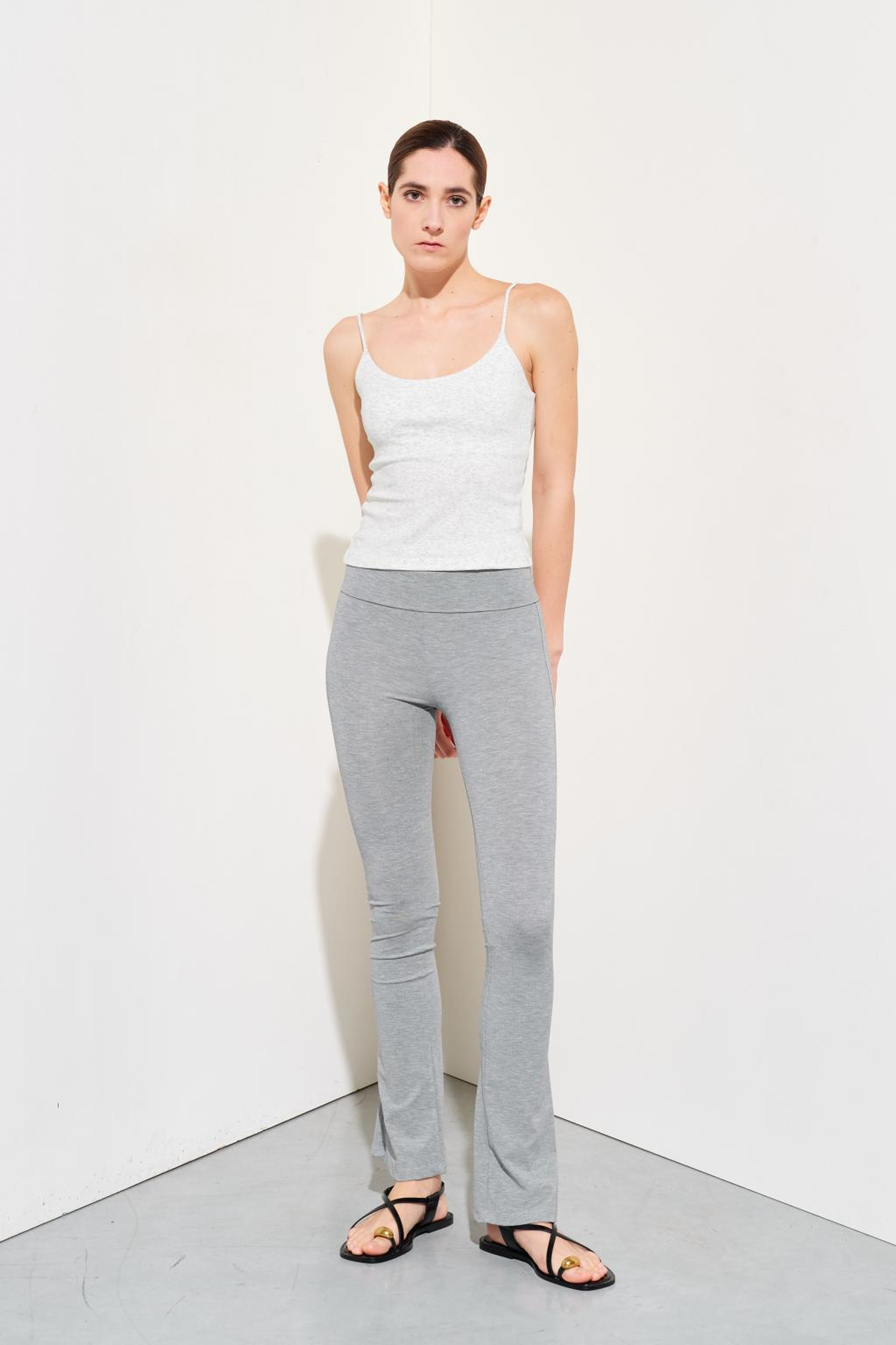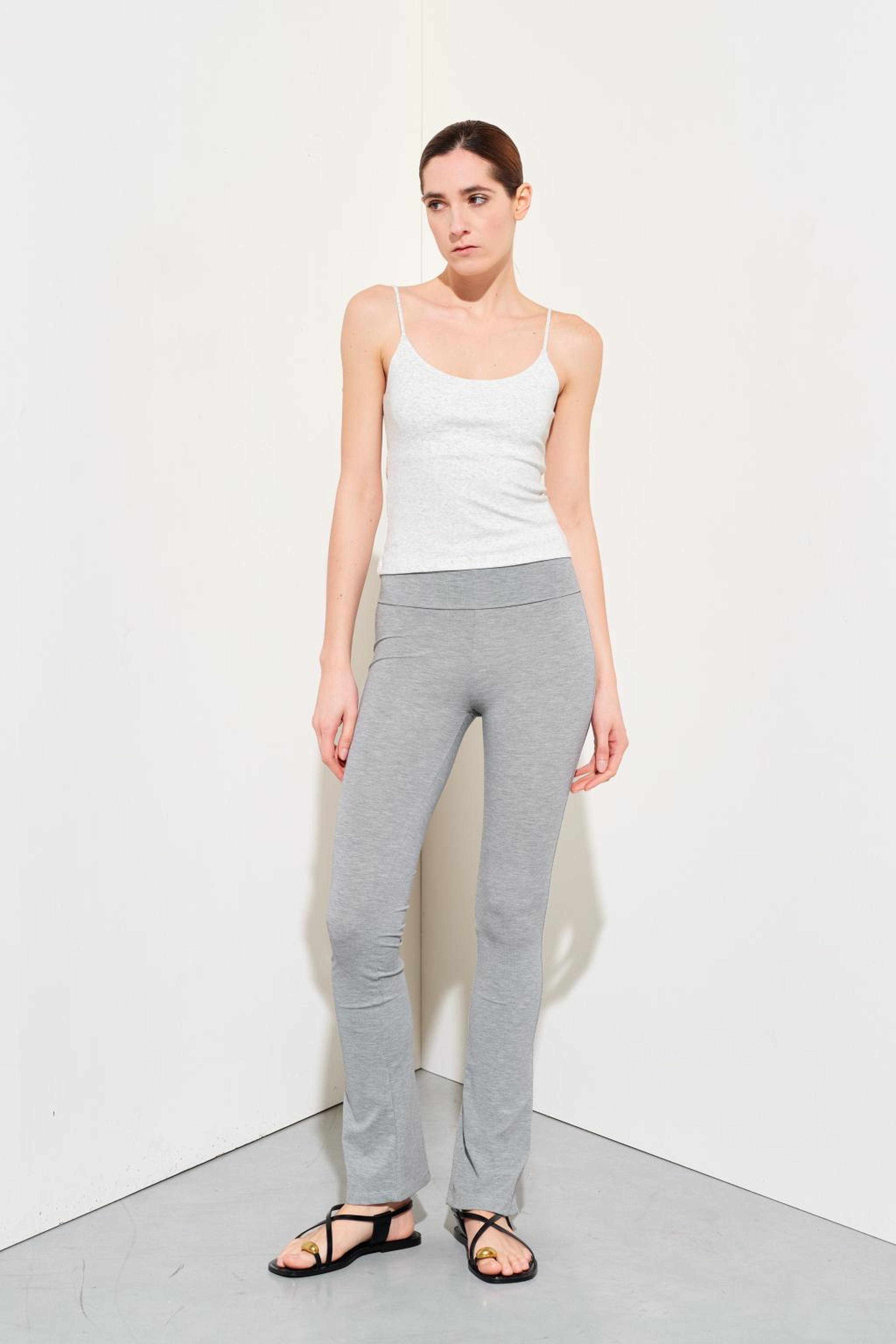 Pantaloni a vita alta con risvolto alla vita. Gamba a zampa.