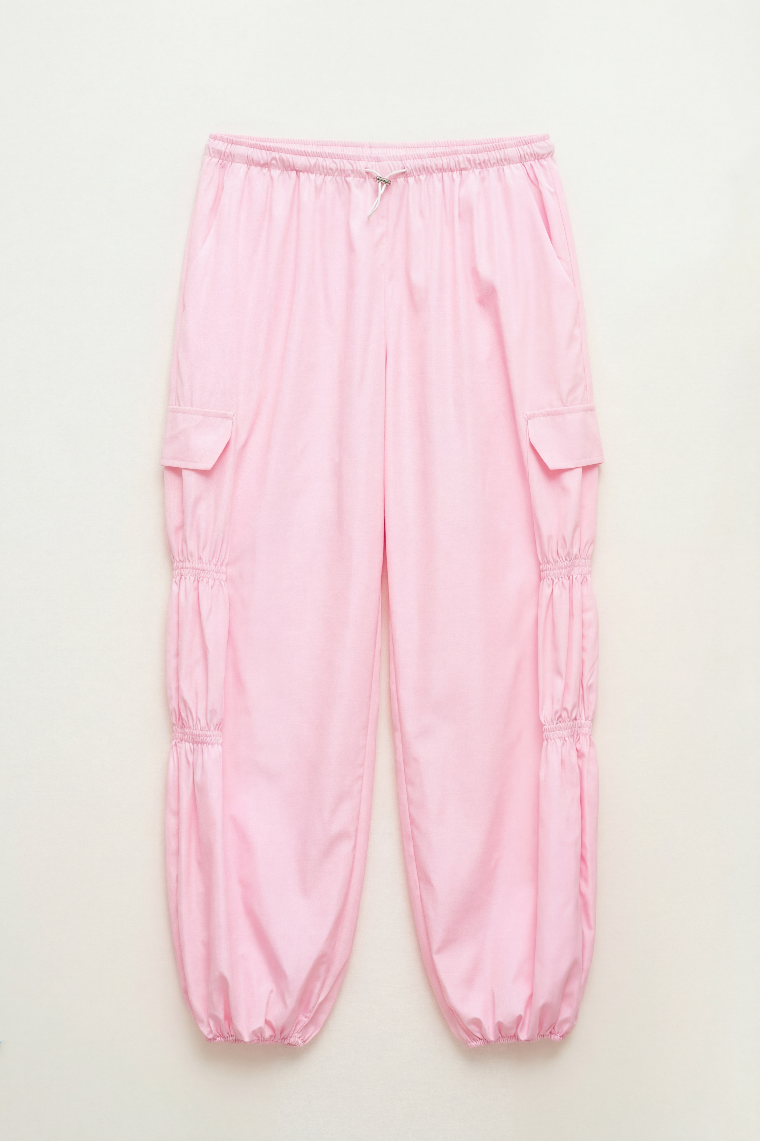 Inserti con arricciature sulle gambe. Fondo gamba con elastico.
