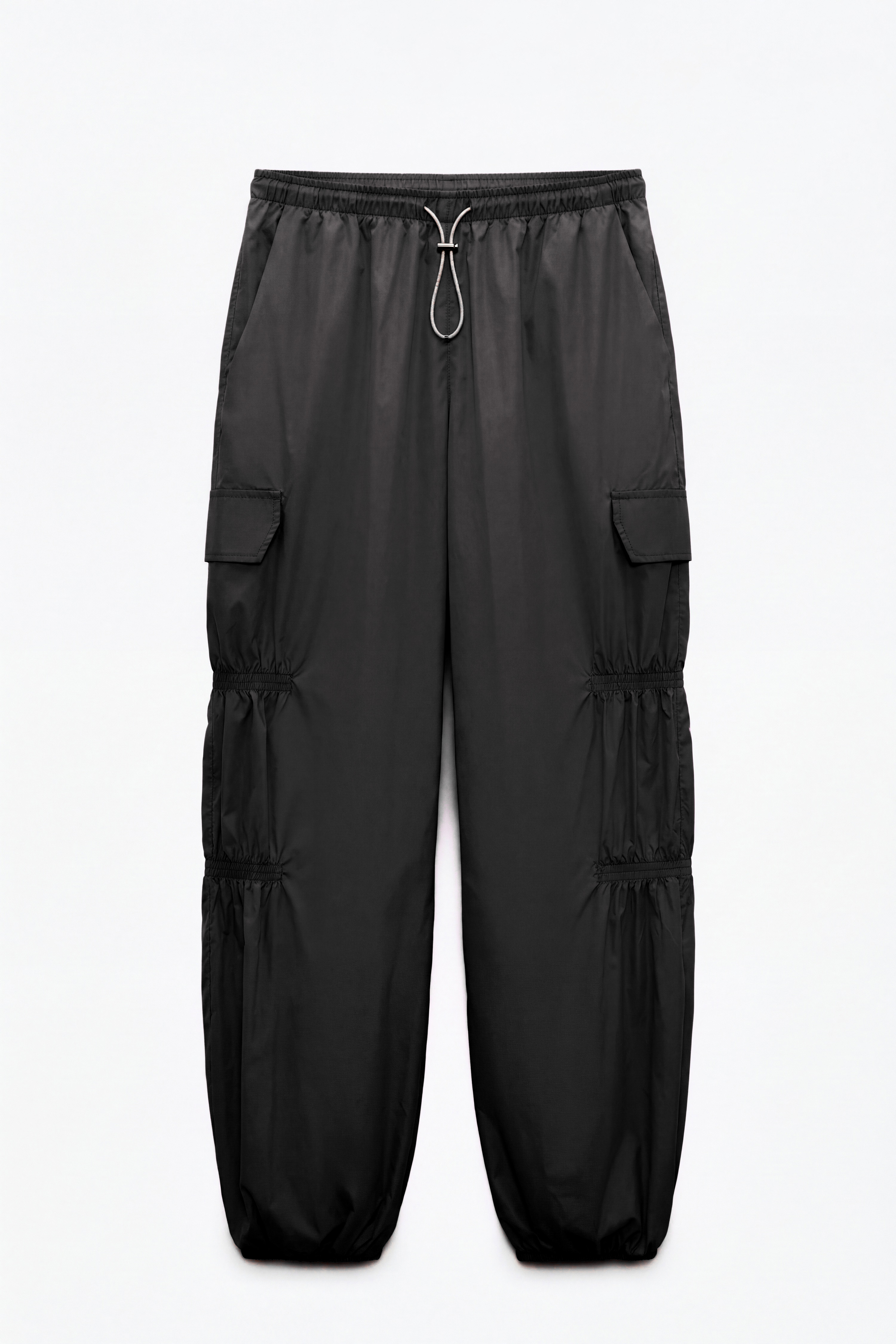 Inserti con arricciature sulle gambe. Fondo gamba con elastico.