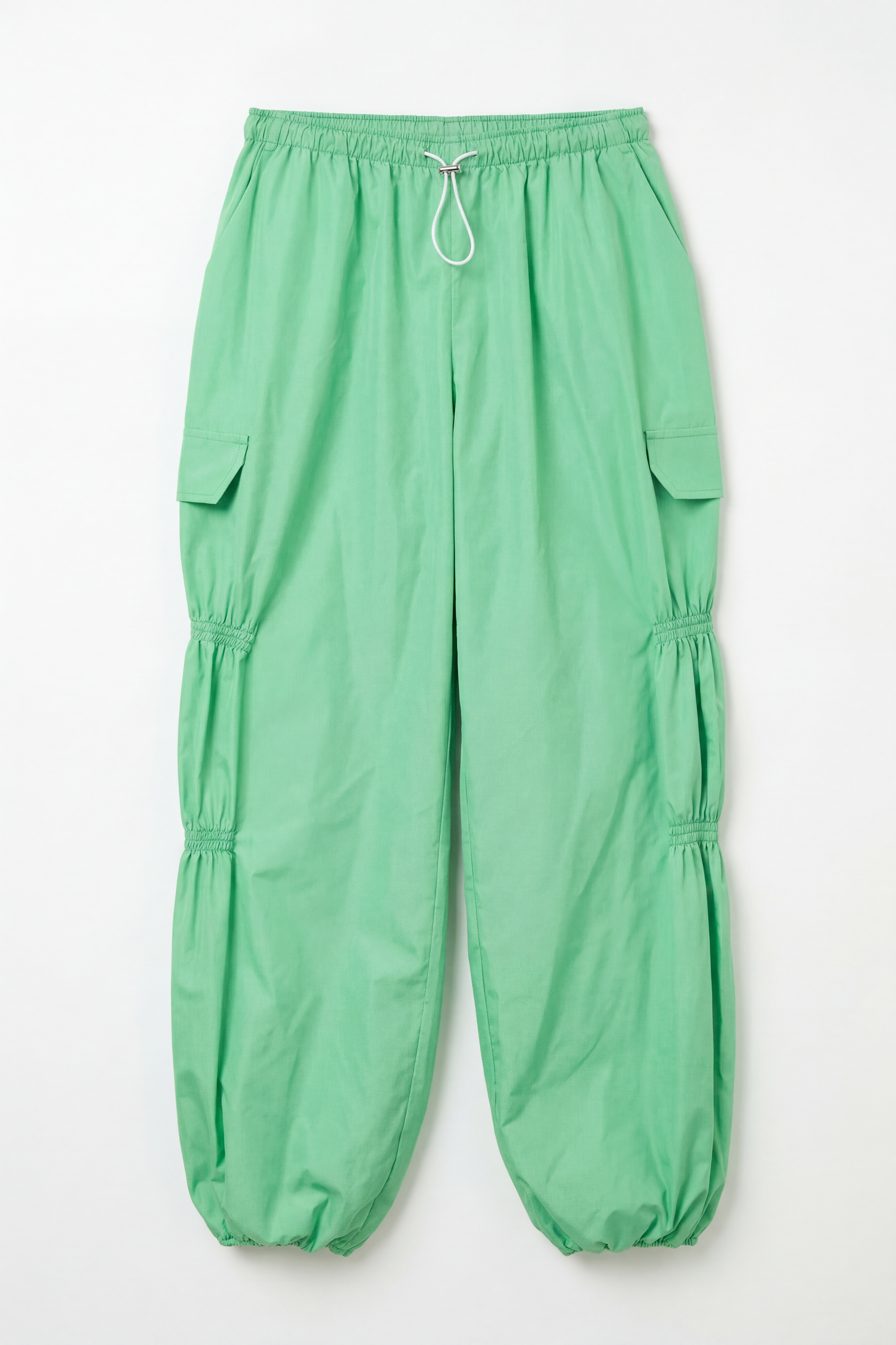 Inserti con arricciature sulle gambe. Fondo gamba con elastico.