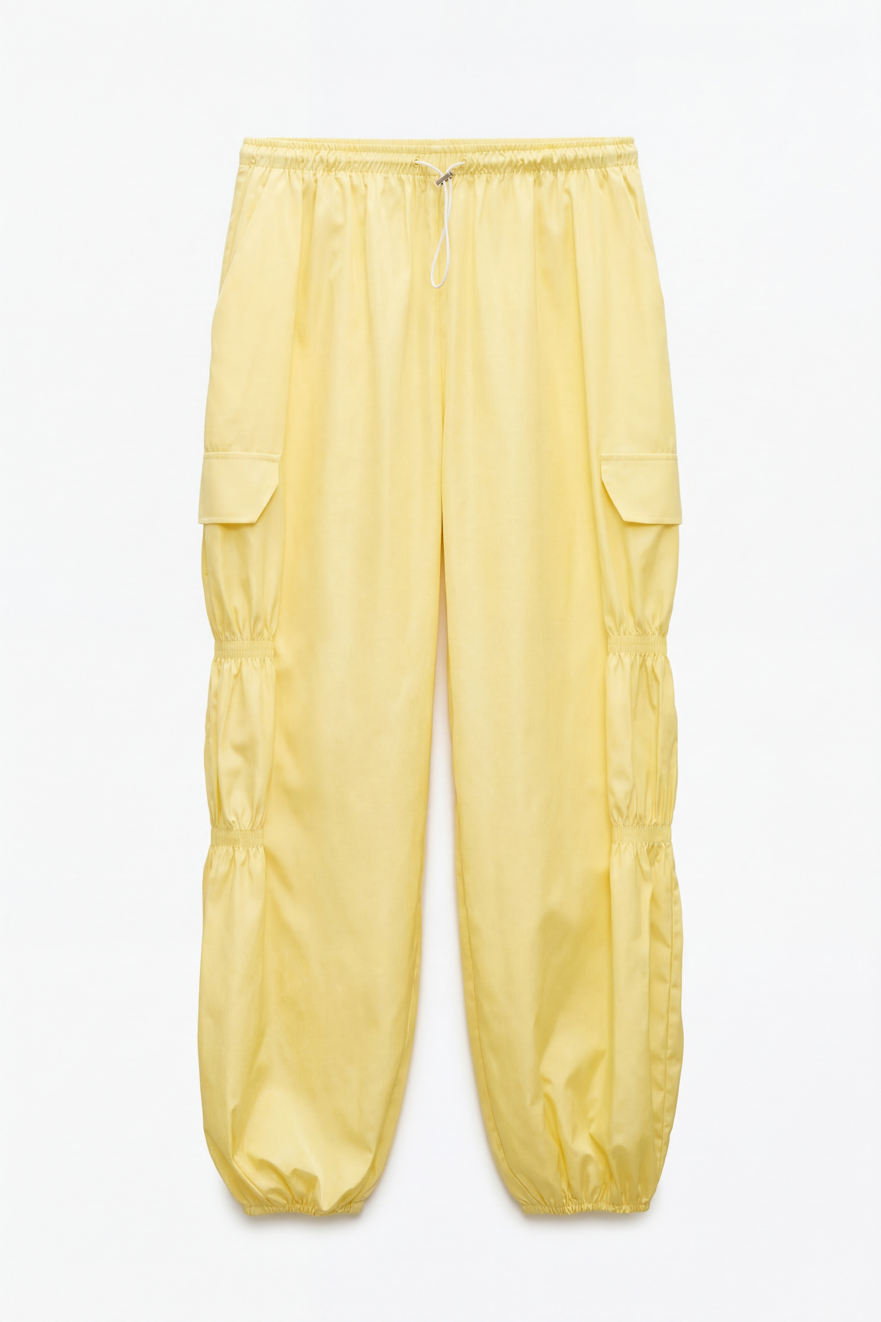 Inserti con arricciature sulle gambe. Fondo gamba con elastico.