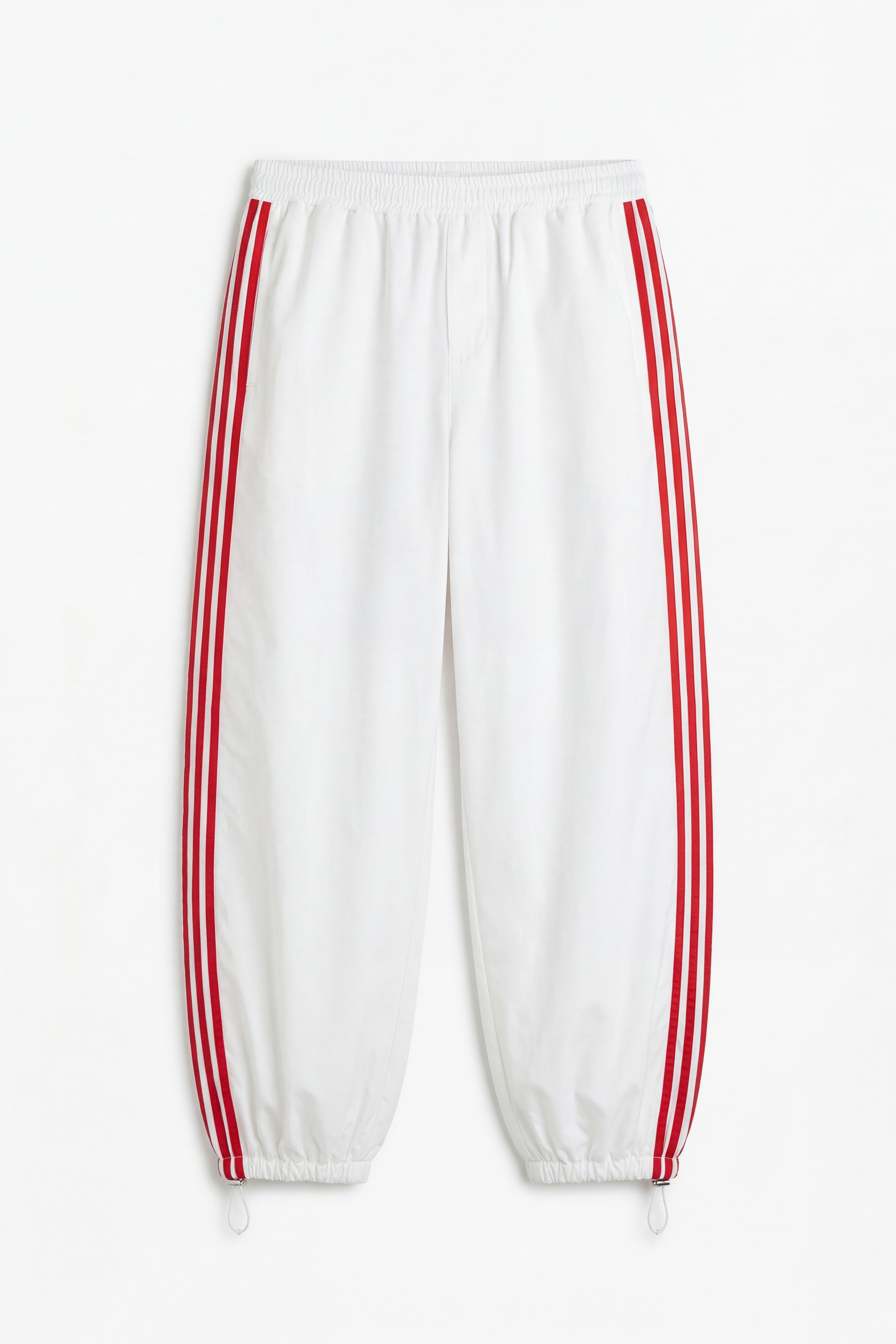 Pantaloni sportivi con bande laterali a contrasto. Vita elasticizzata. Tasche laterali inserite. Fondo gamba con elastico e laccetto regolabile. Vestibilità regolare, disponibile in taglia S/M, M/L.