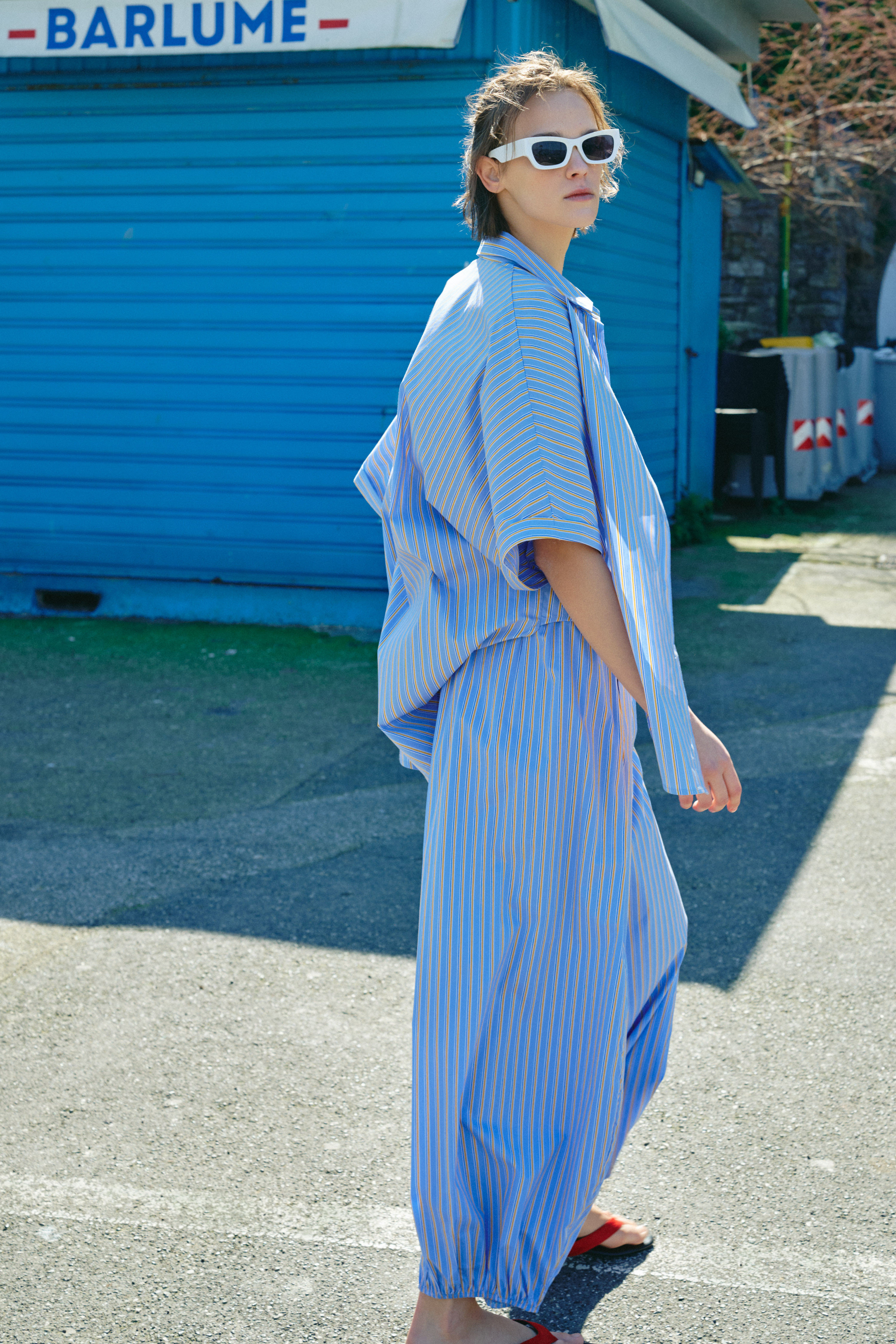 Pantaloni con fantasia a righe verticali.