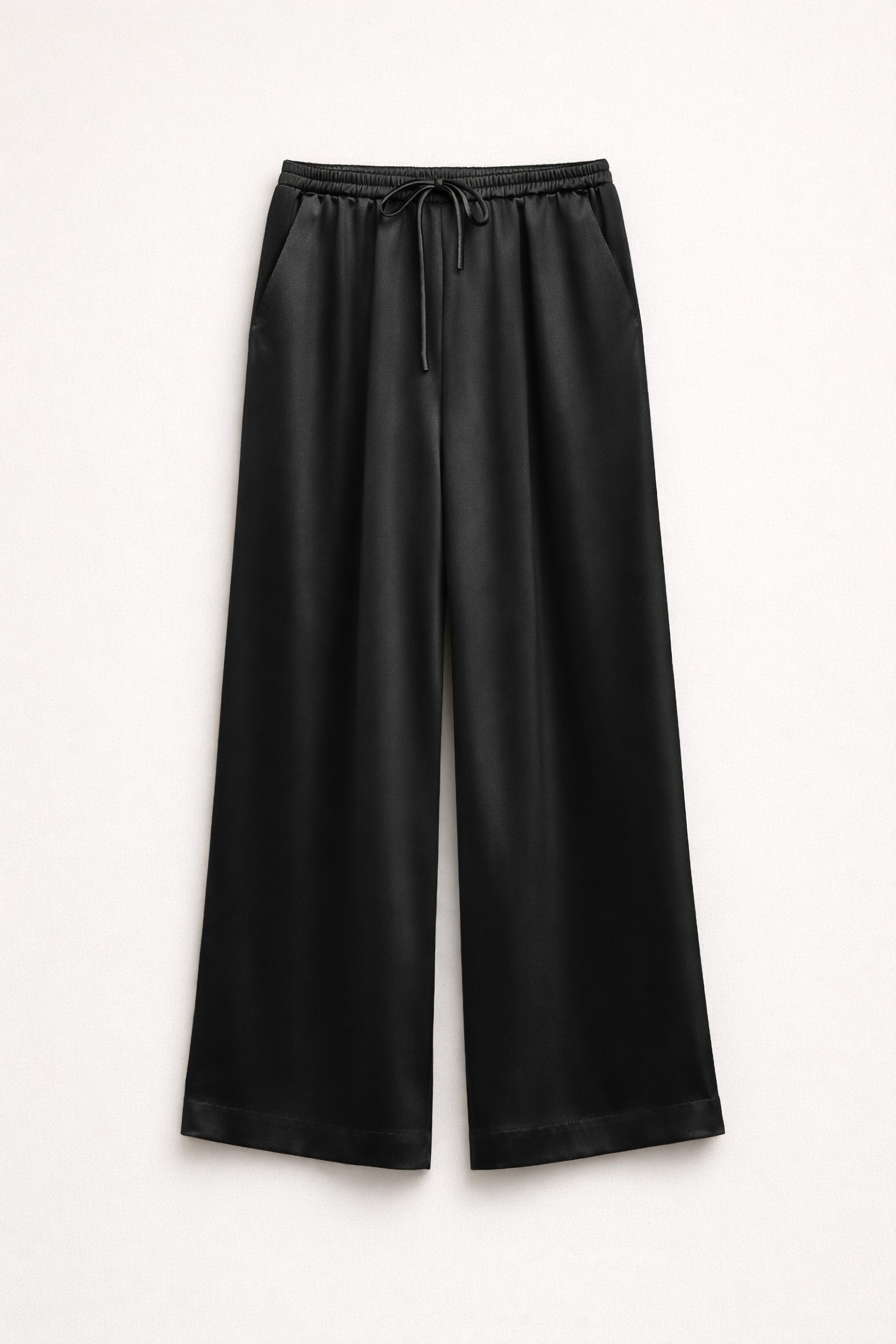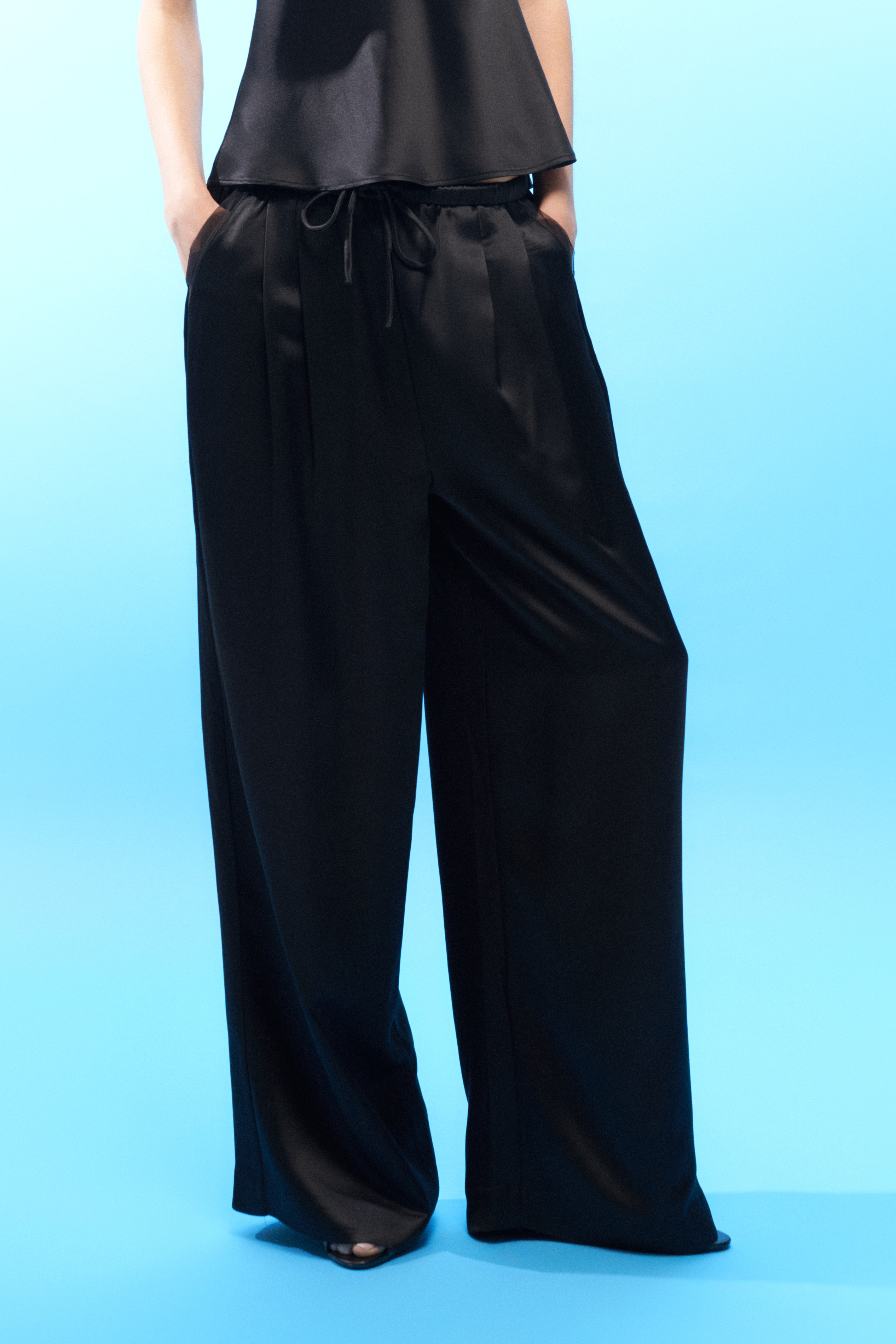 Pantaloni palazzo in raso fluido e satinato. Vita elasticizzata con arricciatura e coulisse regolabile. Pinces sul davanti. Tasche laterali inserite nei fianchi. Vestibilità regolare, disponibile in taglia S, M, L.