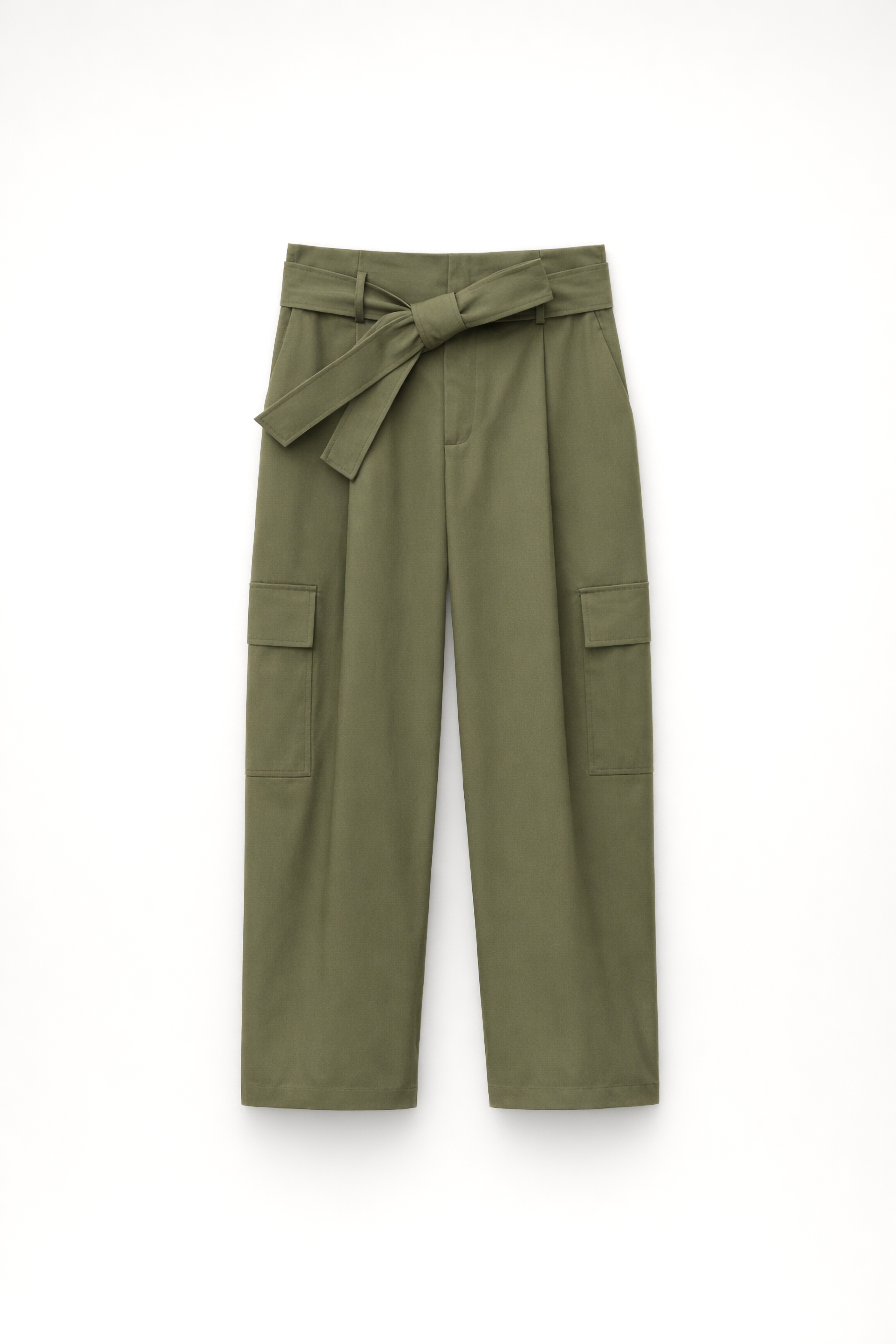 Pantaloni lunghi cargo in misto cotone. Vita alta con passanti e cintura coordinata. Tasche laterali inserite e tasche cargo applicate. Fondo regolabile con linguetta e bottone. Chiusura frontale con cerniera, gancio e bottone. Vestibilità regolare, disponibile in taglia S, M, L.