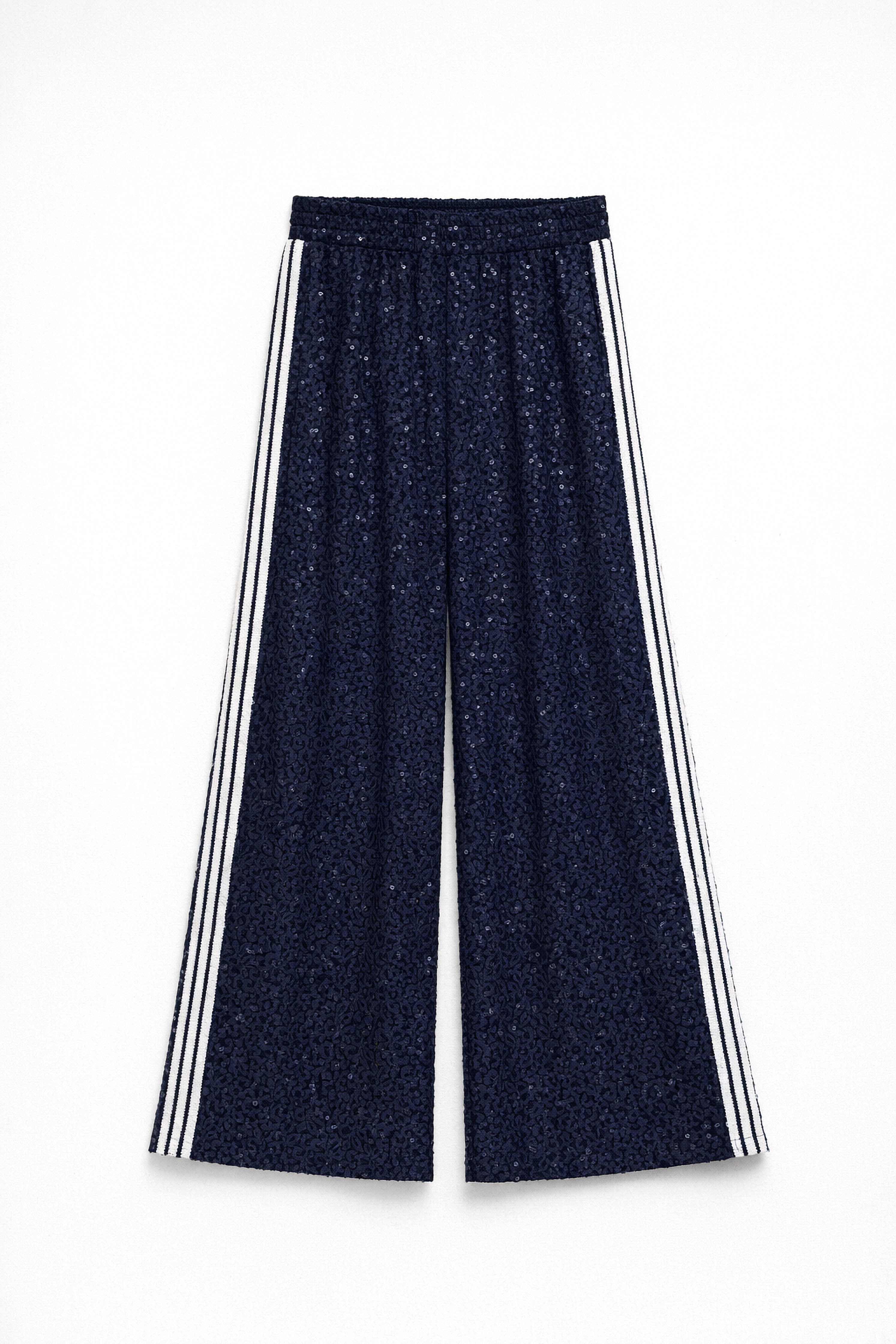 Pantaloni in pizzo floreale con inserti in paillettes. Vita elasticizzata. Gamba ampia. Fodera interna. Dettagli laterali con bande verticali sportivi a constrasto. Vestibilità regolare, disponibile in taglia S/M, M/L.