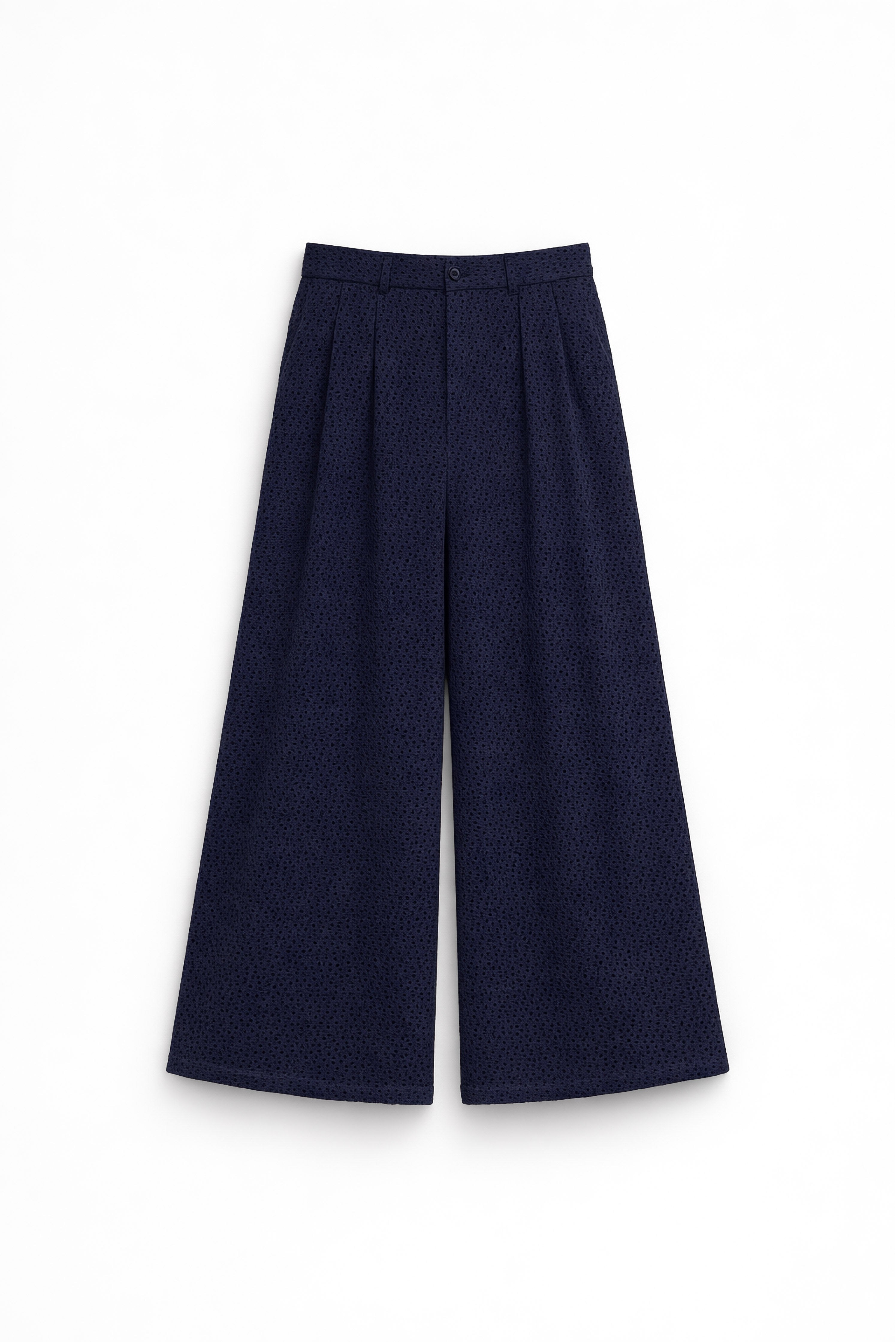 Pantaloni palazzo in sangallo traforato con fodera interna. Vita alta con passanti per cintura. Pinces frontali. Tasche laterali inserite. Tasche posteriori applicate. Chiusura frontale con cerniera, doppio gancio e bottone. Vestibilità regolare, disponibile in taglia S, M, L.
