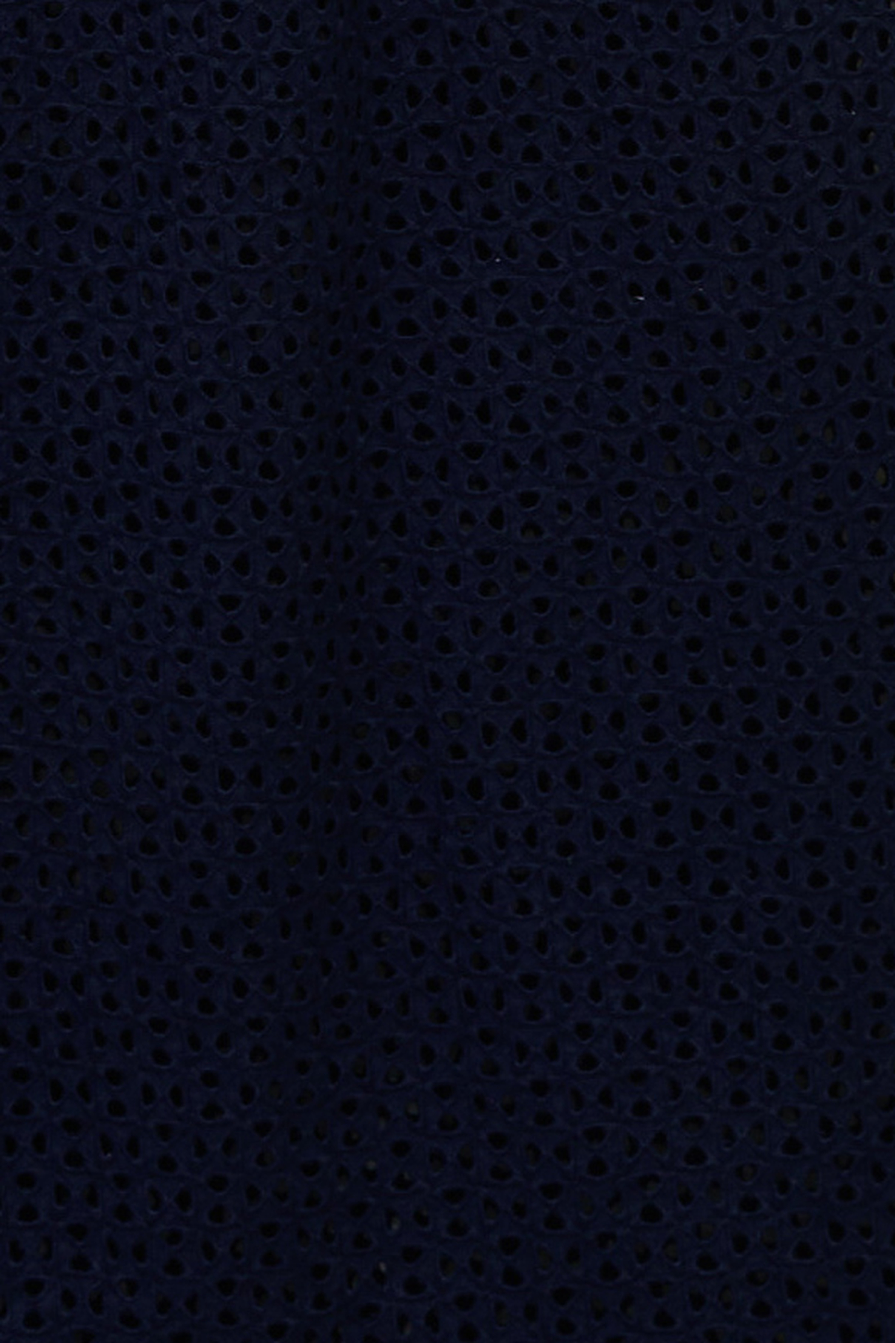 Camicia in sangallo traforato 100% cotone. Colletto a punta. Maniche a tre quarti con risvolto. Chiusura frontale con bottoni tono su tono. Vestibilità regolare, disponibile in taglia S, M, L.