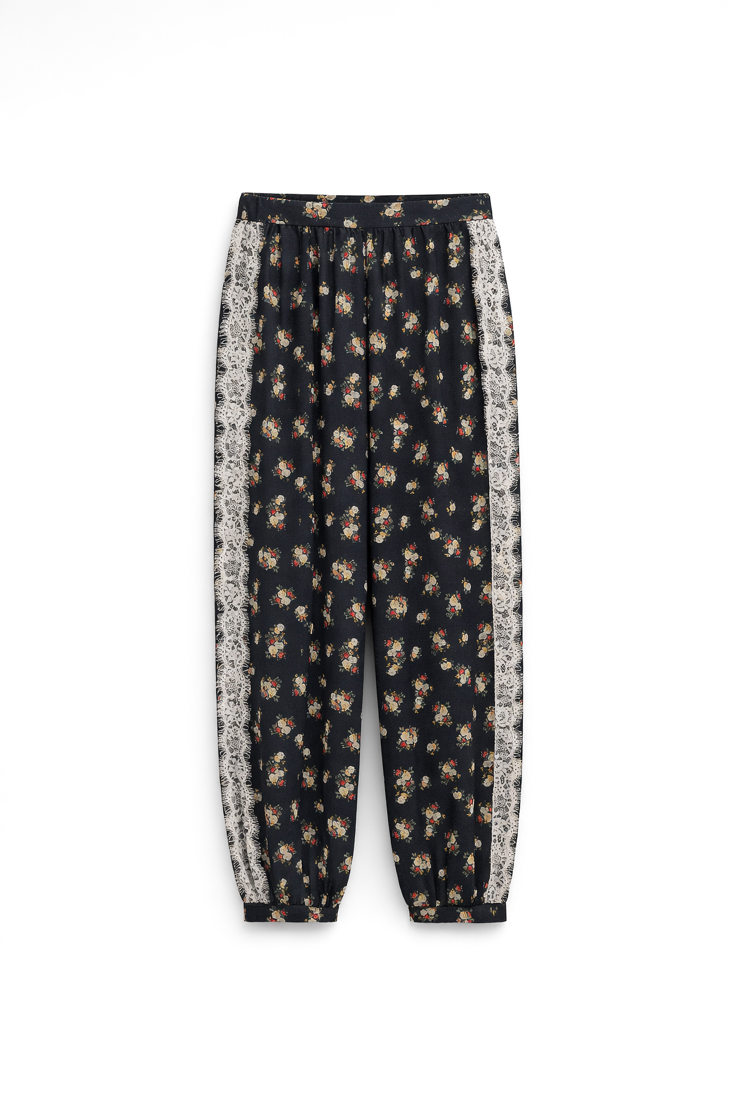 Pantaloni con stampa floreale all-over. Tessuto semitrasparente con fodera interna. Vita elasticizzata con arricciatura sul retro. Dettaglio inserti laterali in pizzo floreale. Fondo gamba con costruzione a ballooon. Vestibilità regolare, disponibile in taglia S/M, M/L.