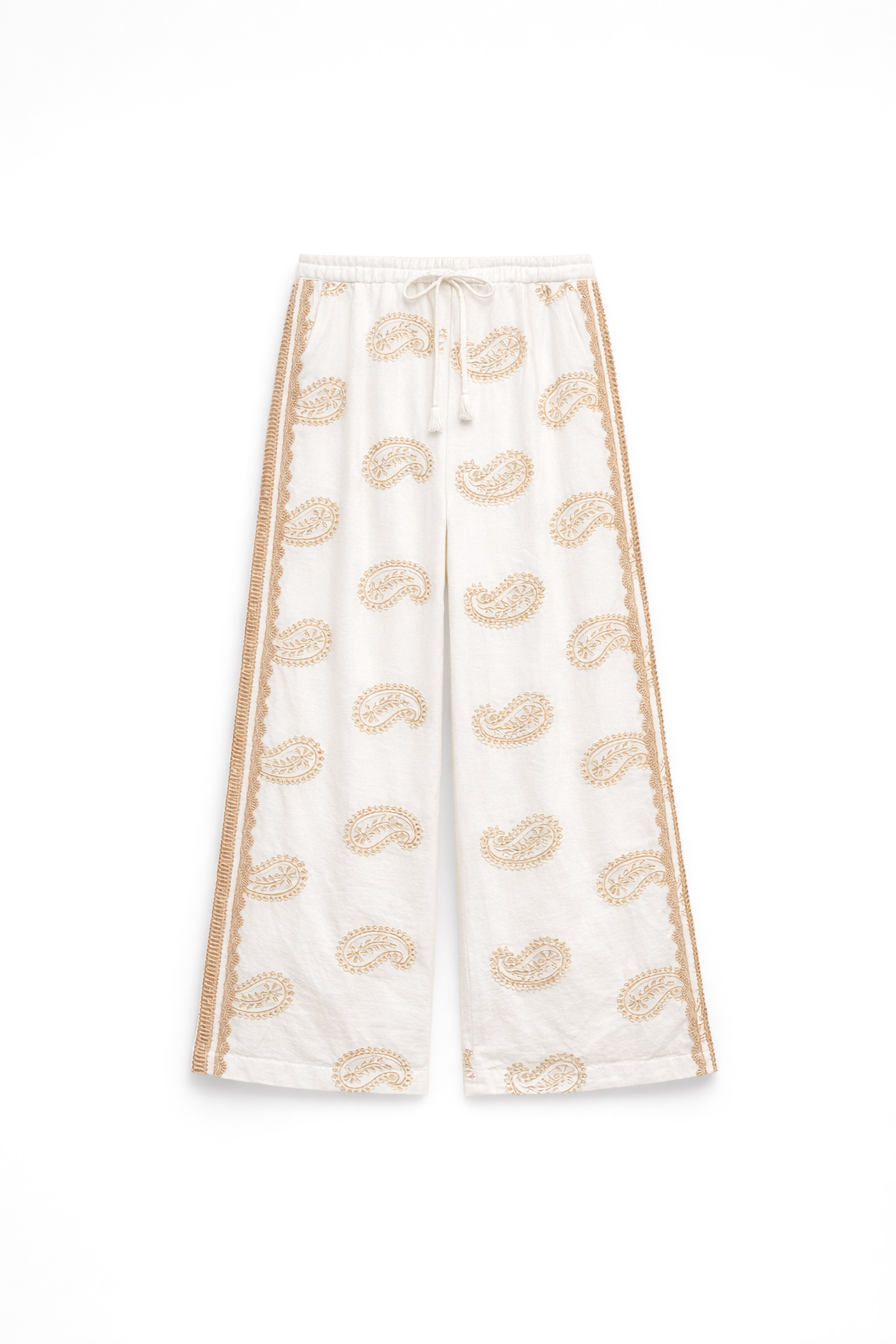 Pantaloni in misto lino con ricami paisley all-over. Vita elasticizzata con coulisse regolabile. Inserti laterali in crochet con lavorazione traforata. Tasche laterali inserite. Gamba ampia e fluida. Vestibilità regolare, disponibile in taglia S/M, M/L.