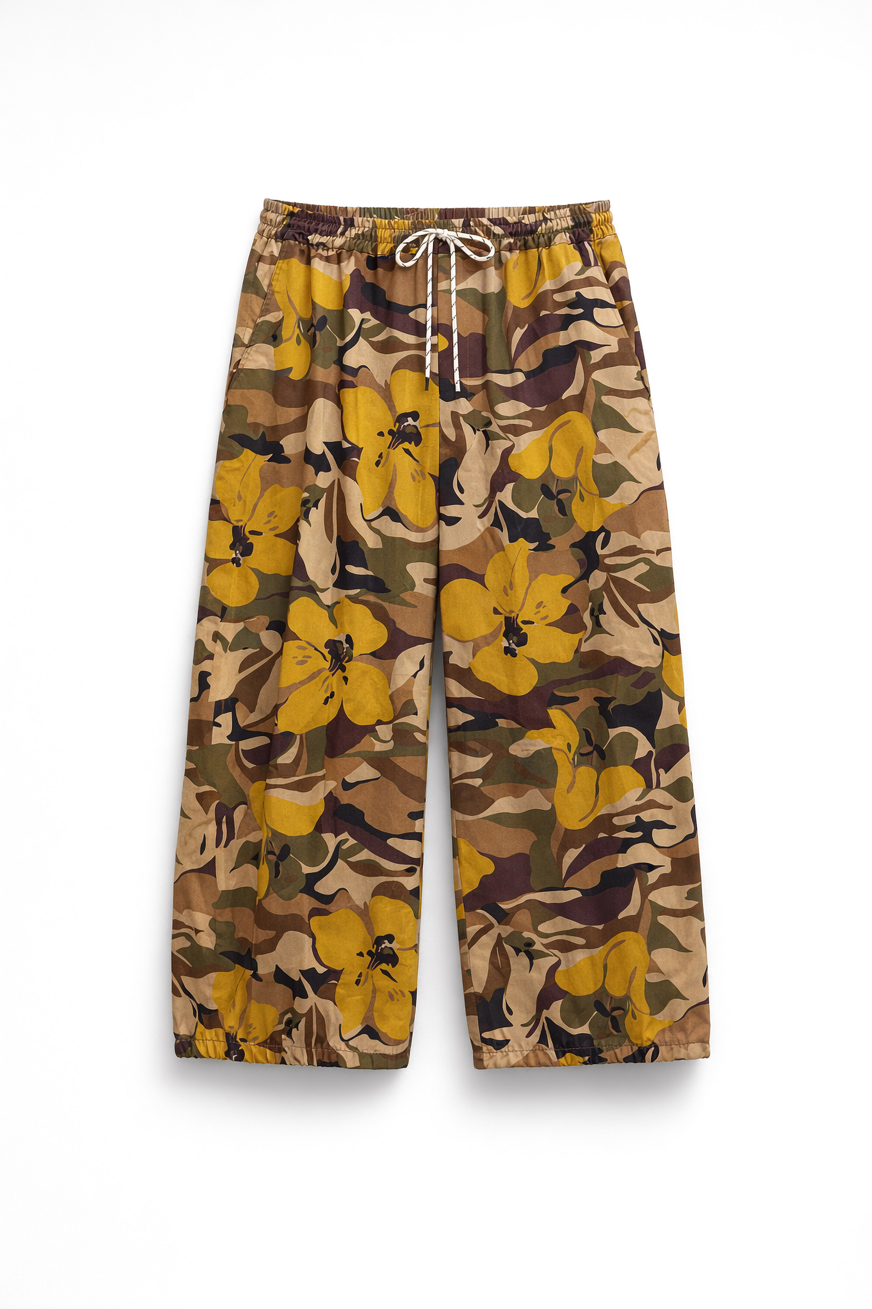 Pantaloni wide-leg con stampa floreale all-over. Vita elasticizzata con volant. Tasche laterali funzionali. Fondo gamba con coulisse e stopper regolabile. Vestibilità regolare, disponibile in taglia S/M, M/L.