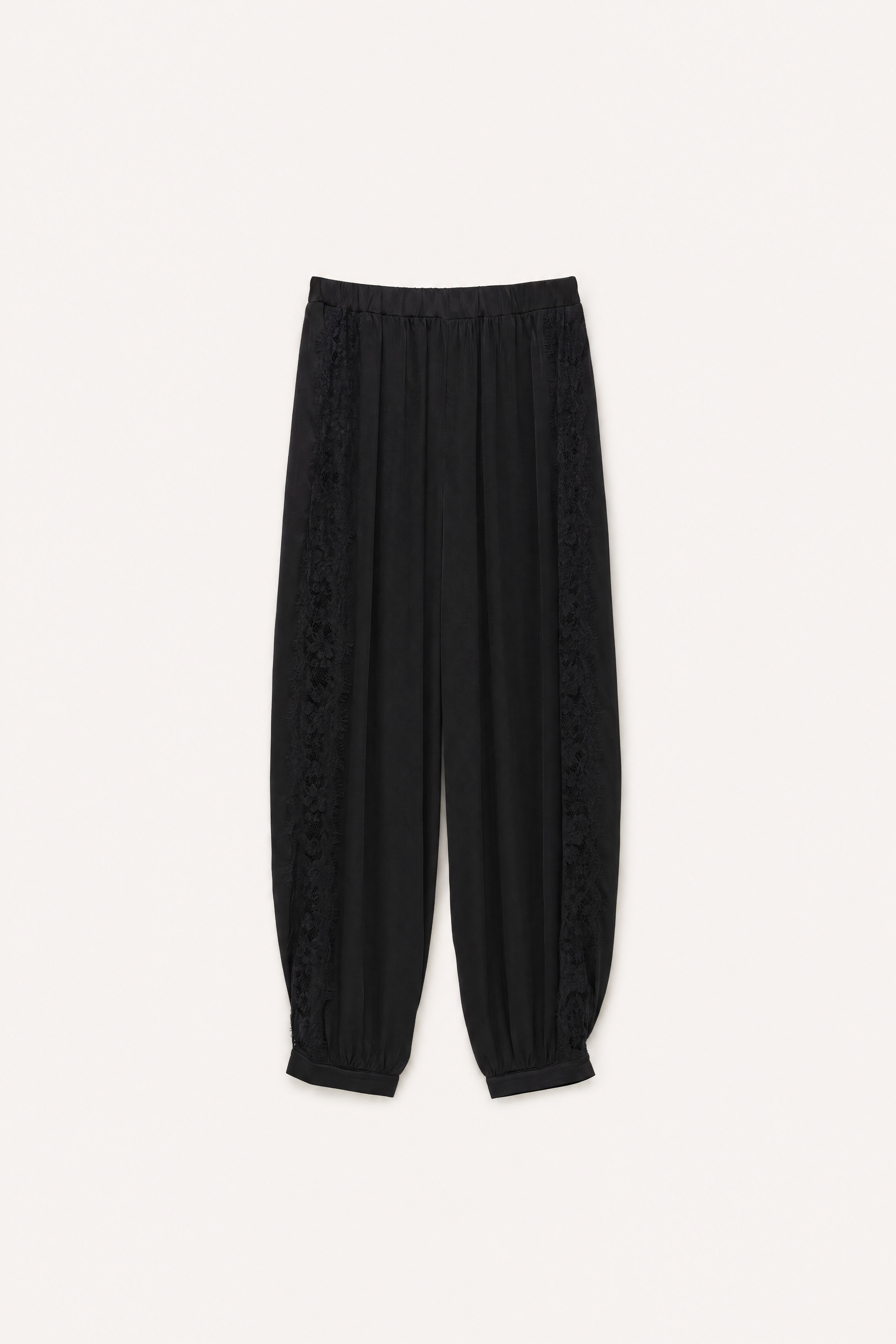 Pantaloni in tessuto fluido e satinato. Vita elasticizzata per massimo comfort. Inserti laterali in pizzo floreale trasparente. Fondo gamba arricciato. Linea morbida. Vestibilità regolare, disponibile in taglia S/M, M/L.